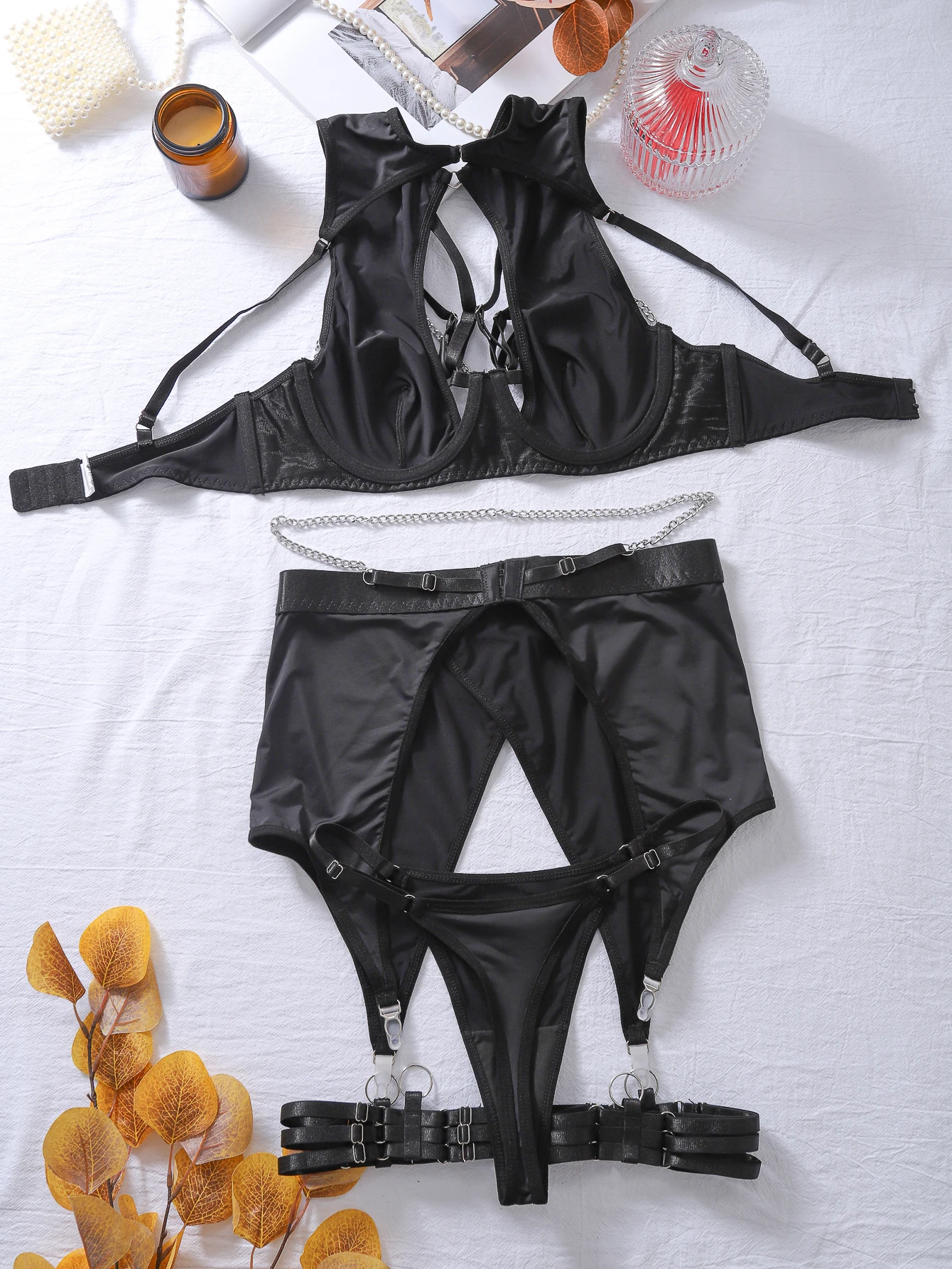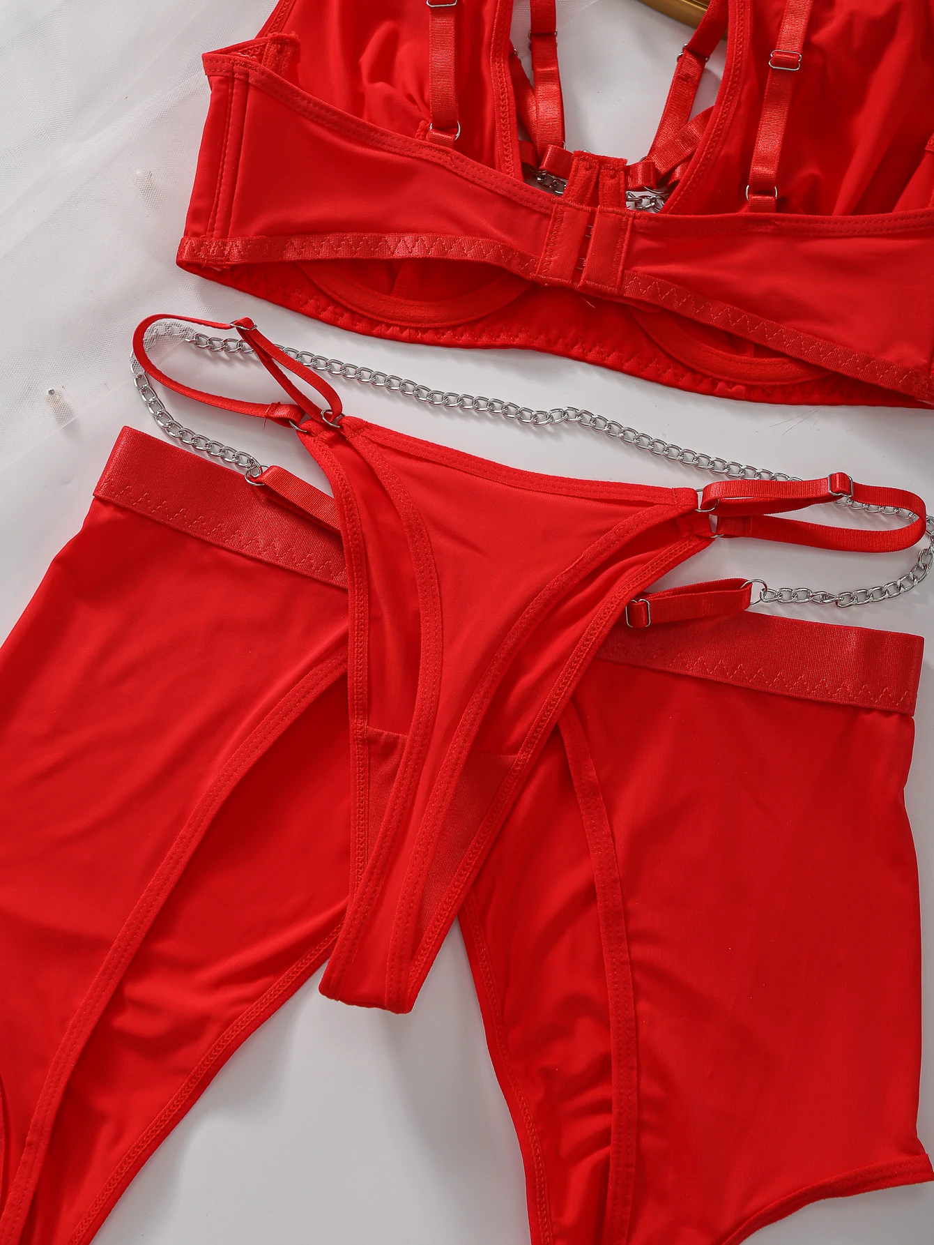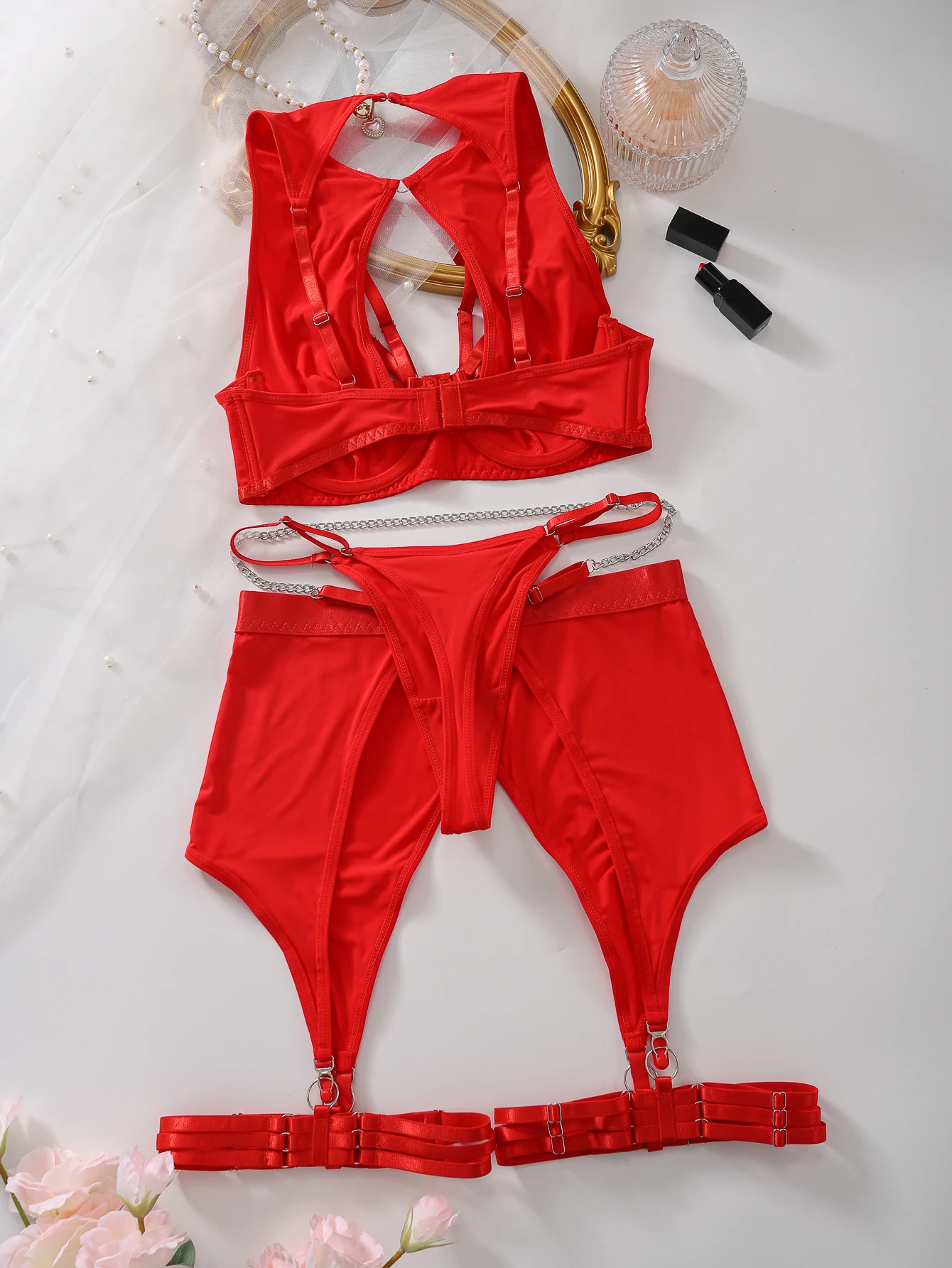 2024 Netflix Explosion Models Women’s Fashion Sexy Chain Steel Ring Gathered Lingerie Plus Garter Belt Set Erotic 4-piece Set