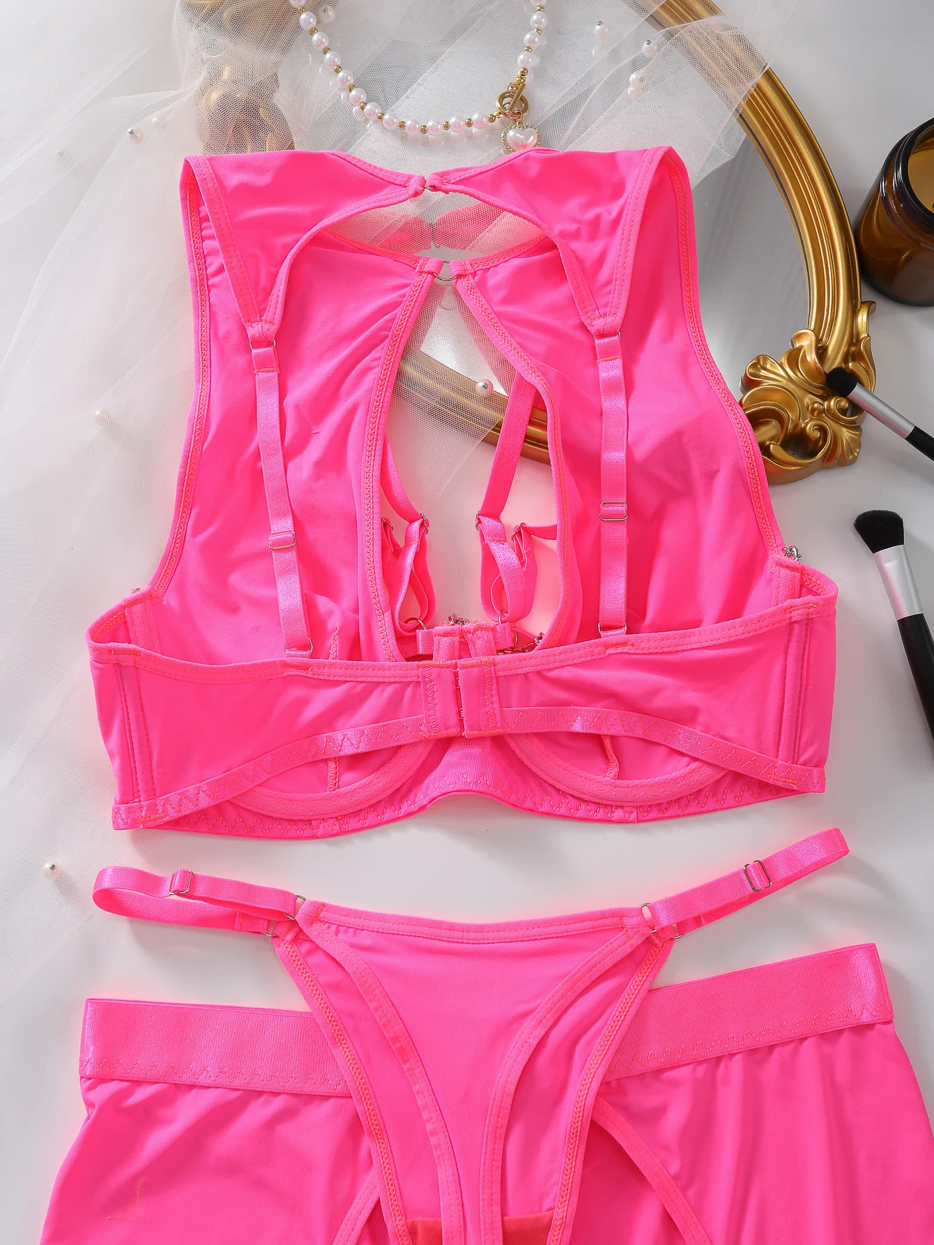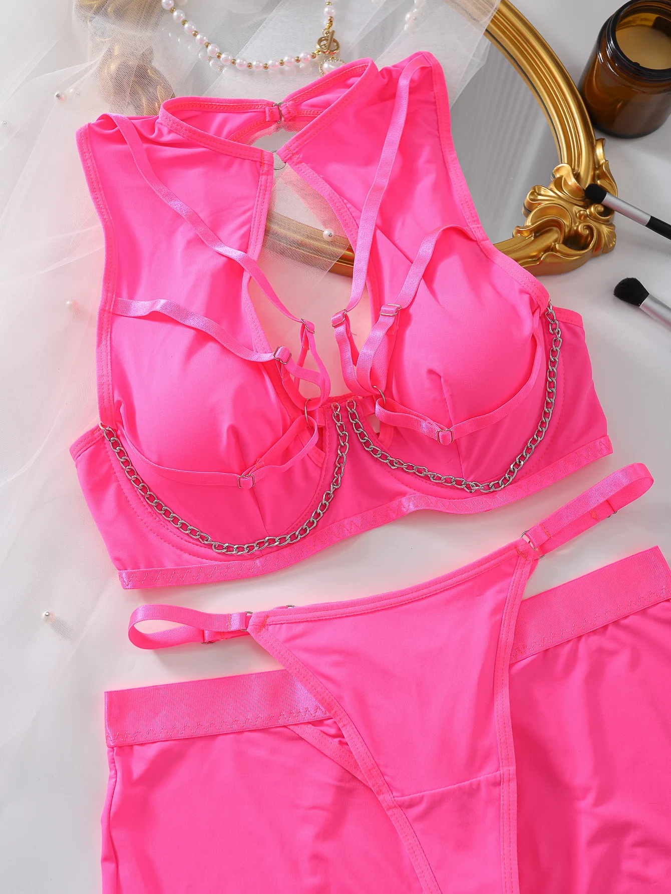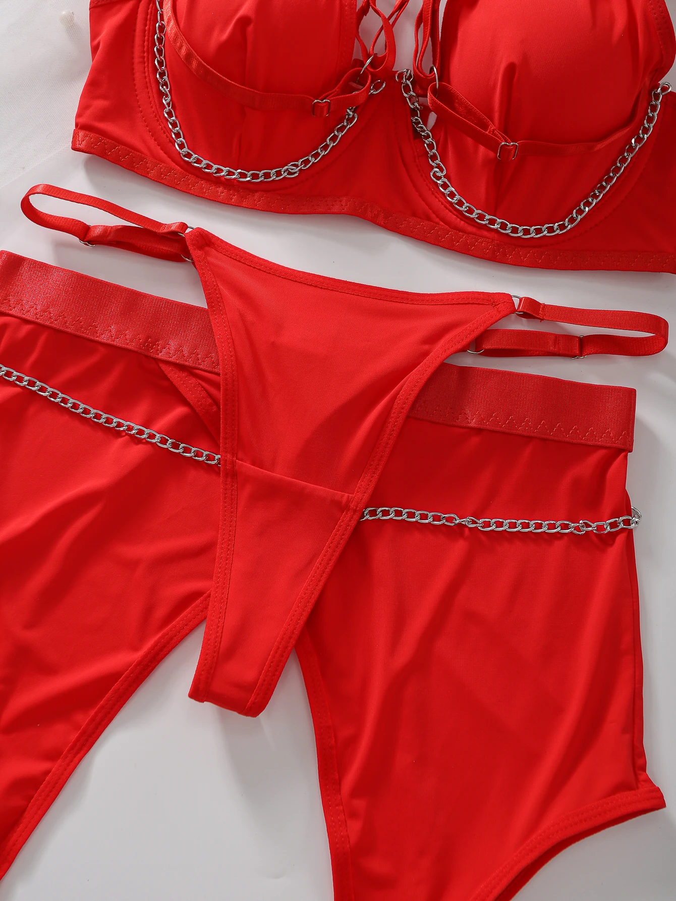 2024 Netflix Explosion Models Women’s Fashion Sexy Chain Steel Ring Gathered Lingerie Plus Garter Belt Set Erotic 4-piece Set
