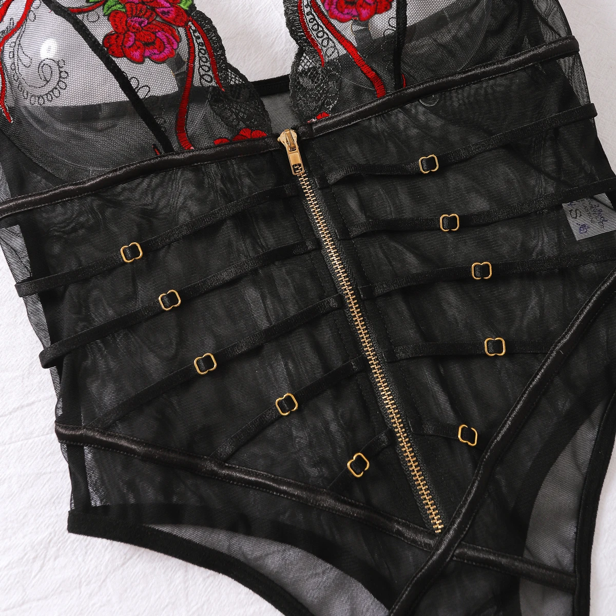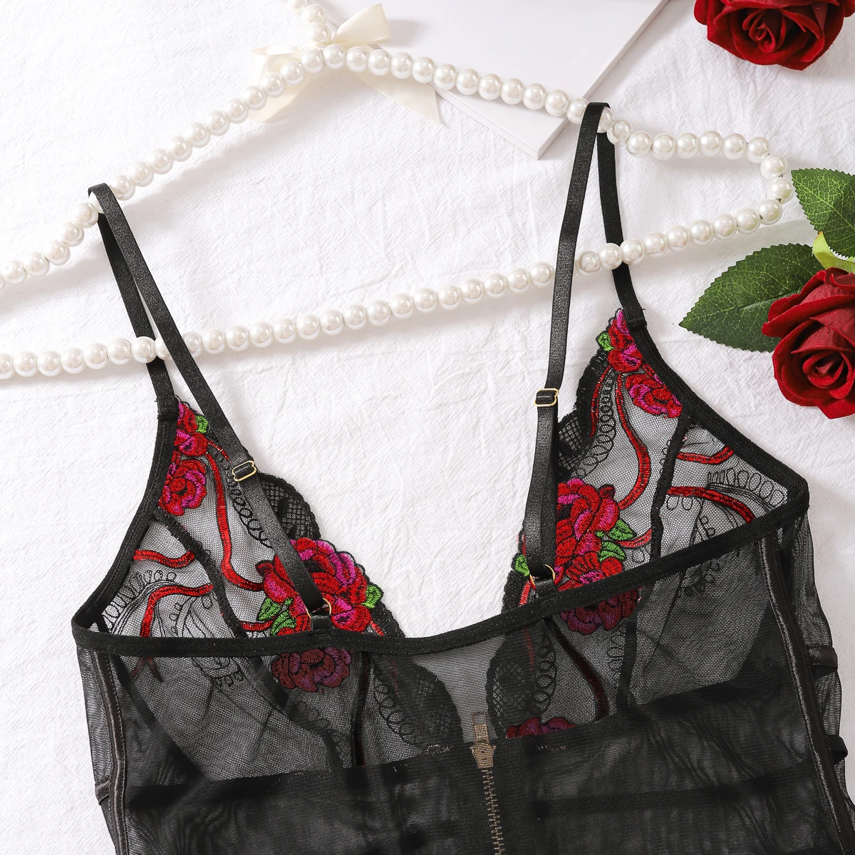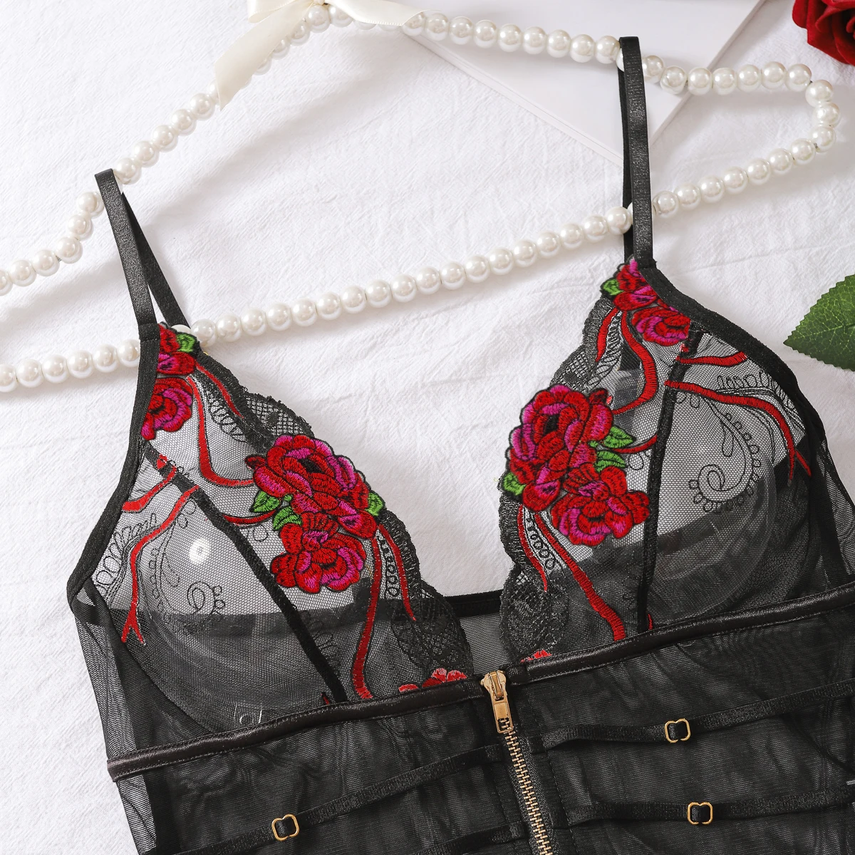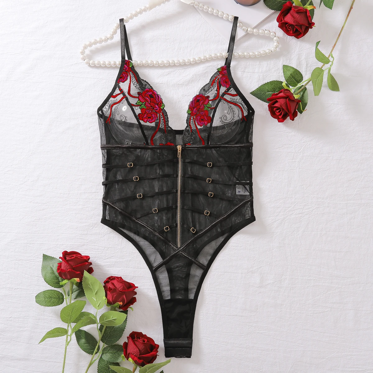 2024 New Fashionable and Sexy Lace Mesh Embroidered Transparent V-neck Mischievous Temptation Style Strap jumpsuit