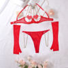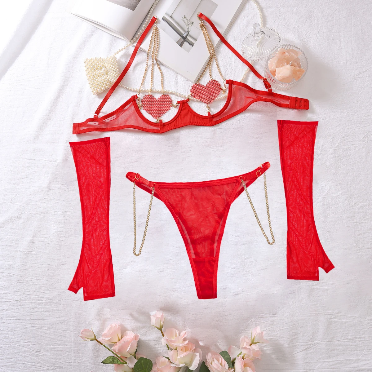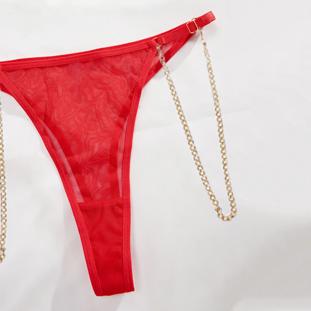 2024 Red Sexy See-through Mesh Hollowed Out Heart Patch Metal Chain Bra Set Ladies Sexy Lingerie Panties three-piece Set