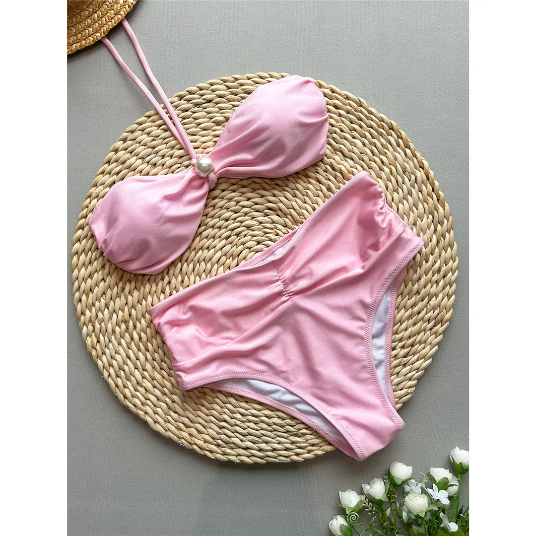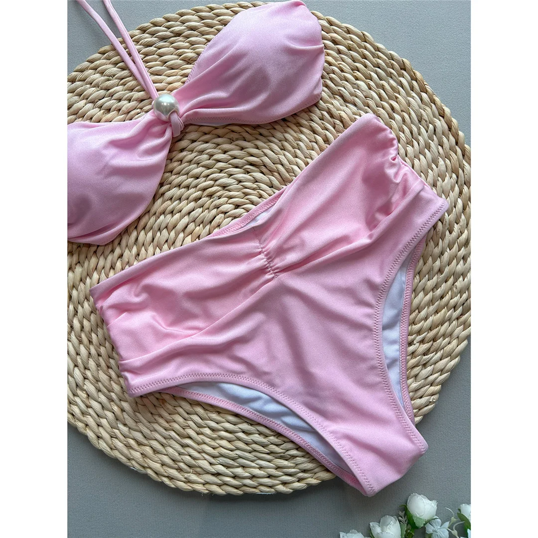 2025 Halter Pearl Female Swimsuit High Waist Bikini Women Swimwear Two-pieces Bikini set Padded Bather Bathing Suit Swim V6885