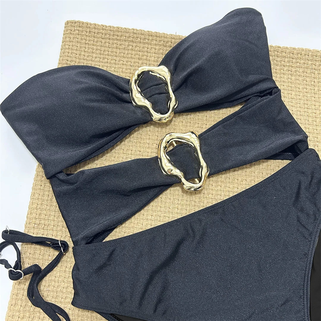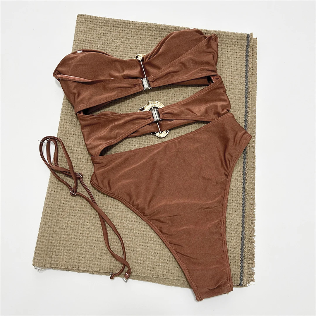 3 Colors Sexy Metal Rings Cut Out Women Swimwear One Piece Swimsuit Female Bandeau High Leg Cut Bather Bathing Suit Swim V5931