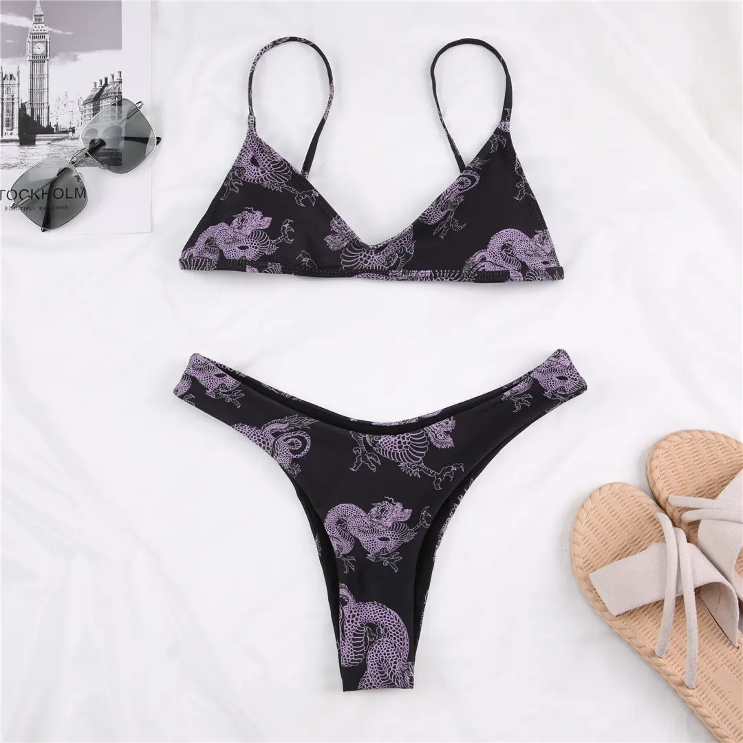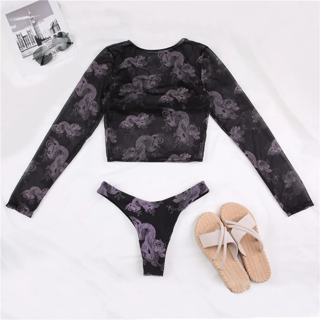 3 PCS Dragon Printed Bikini Women Swimwear Female Swimsuit Three-Pieces Bikini Set Long Sleeve Thong Bather Bathing Suit V2693