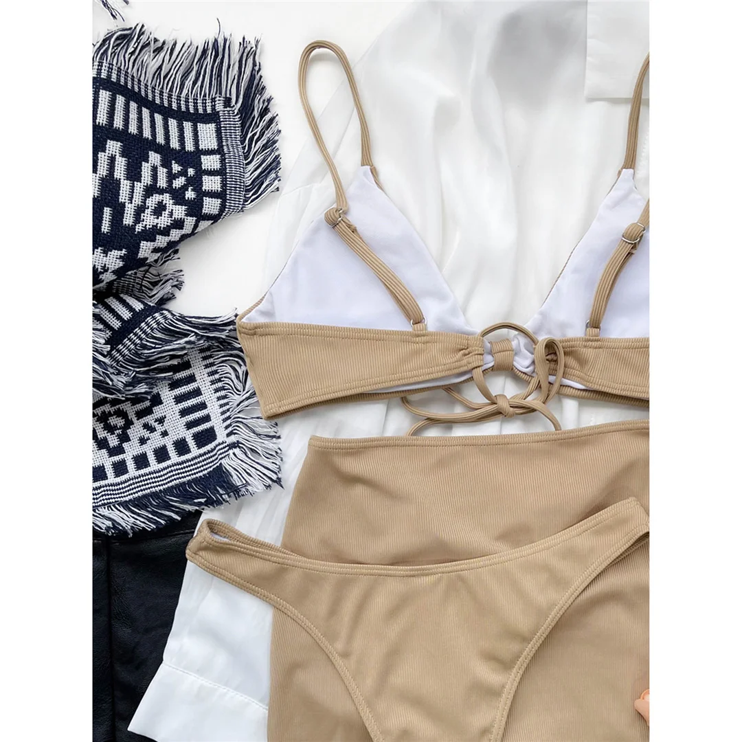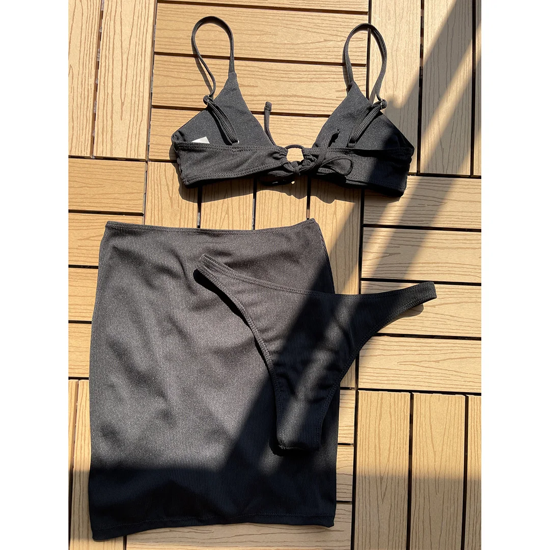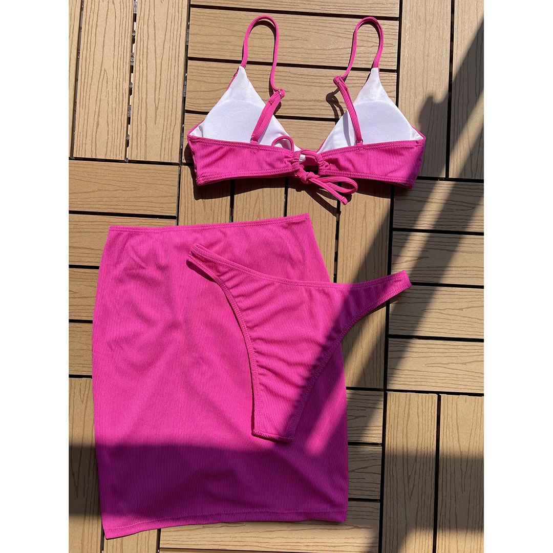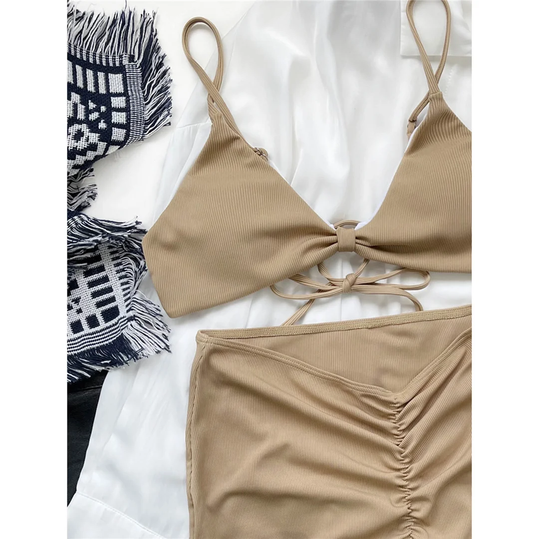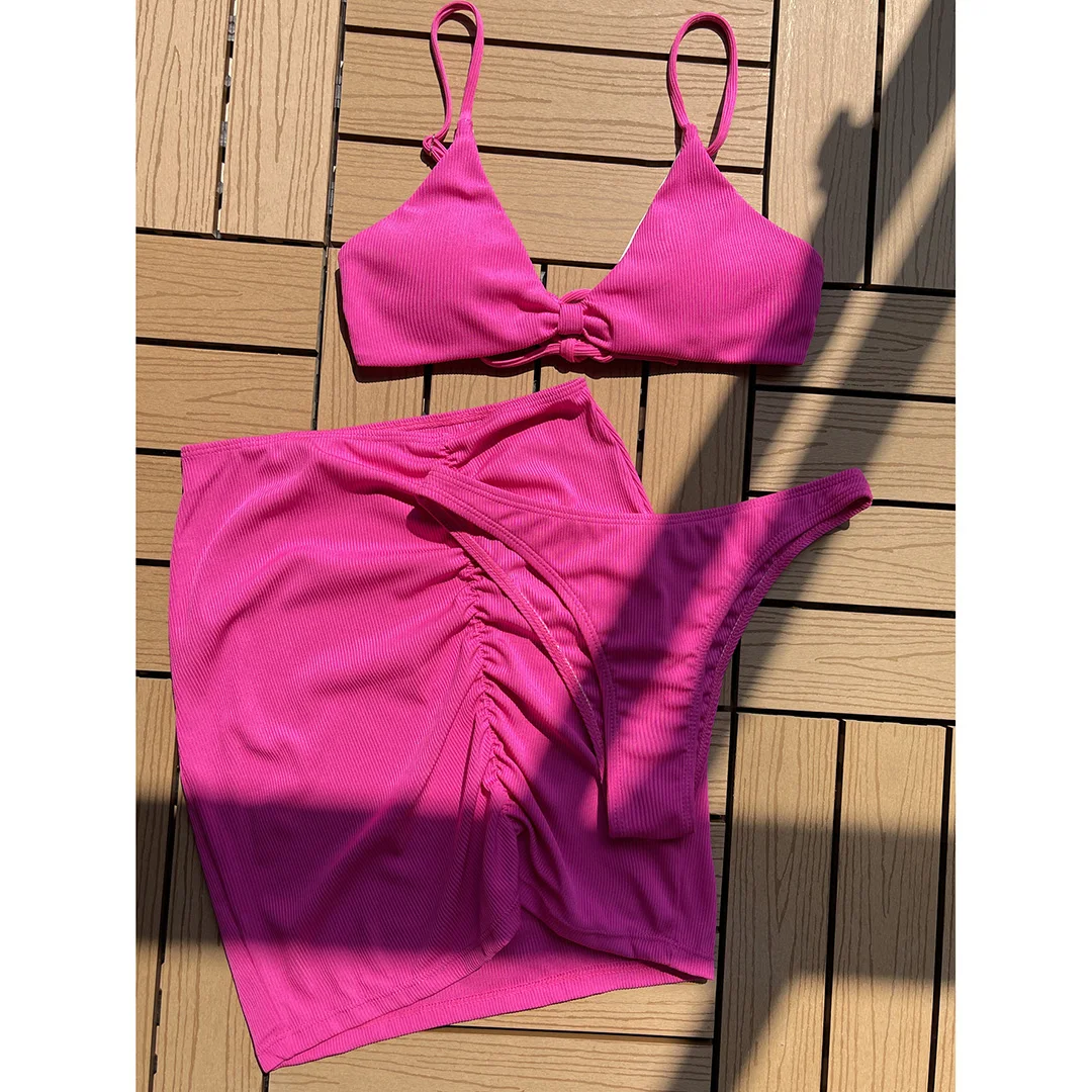 3 PCS Ribbed With Skirt Padded Bikini Female Swimsuit Women Swimwear Three-pieces Bikini set Bather Bathing Suit Swim Lady V3410
