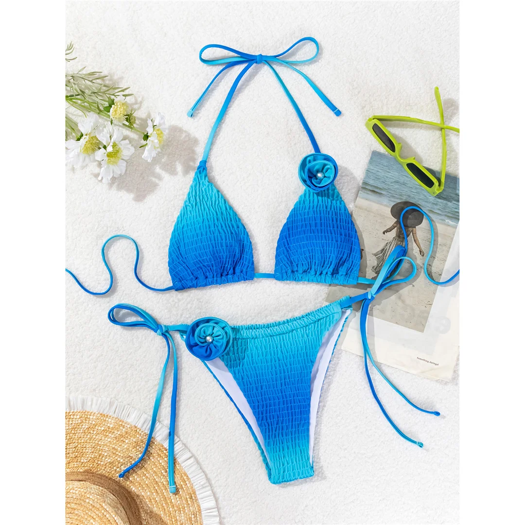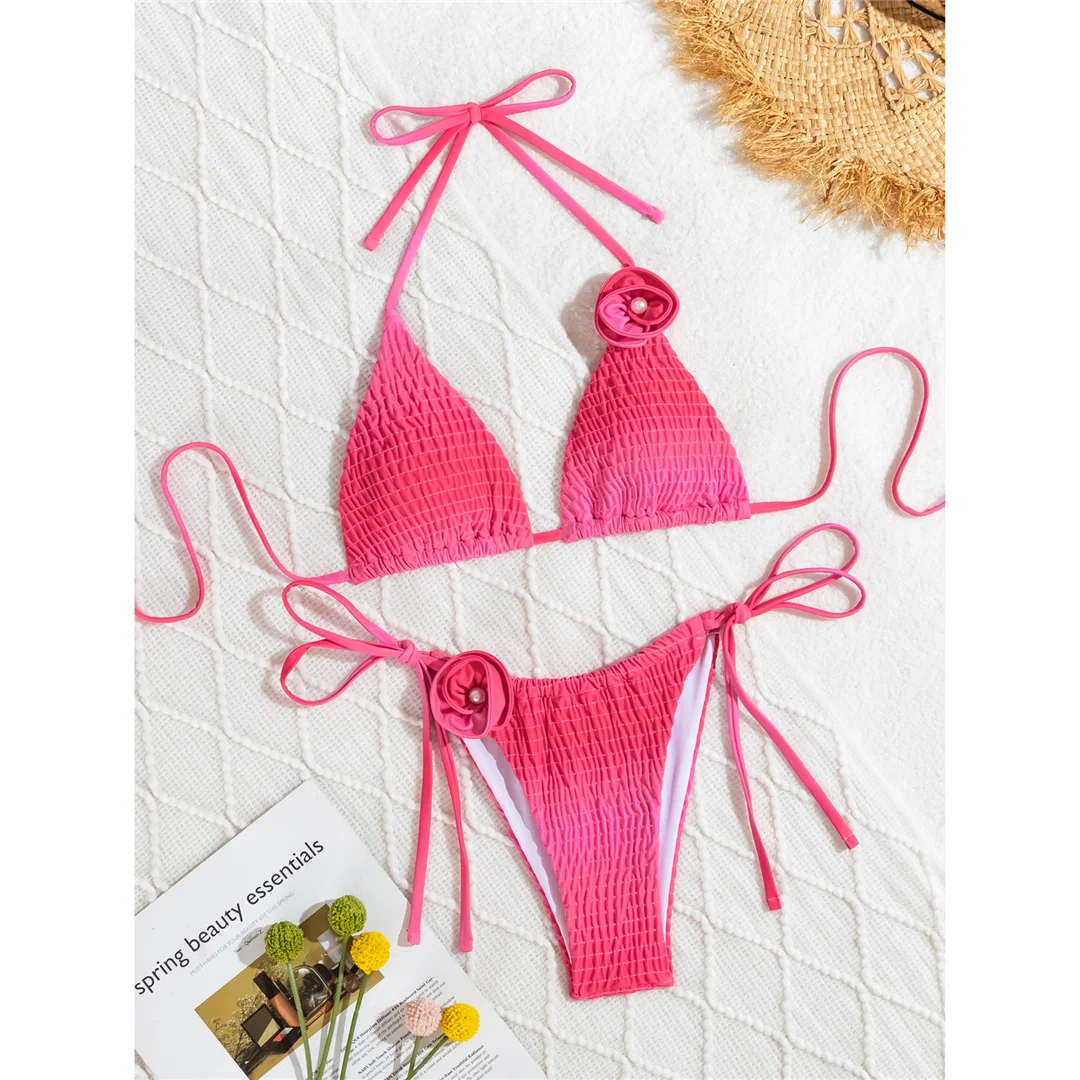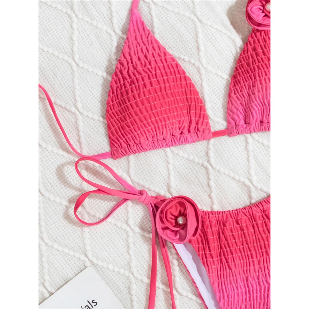 3D Flowers Halter Strappy Wrinkled Bikini Female Swimsuit Women Swimwear Two-pieces Bikini set Bather Bathing Suit Swim V6221