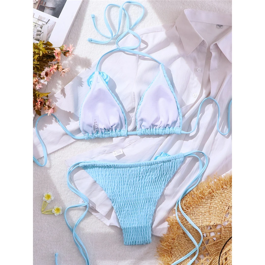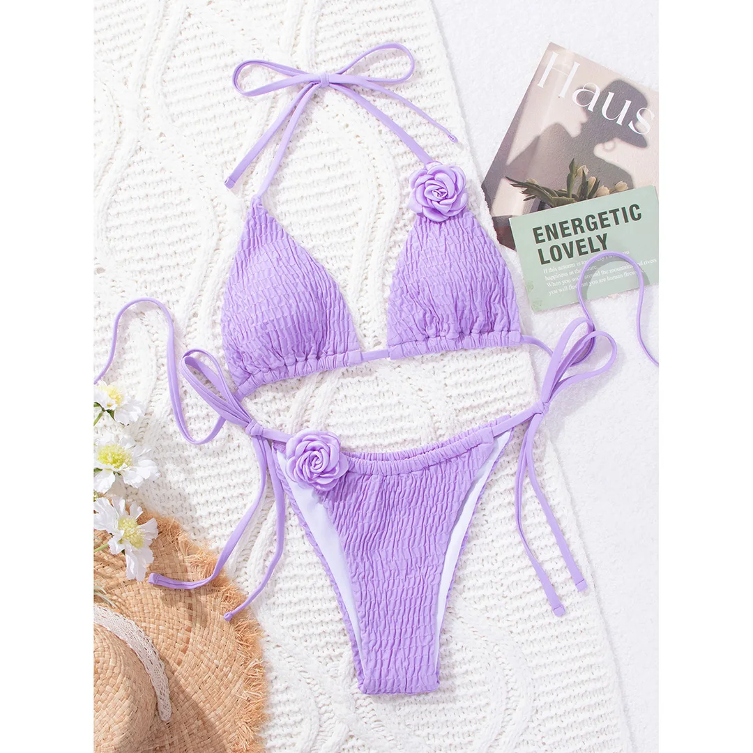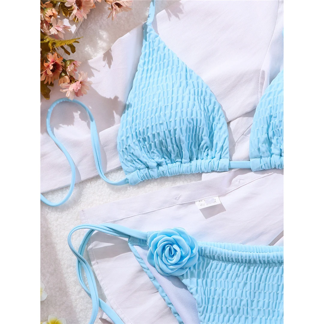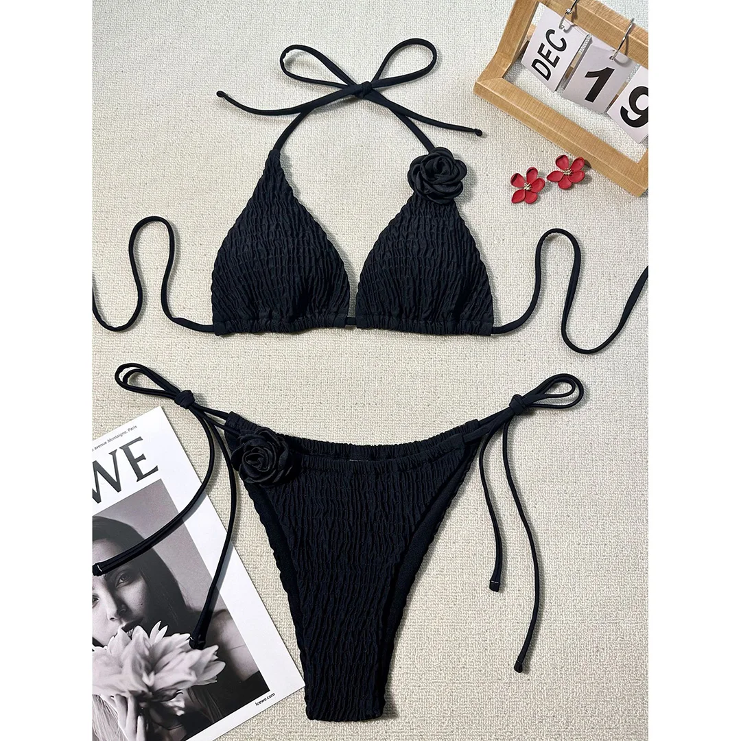 3D Flowers Wrinkled Halter Strappy Bikini Female Swimsuit Women Swimwear Two-pieces Bikini set Bather Bathing Suit Swim V5563
