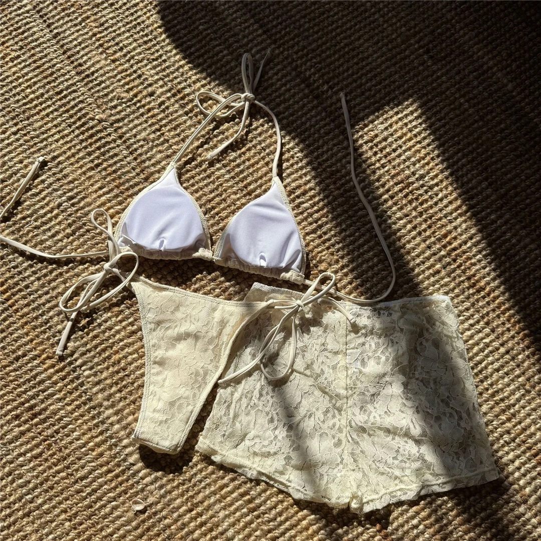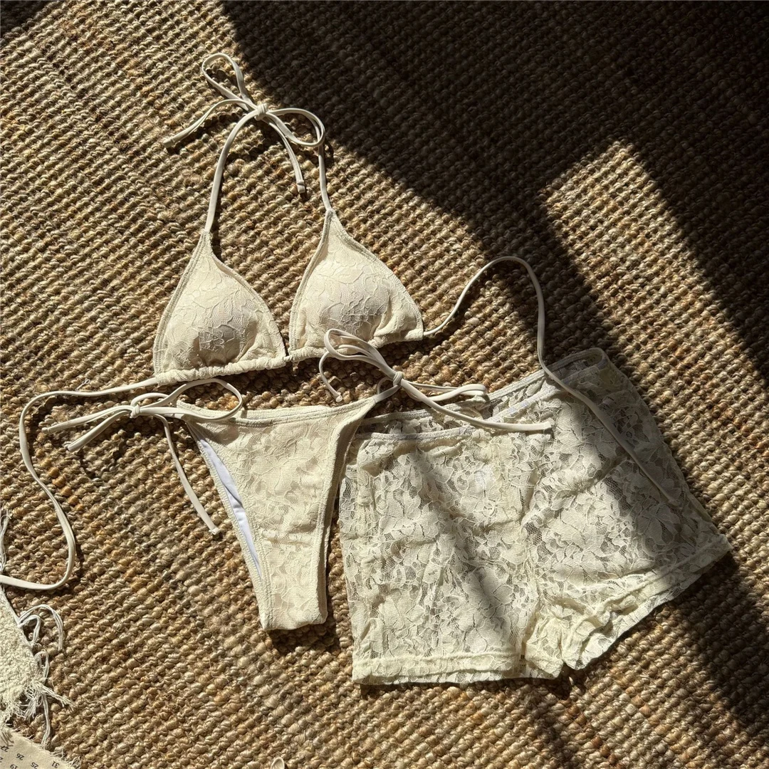 3PCS Halter With Mesh Sheer Shorts Bikini Female Swimsuit Women Swimwear Three-pieces Bikini set Bather Bathing Suit Swim V6389