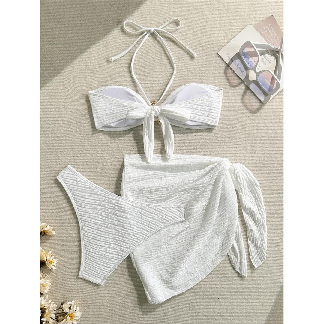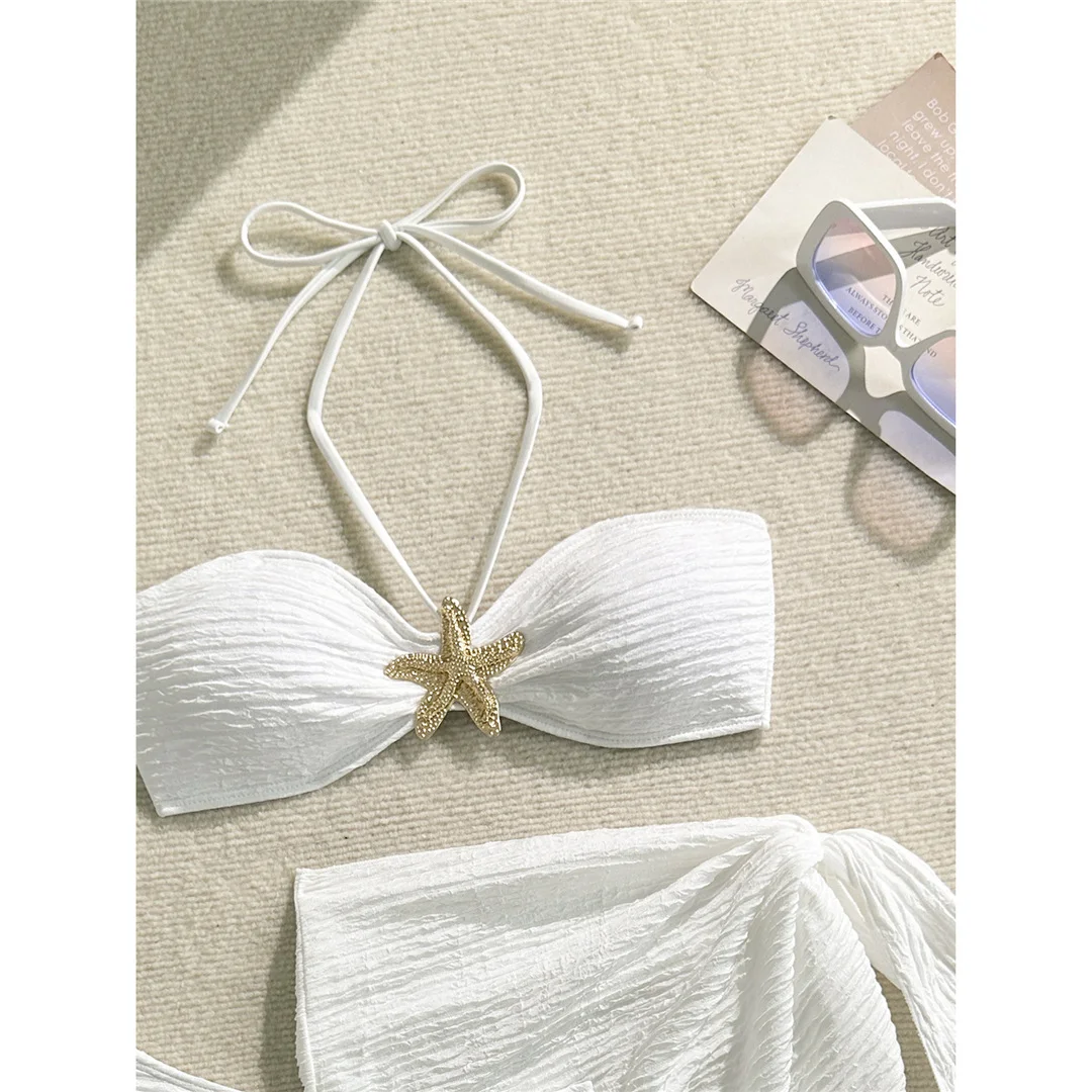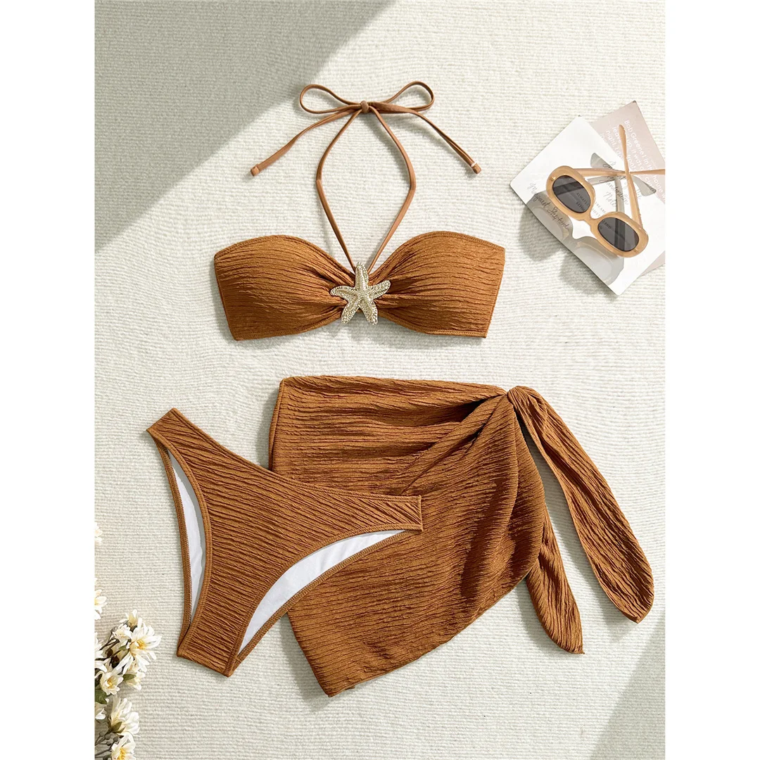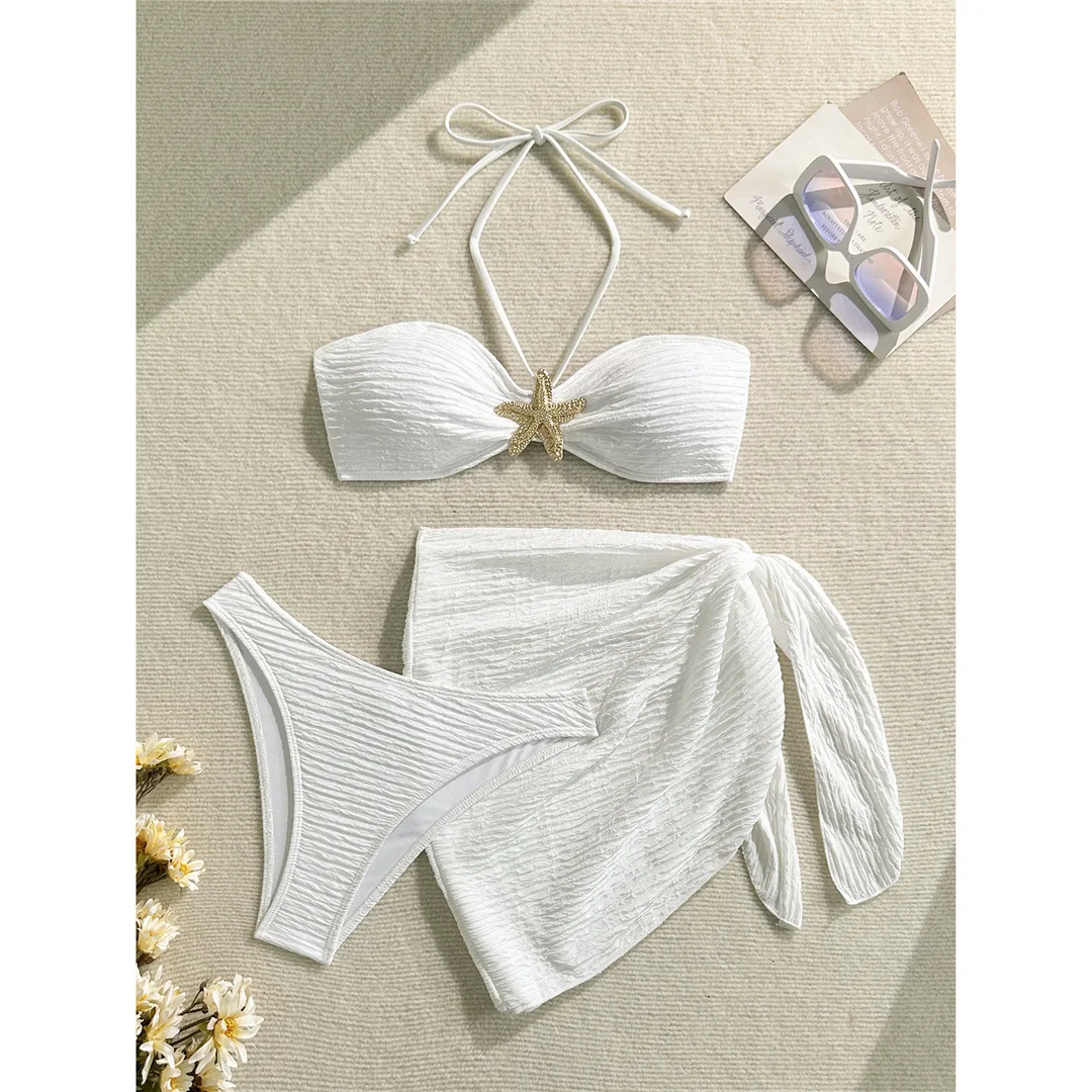 3PCS With Sarong Metal Star Halter Bikini Female Swimsuit Women Swimwear Three-pieces Bikini set Bather Bathing Suit Swim V7042