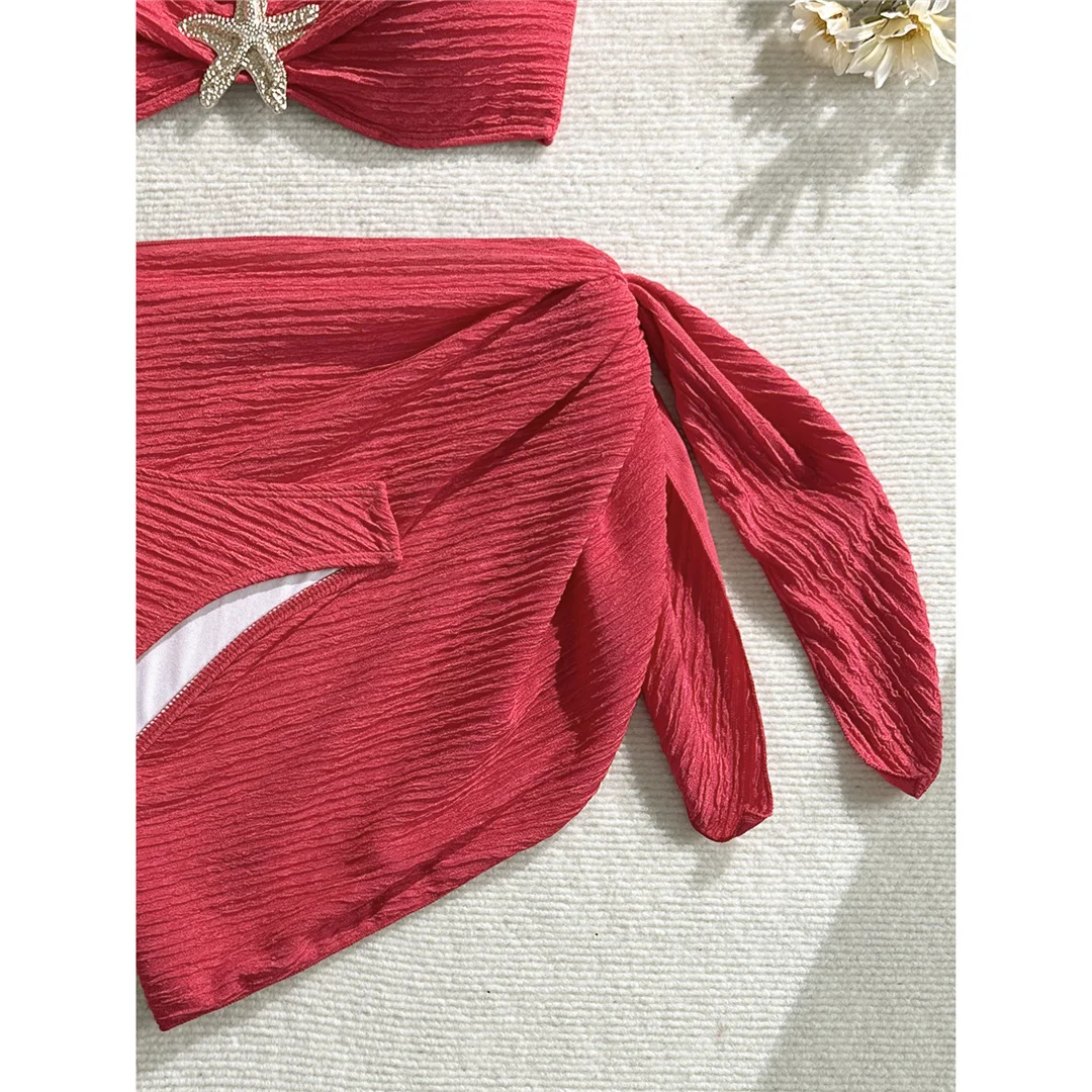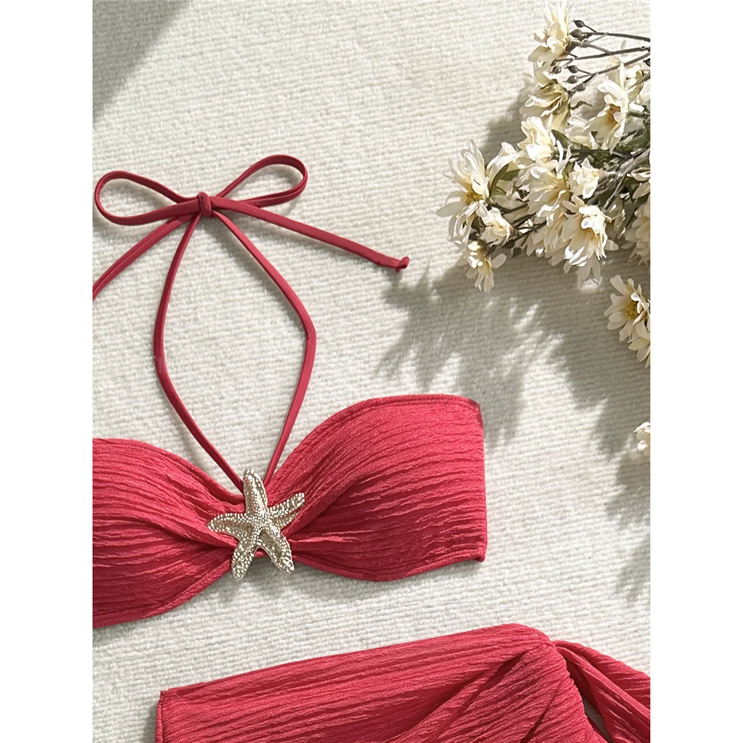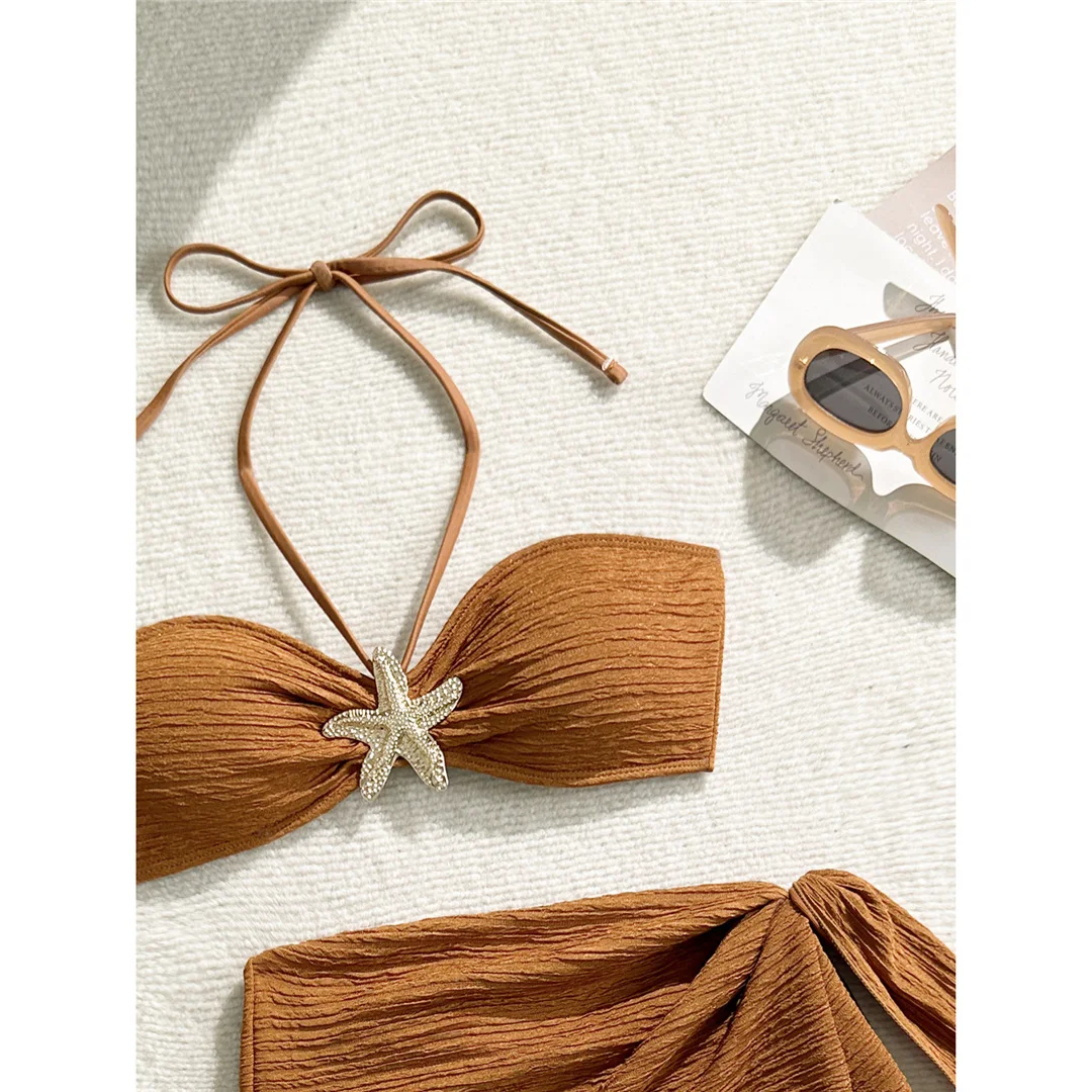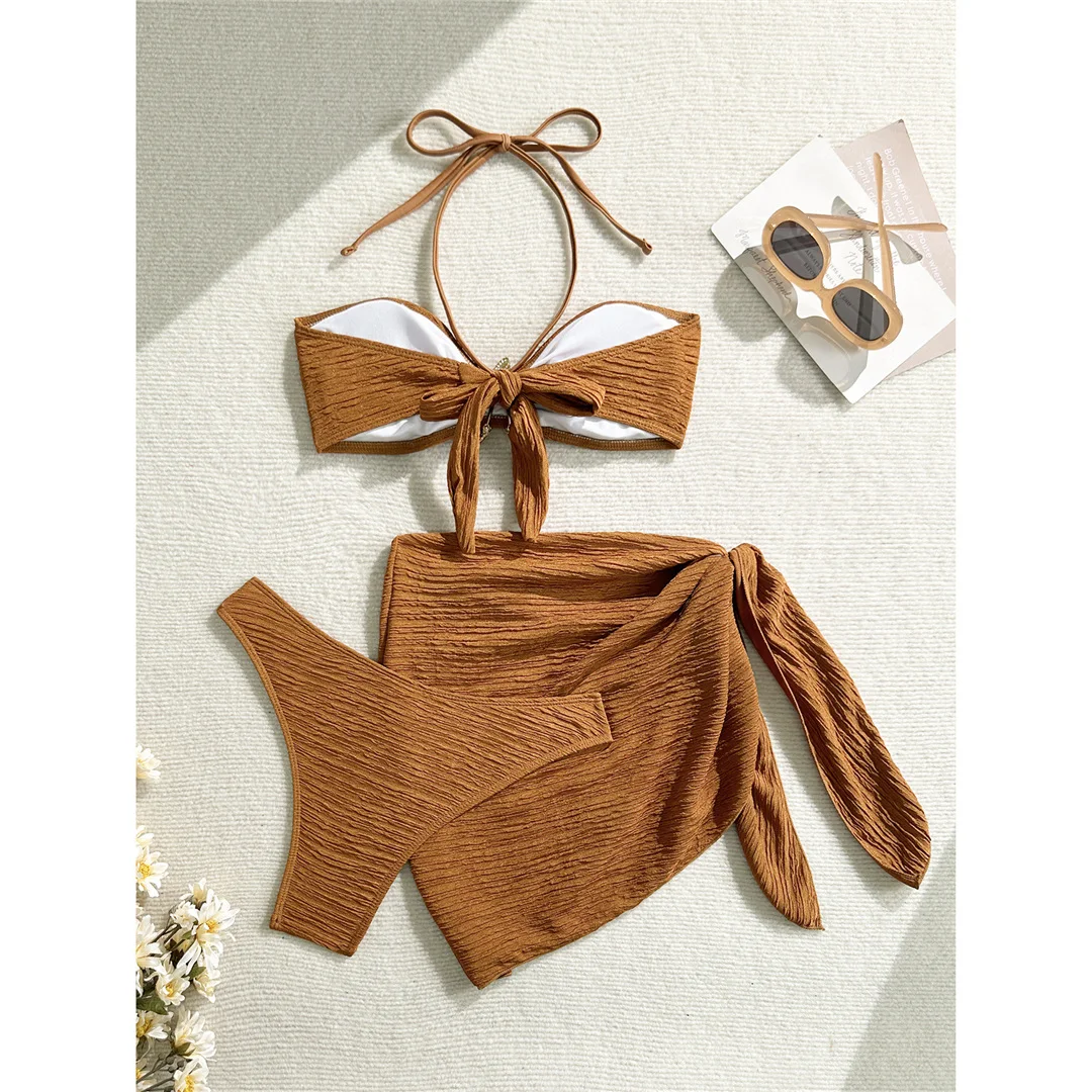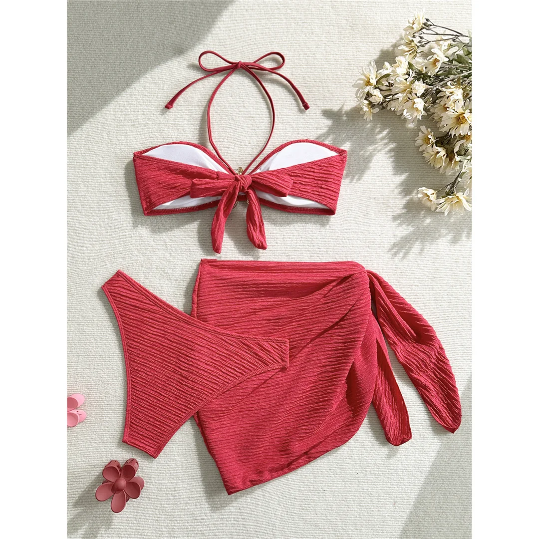 3PCS With Sarong Metal Star Halter Bikini Female Swimsuit Women Swimwear Three-pieces Bikini set Bather Bathing Suit Swim V7042