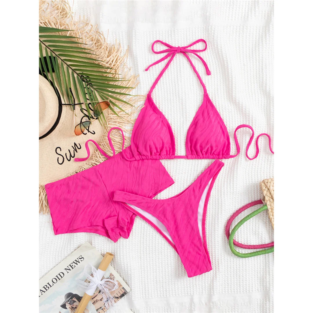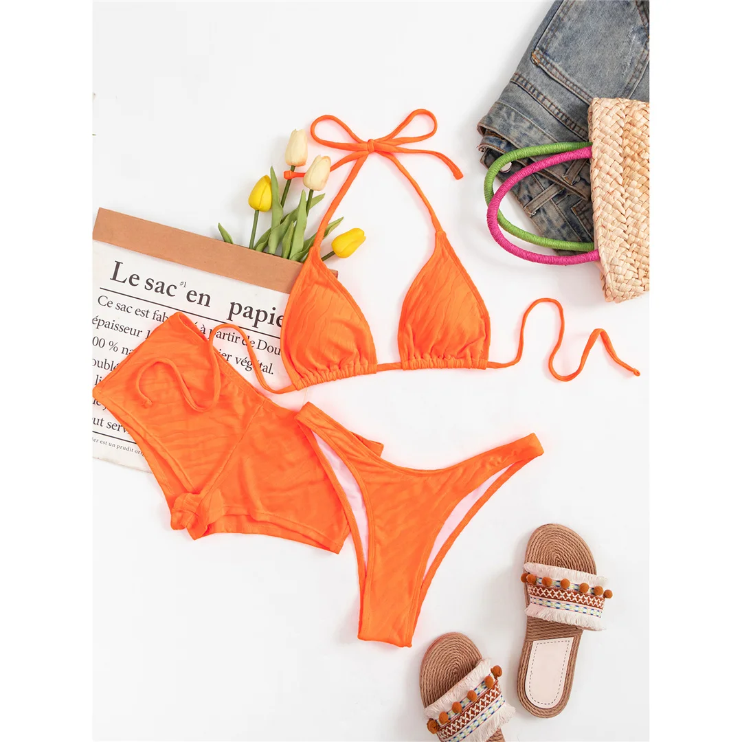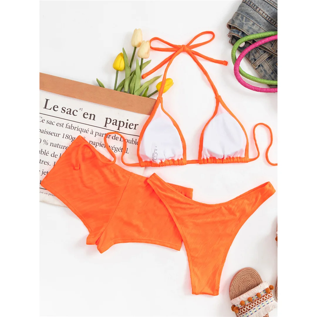3PCS With Shorts Halter Brazilian Bikini Female Swimsuit Women Swimwear Three-pieces Bikini set Bather Bathing Suit Swim V6687