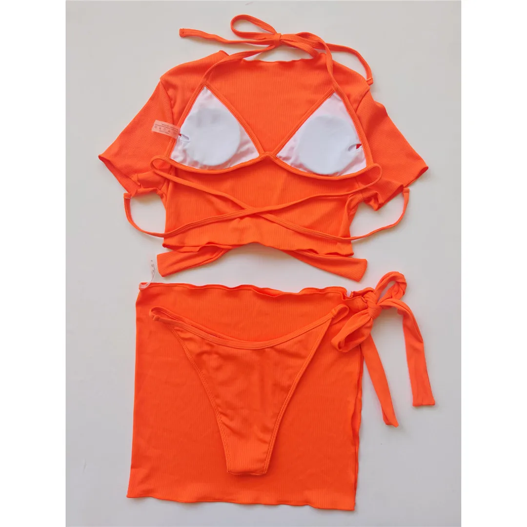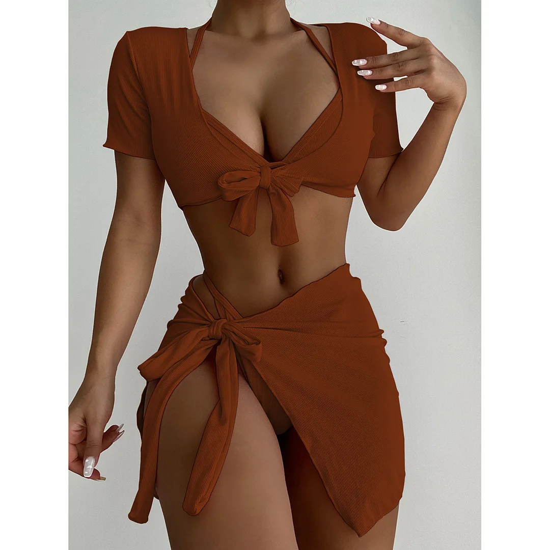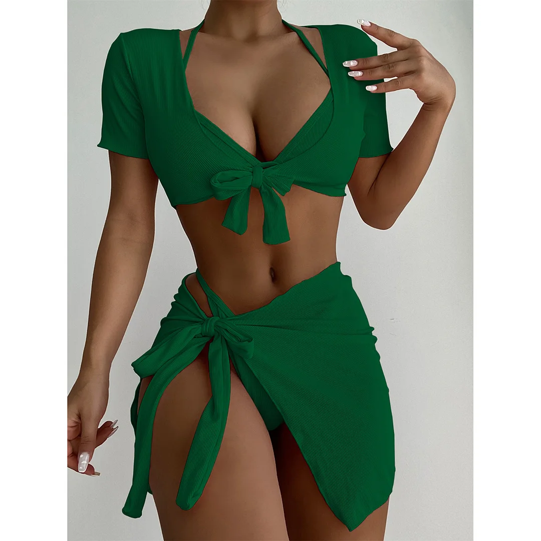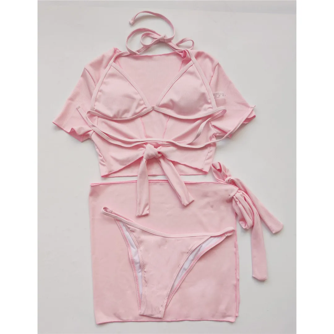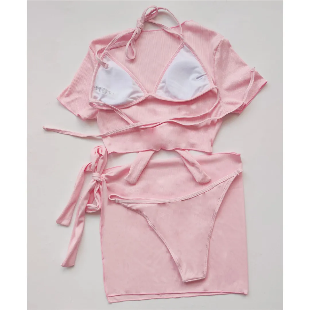 4 PCS Ribbed Halter Bikini Female Swimsuit Women Swimwear Four-pieces Bikini set With Top Sarong Bather Bathing Suit Swim V3152
