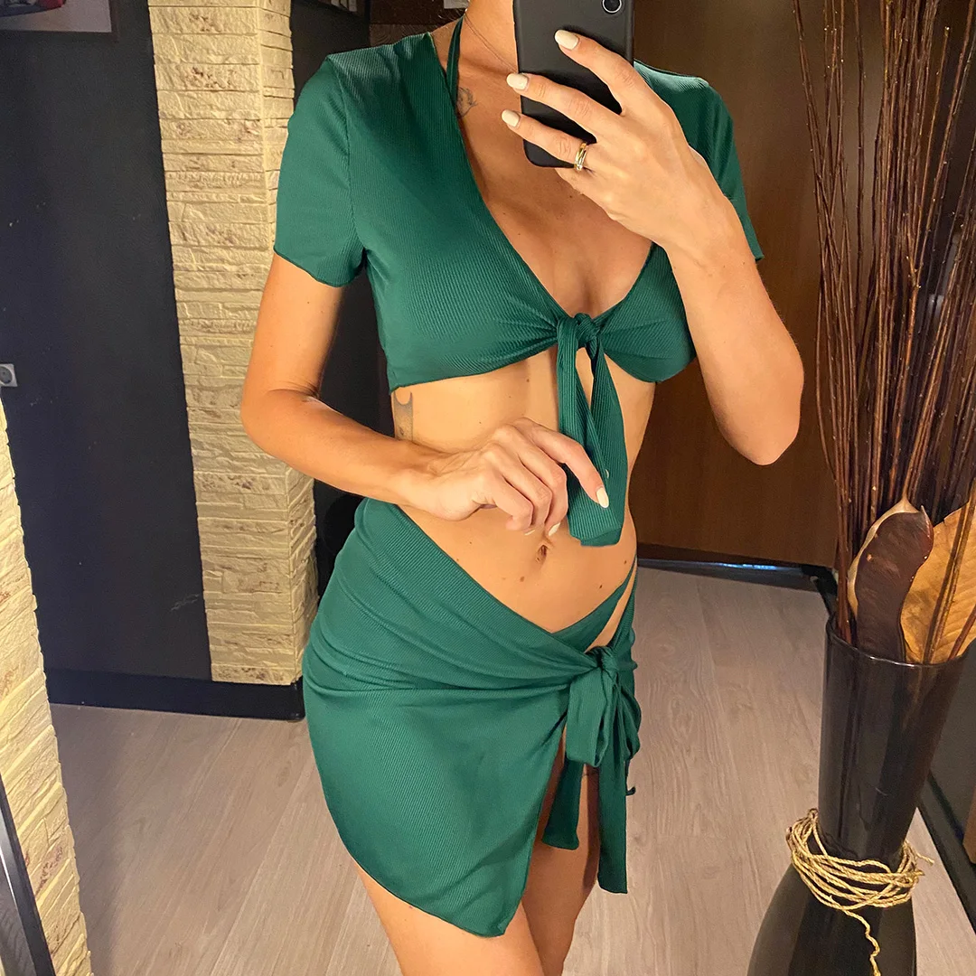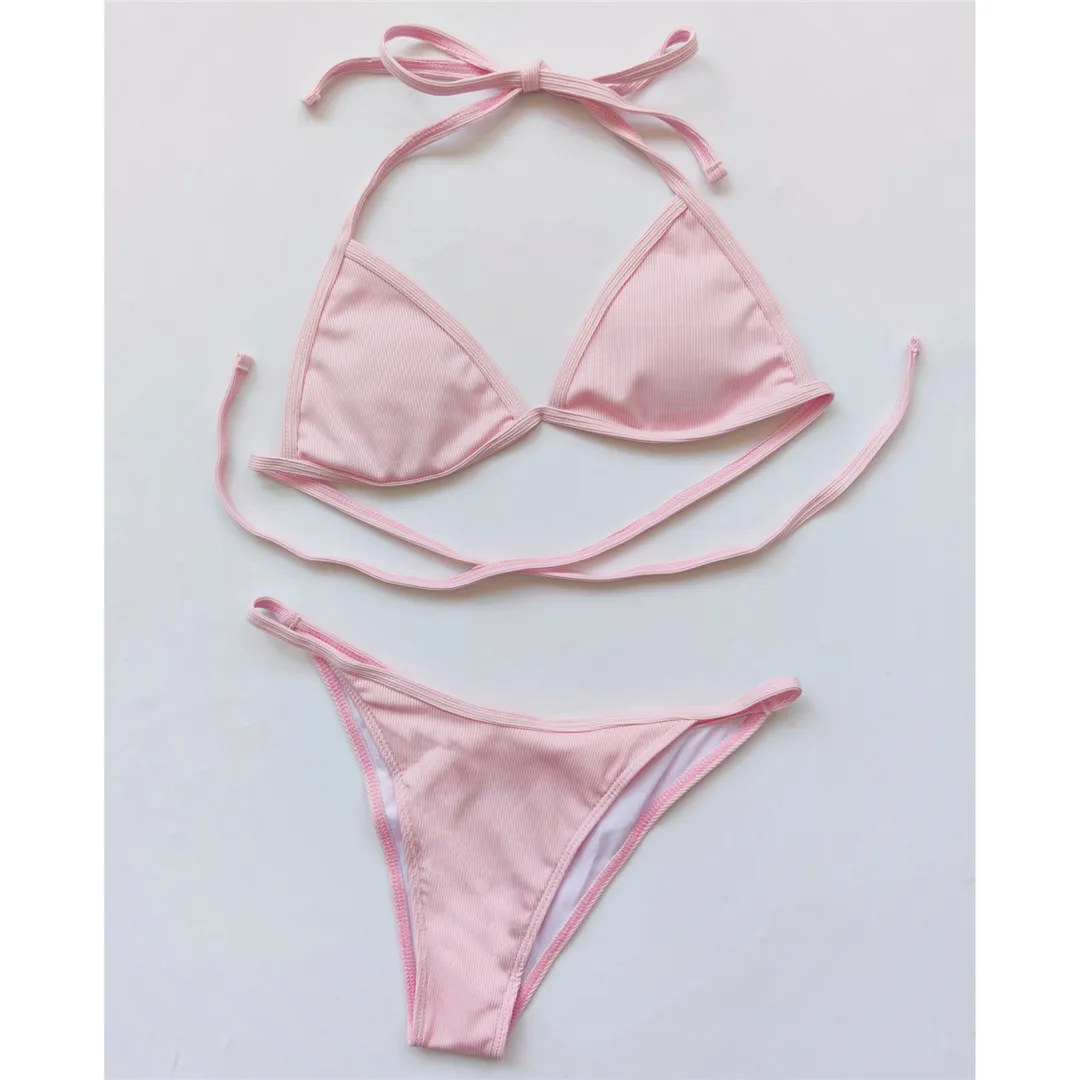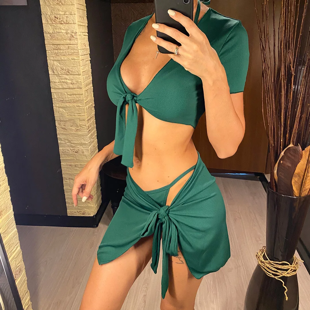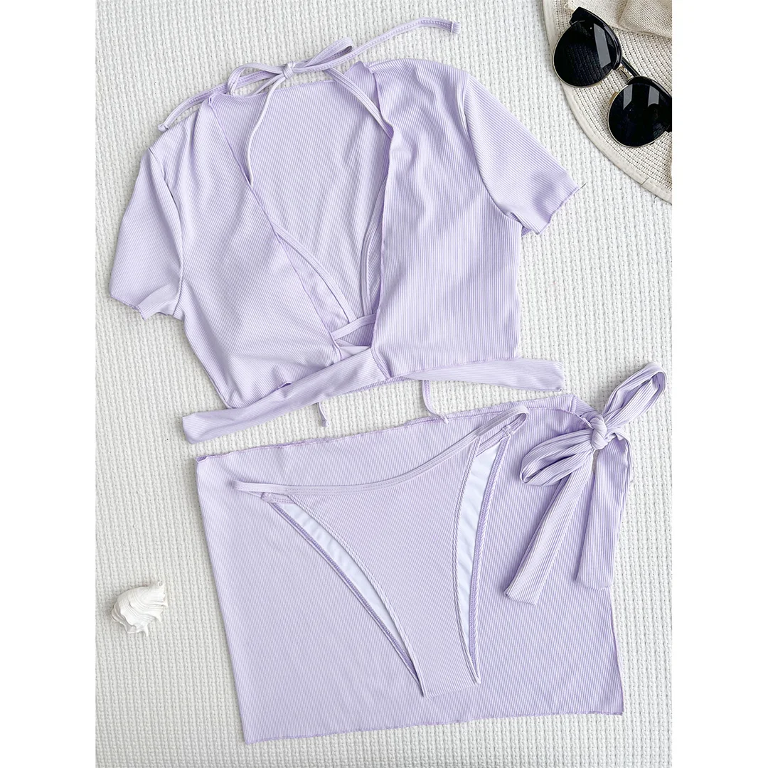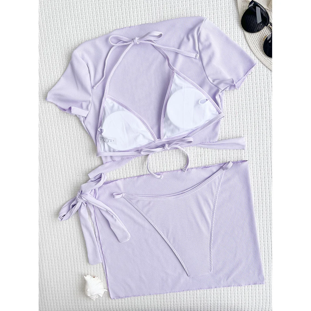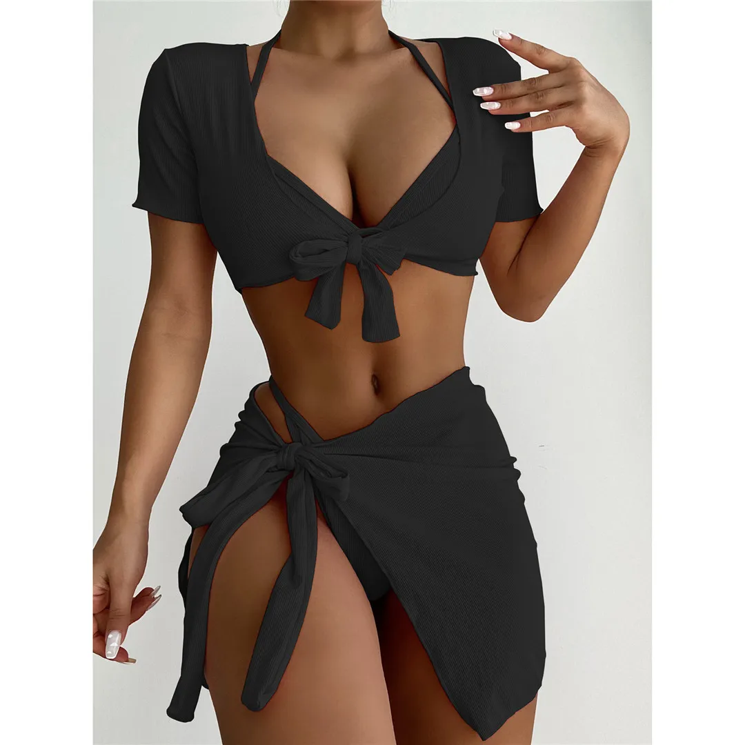 4 PCS Ribbed Halter Bikini Female Swimsuit Women Swimwear Four-pieces Bikini set With Top Sarong Bather Bathing Suit Swim V3152