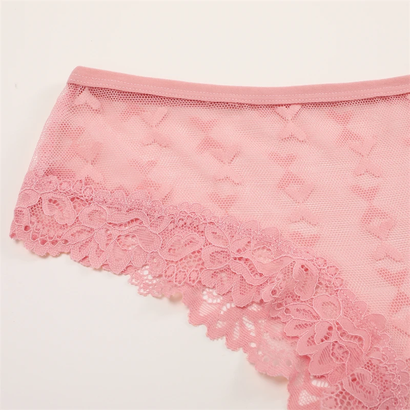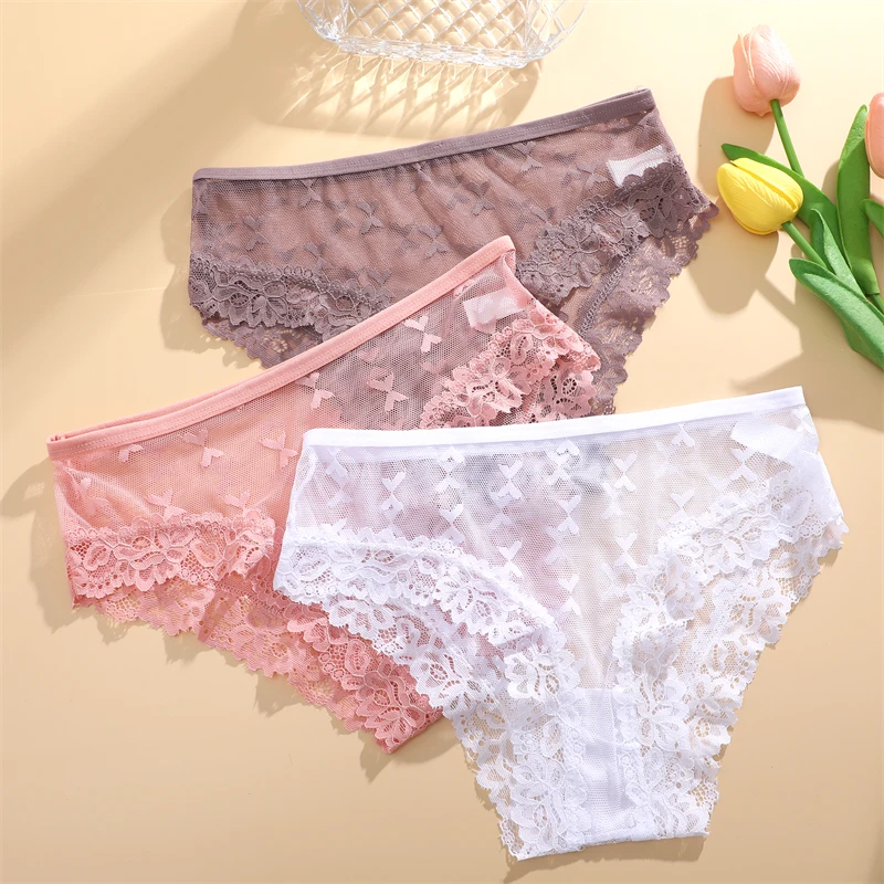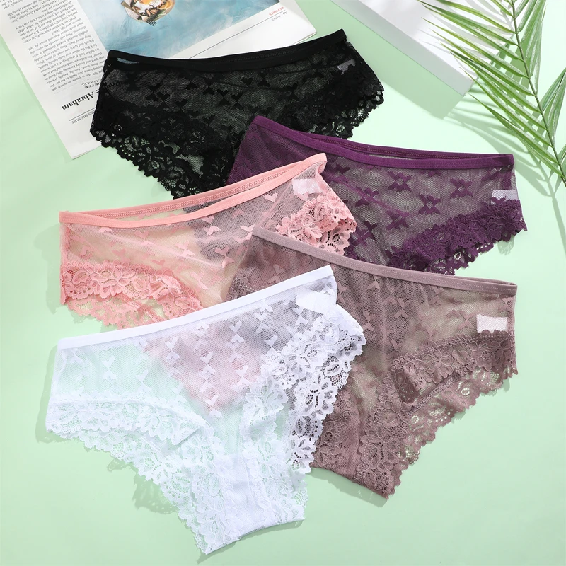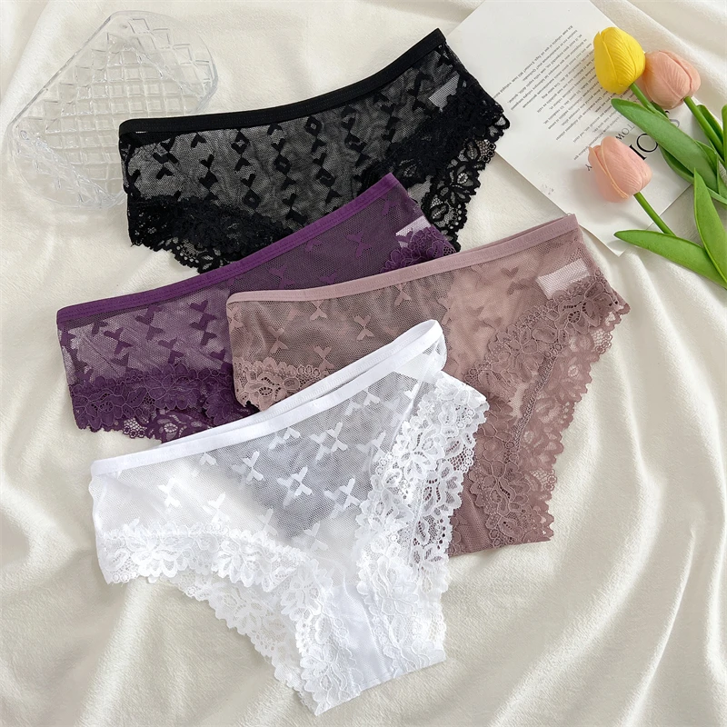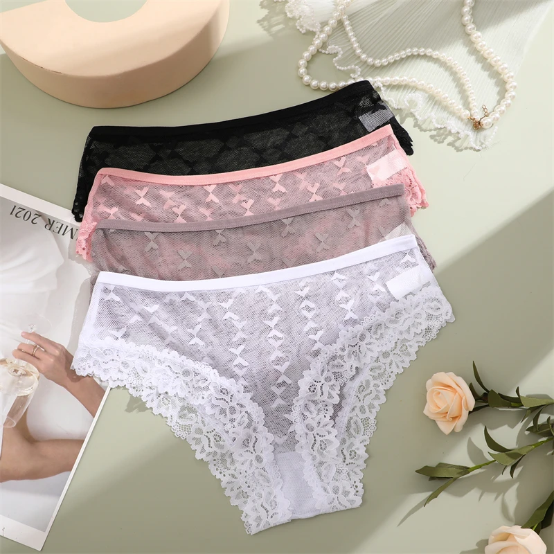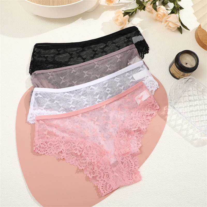 4Pcs Women’s Lace Transparent Panties Sexy Hollow Out Underwear Solid Briefs Girls Low Waist Soft Lingerie Breathable Intimates