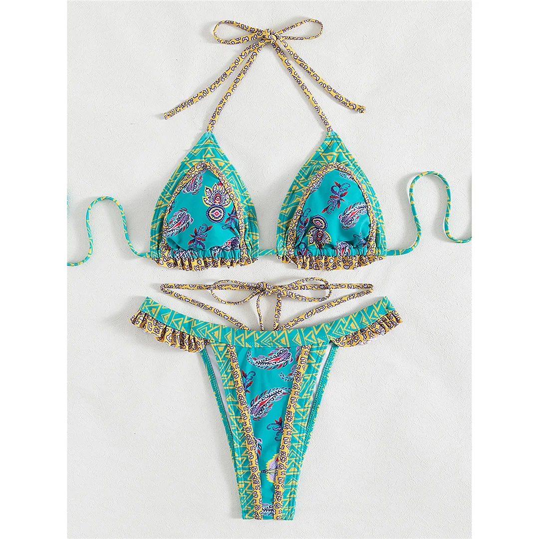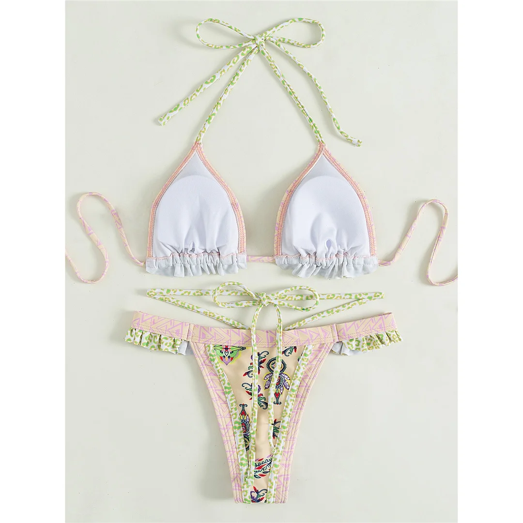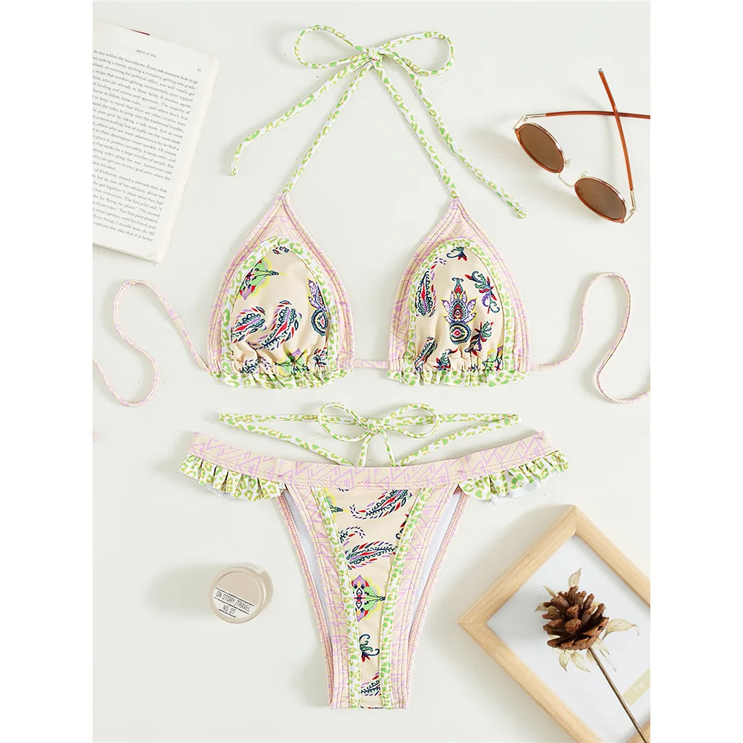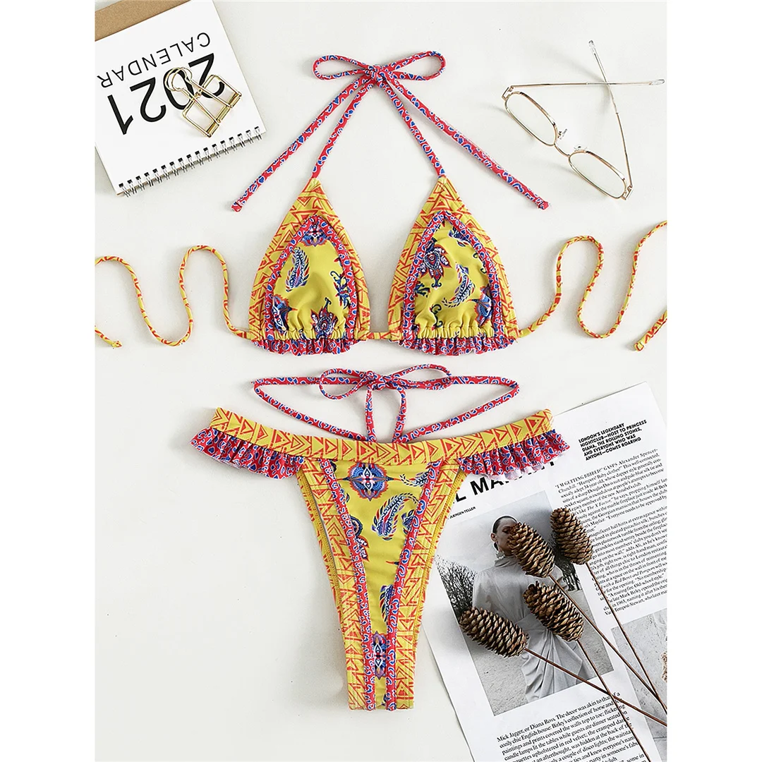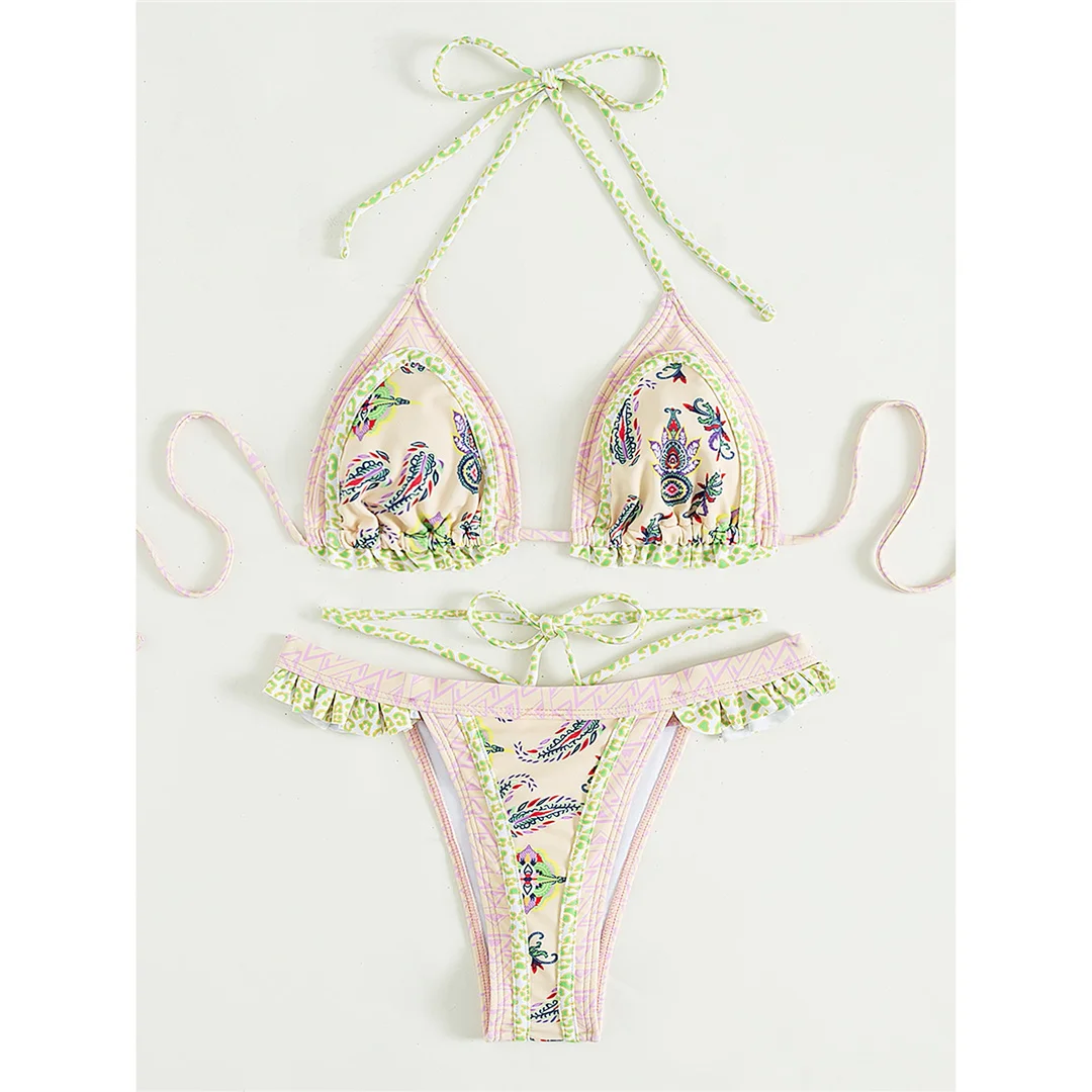 5 Colors Sexy Printed Halter Frilled Bikini Women Swimwear Female Swimsuit Two-pieces Bikini set Bather Bathing Suit Swim V4651