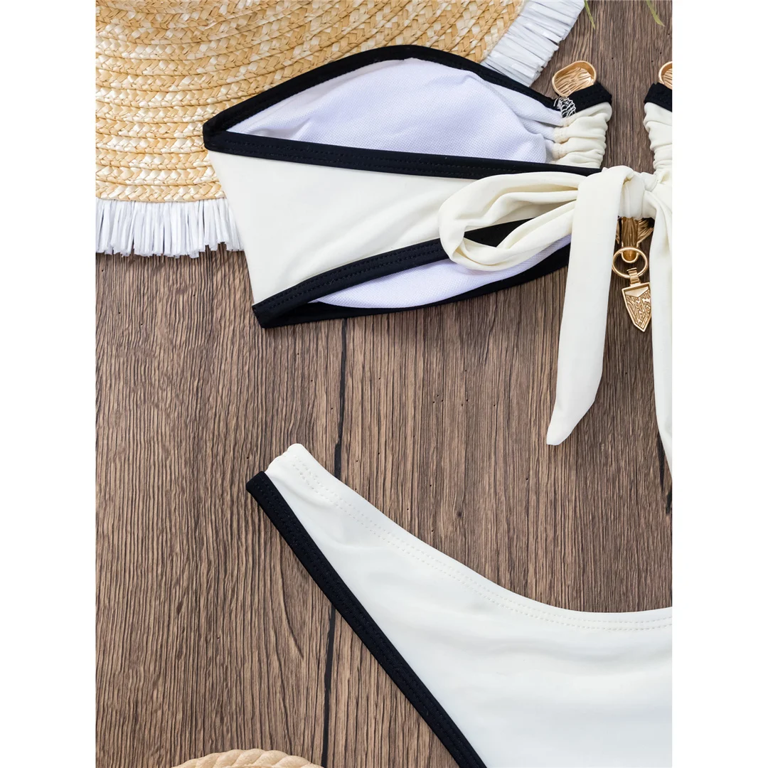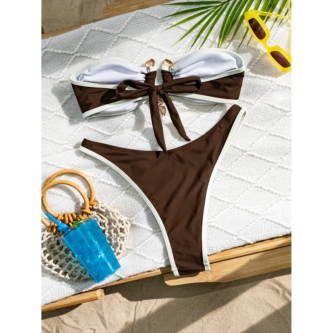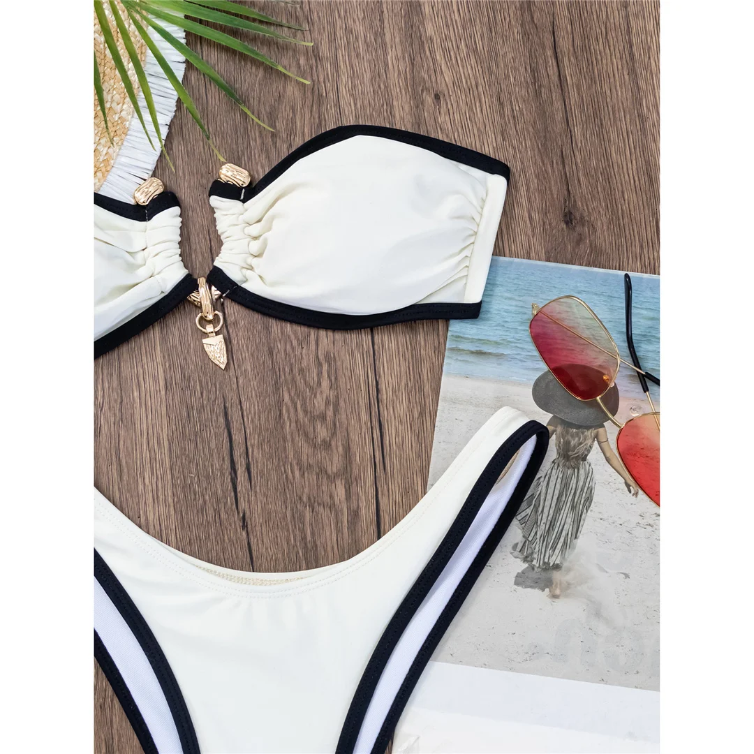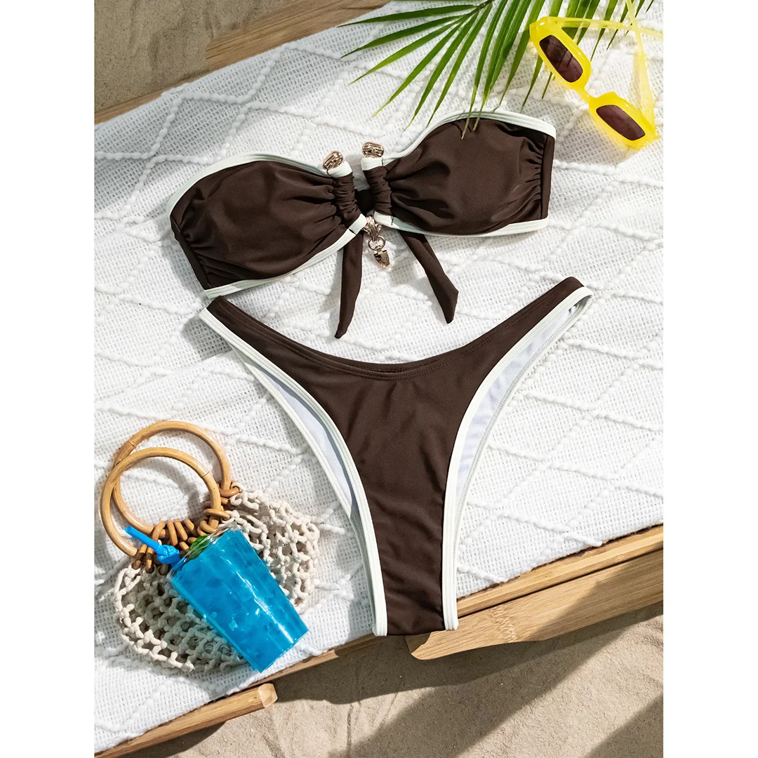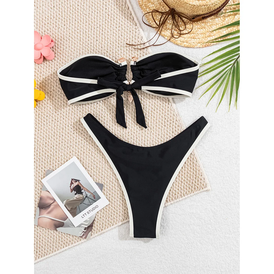 Bandeau Splicing Metal Ring Brazilian Bikini Women Swimwear Female Swimsuit Two-pieces Bikini set Bather Bathing Suit Swim V5651