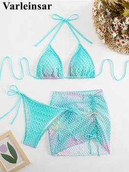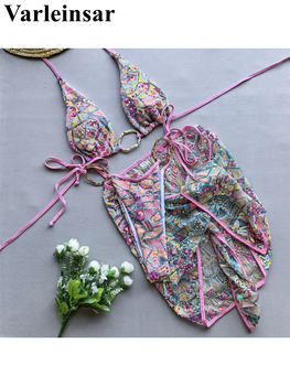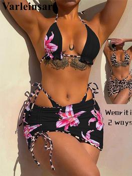 With Sarong Printed Sequins Bikini Female Swimsuit Women Swimwear Three-pieces Bikini set Padded Bather Bathing Suit Swim V7420