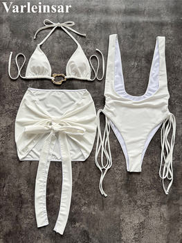 With Beach Pants Halter Brazilian Bikini Female Swimsuit Women Swimwear Three-pieces Bikini set Bather Bathing Suit Swim V5987