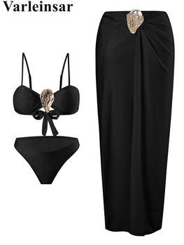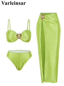 With Sarong Printed Sequins Bikini Female Swimsuit Women Swimwear Three-pieces Bikini set Padded Bather Bathing Suit Swim V7420