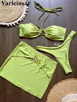 New With Sarong Halter Ruffled Bikini Women Swimwear Female Swimsuit Three-pieces Bikini set Bather Bathing Suit Swim Lady V4144