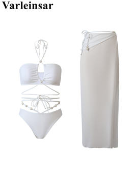 Pearl Wrap Around Halter With Skirt Bikini Women Swimwear Female Swimsuit Three-pieces Bikini set Bather Bathing Suit Swim V6098