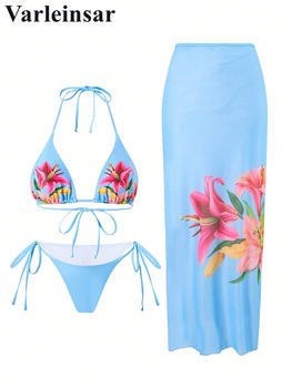 XS – L With Skirt Flowers Printed Bikini Women Swimwear Female Swimsuit Three-pieces Bikini set Bather Bathing Suit Swim V6915