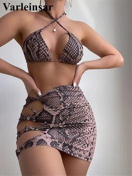 New With Skirt Snake Skin Printed Halter Bikini Women Swimwear Female Swimsuit Three-pieces Bikini set Bather Bathing Suit V4113