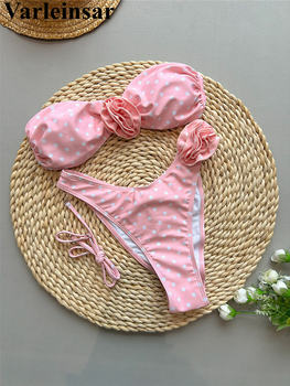 3D Flower Bandeau Dots Bikini Female Swimsuit Women Swimwear Two-pieces Bikini set Scrunch Butt Bather Bathing Suit Swim V6889