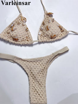 Halter Crochet Knitted High Cut Leg Bikini Female Swimsuit Women Swimwear Two-pieces Bikini set Bather Bathing Suit Swim V6715