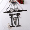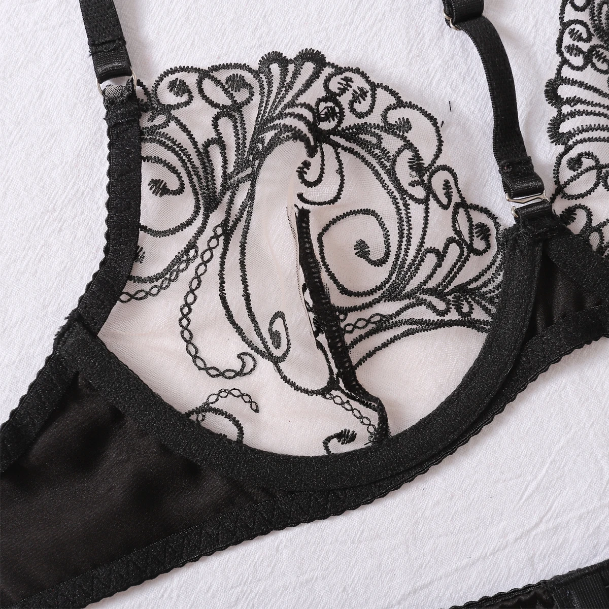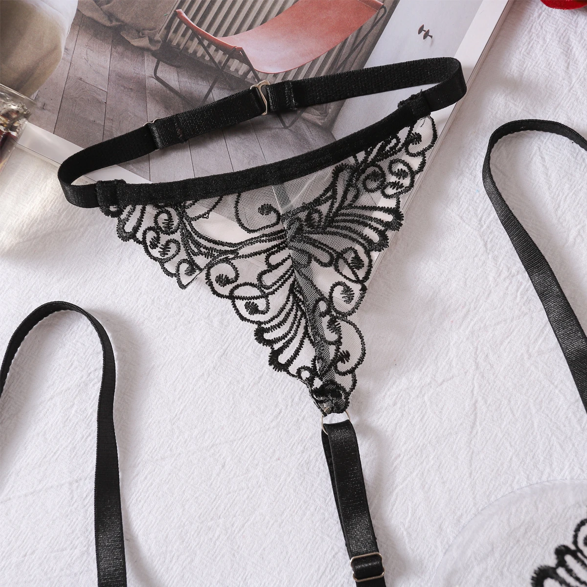 Black Embriodered Low Cut transparent underwear Womens 5 Piece Floral Lace Underwire Garter Lingerie Set Sexy Porn Suits