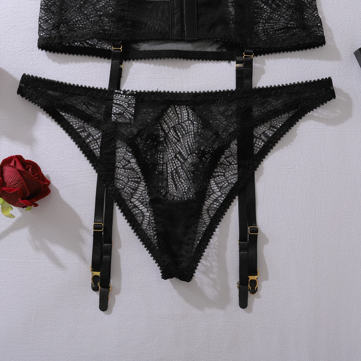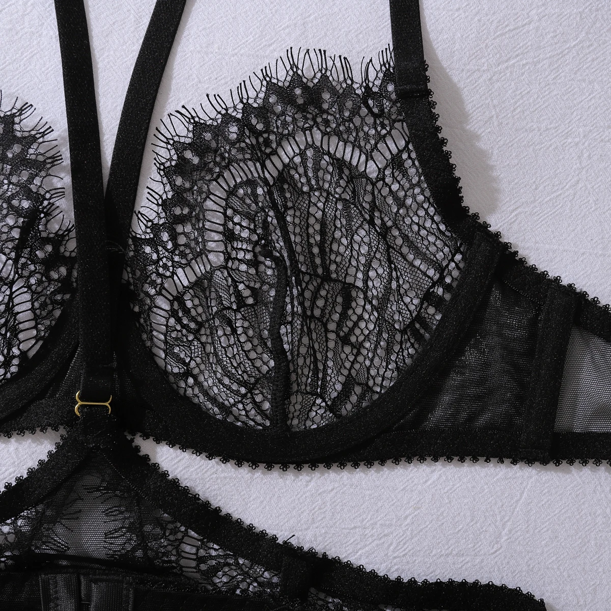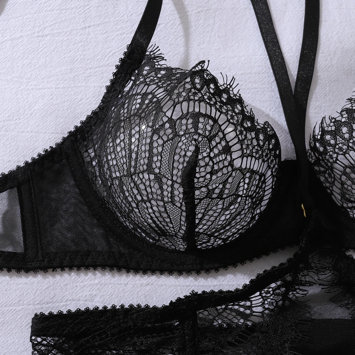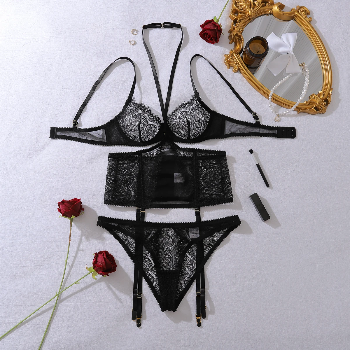 Black Heavy duty Eyelash Lace Hanging Neck Perspective Body Shaping Waist Cover Sexy Underwear Three Piece Set