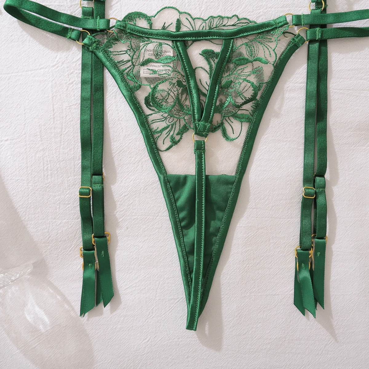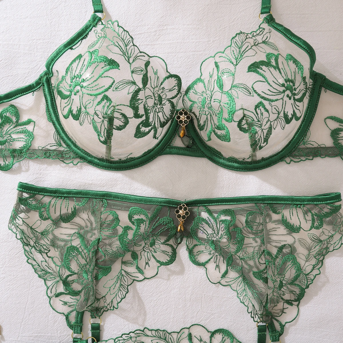 Cross border flower perspective embroidery steel ring gathering shaping midnight sexy lingerie three piece set