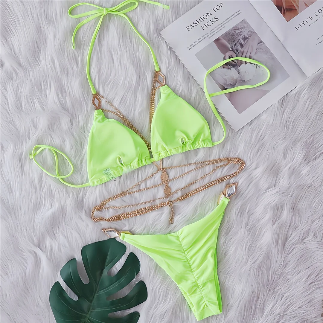Diamond Rhinestones Halter Metal Ring Bikini Female Swimsuit Women Swimwear Two-pieces Bikini set Bather Bathing Suit Swim V5898