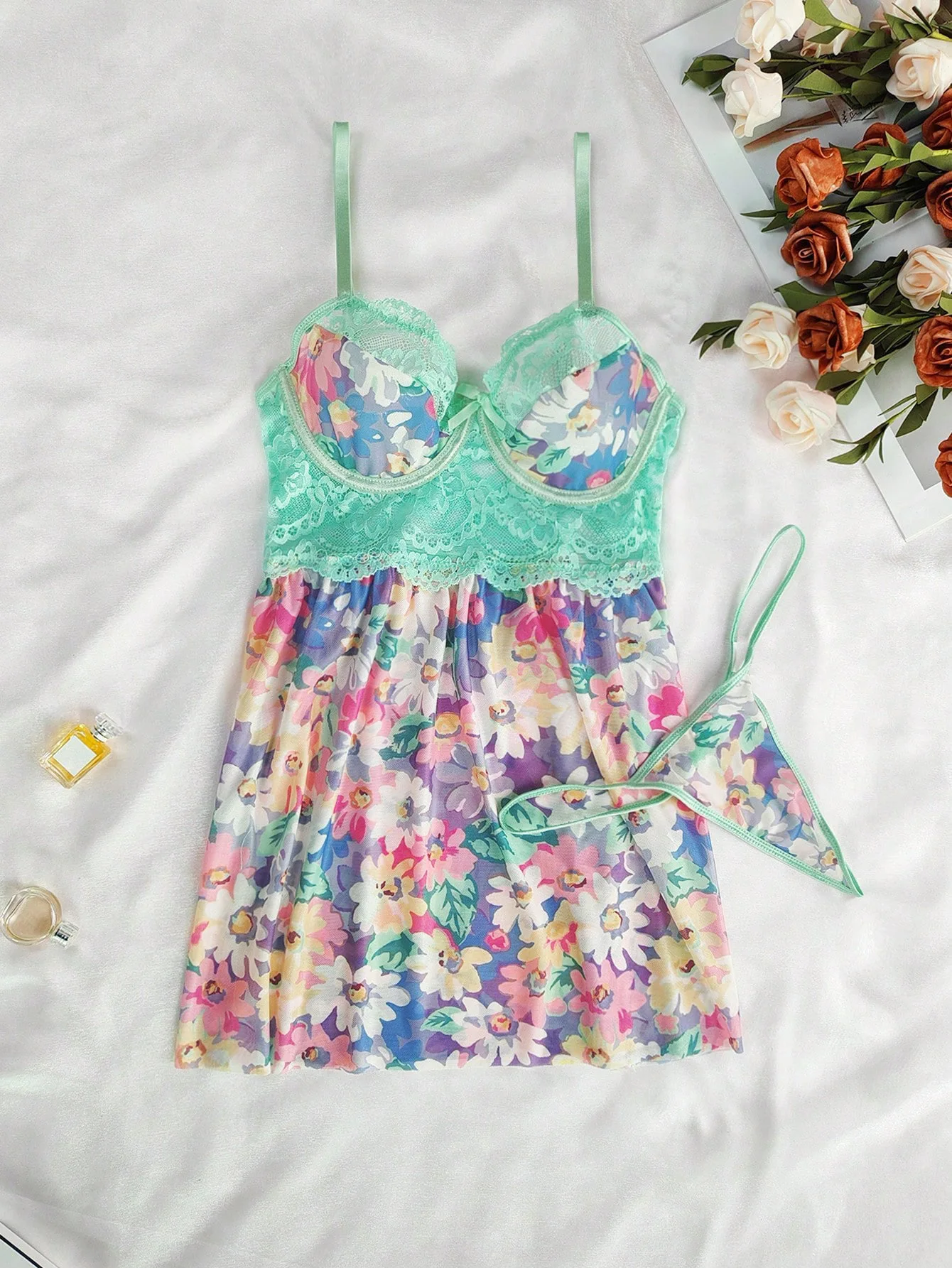 Diccvicc Fancy Print Floral Night Dress Sexy Lace Bra Romantic Underwear Panty Set Vintage Women Sleepwear Exotic Body Apparel
