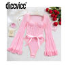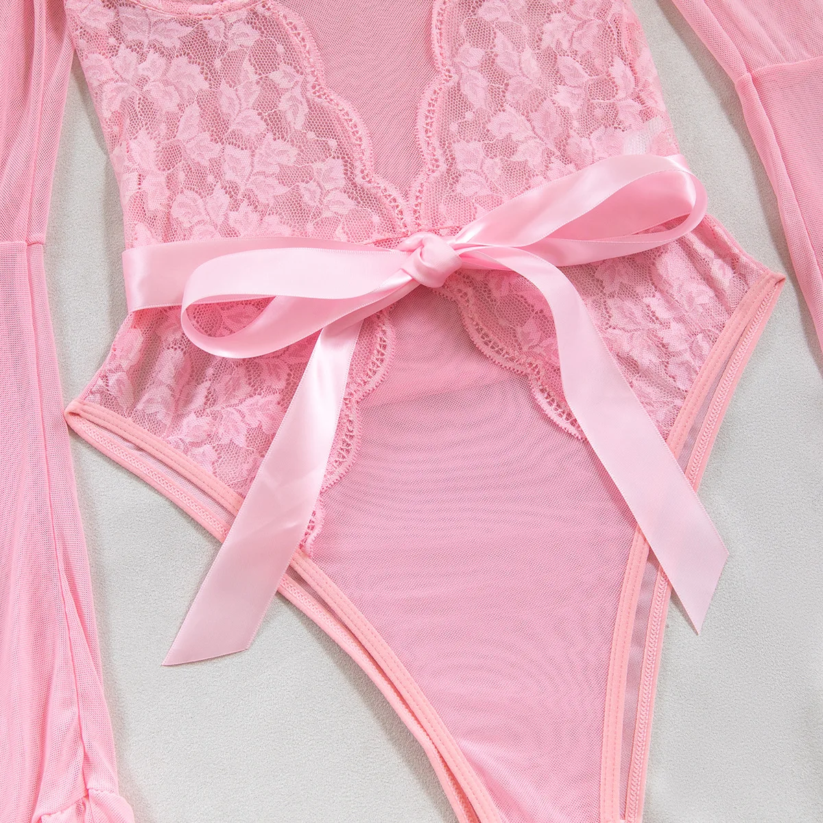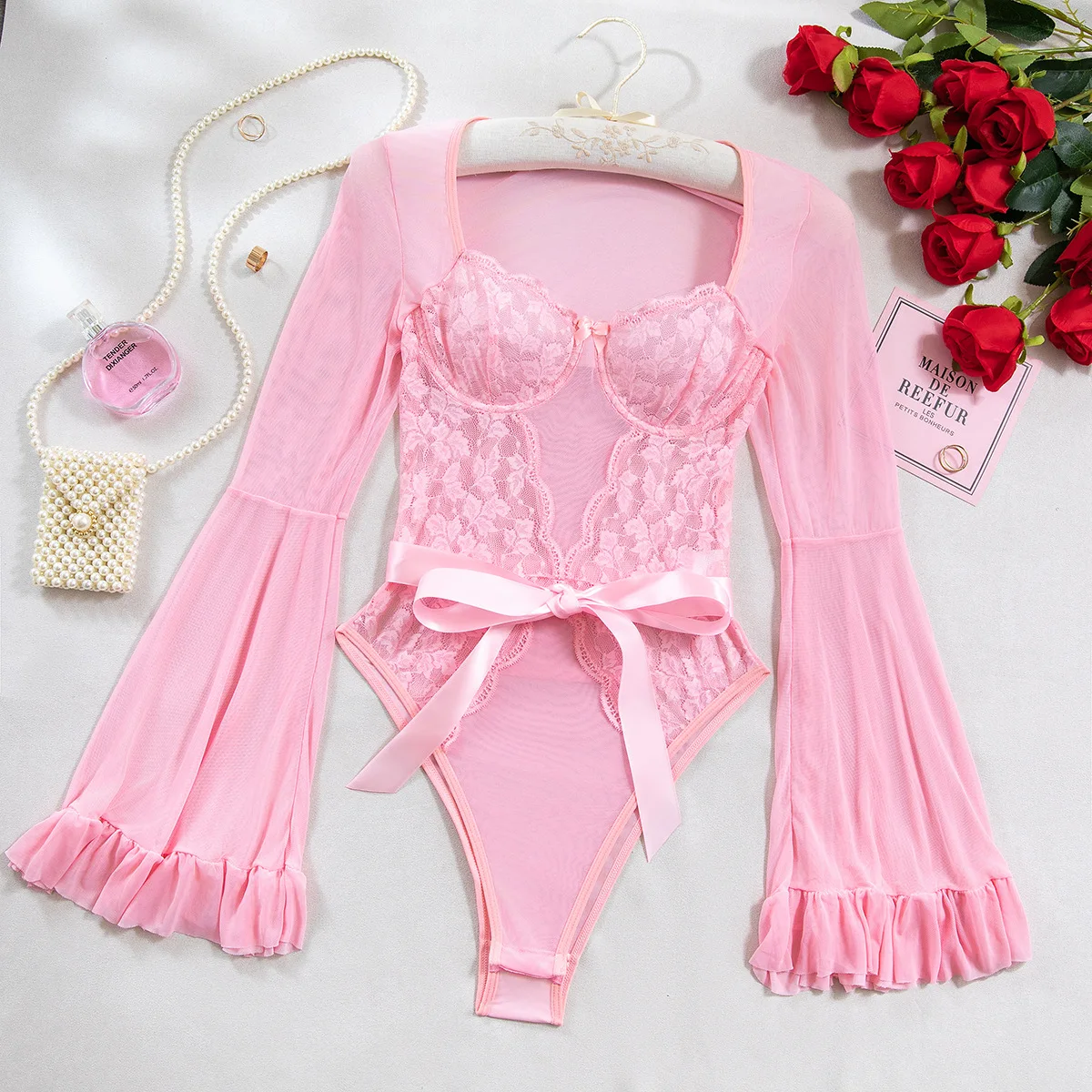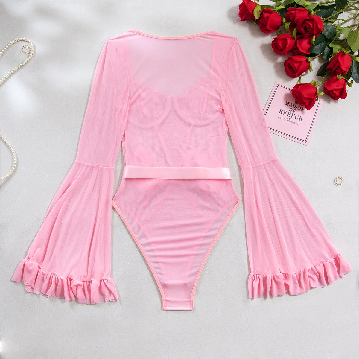 Diccvicc Flared Sleeves Bodysuit Patchwork Lace See Through Sexy Body Lingerie Sheer Mesh Jumpsuit Open Crotch Women Underwear
