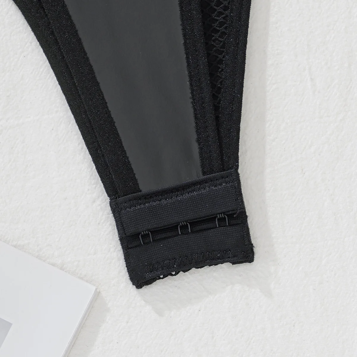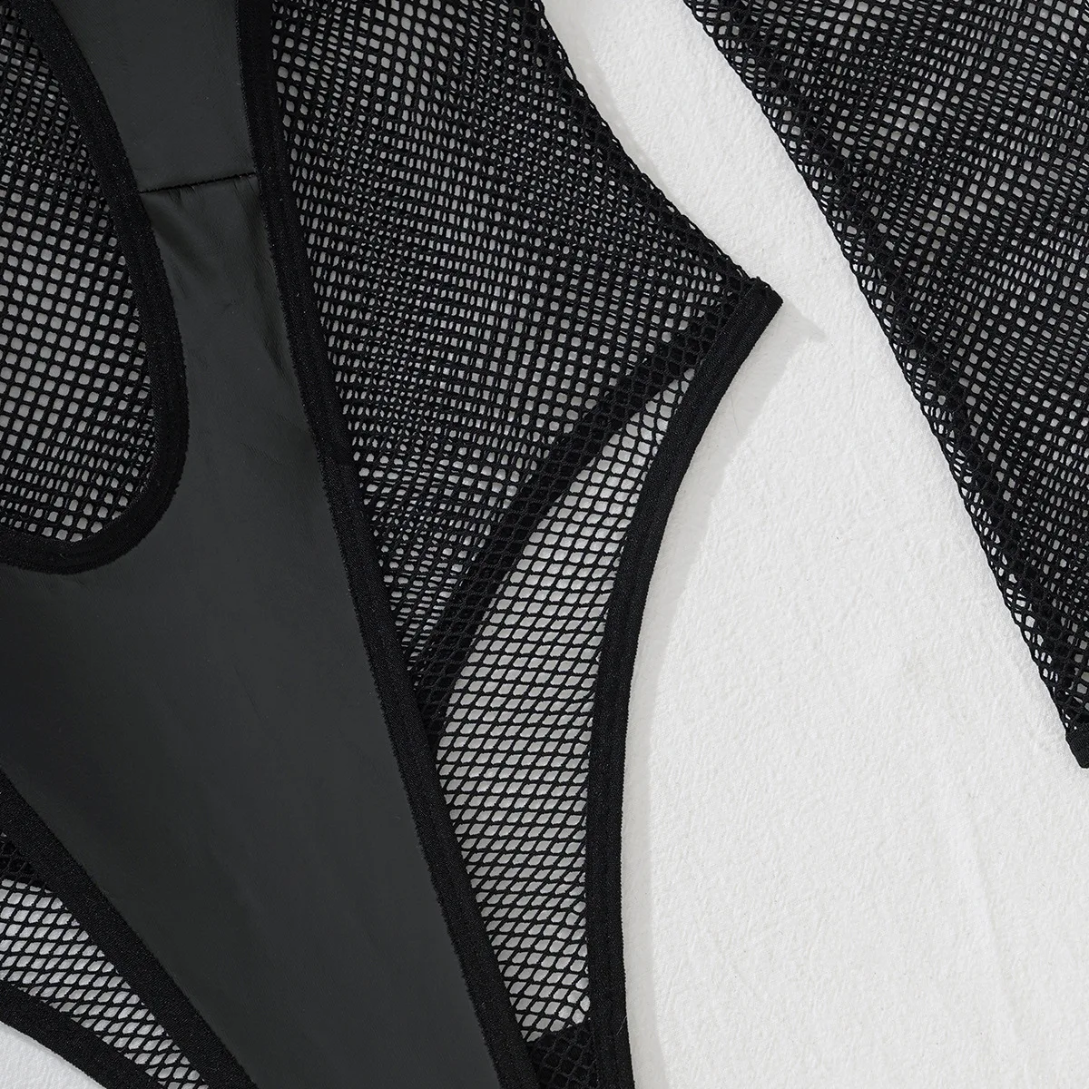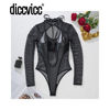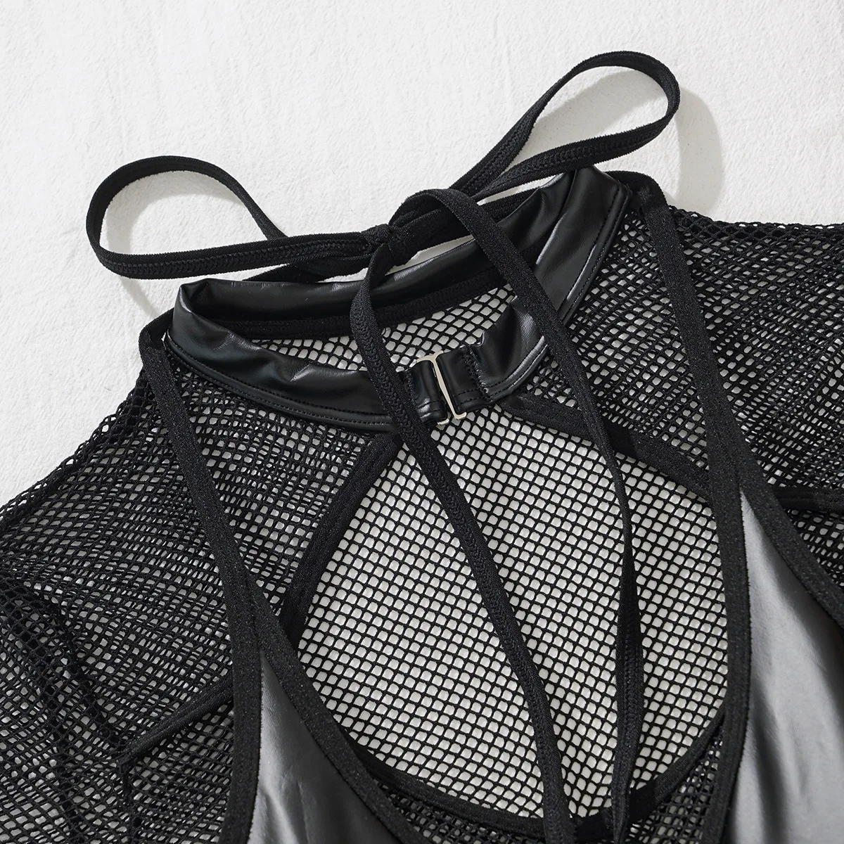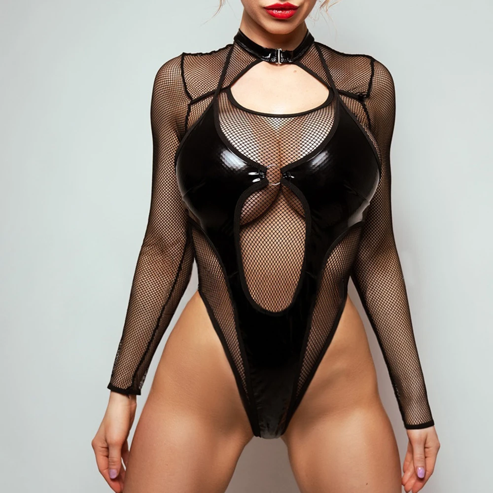 Diccvicc Long Sleeve Bodysuit Transparent Fishnet Clothing PU Leather Gothic Body Lingerie Sexy Underwear Women Exotic Costume