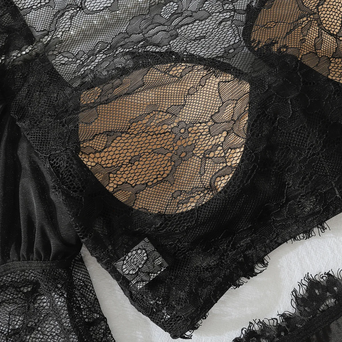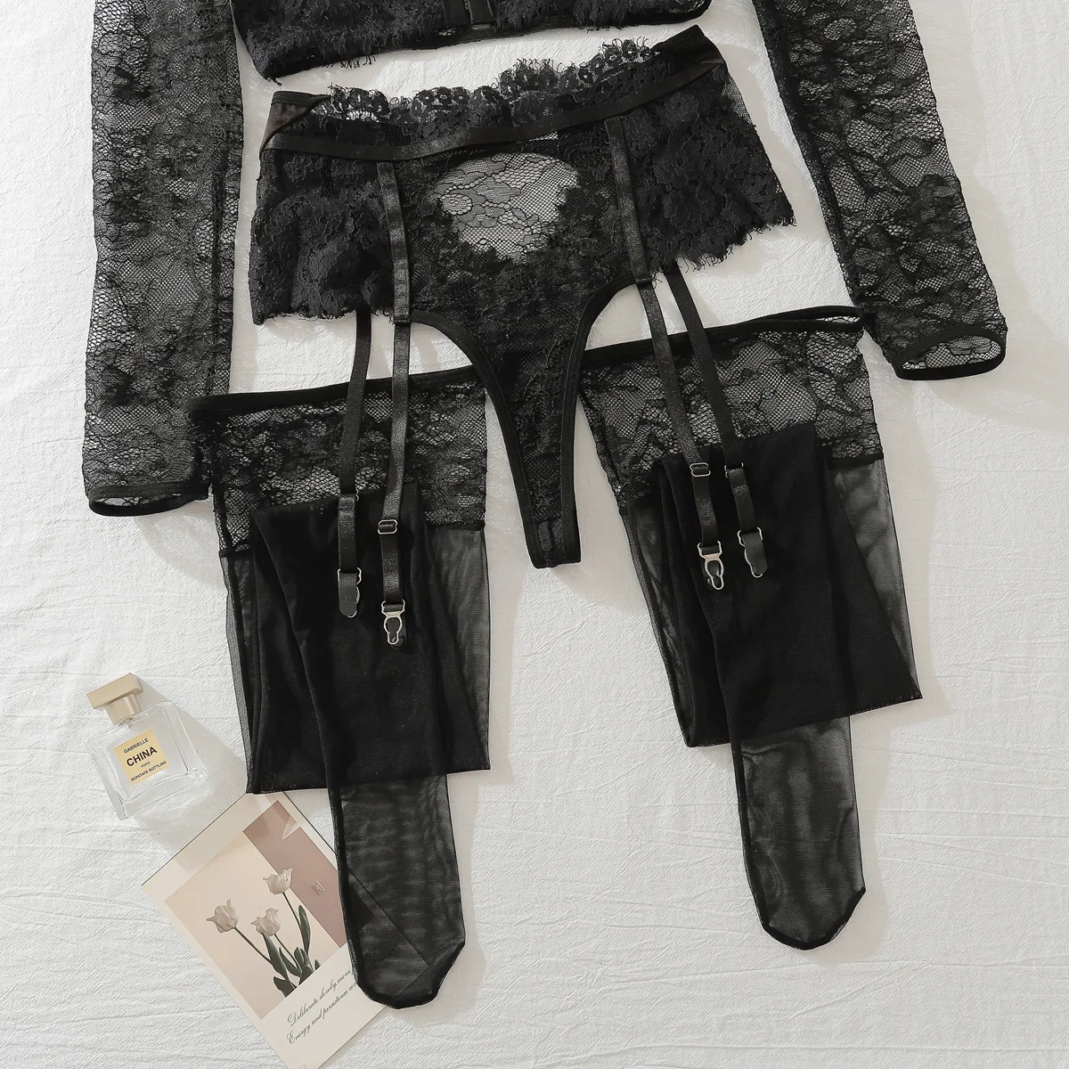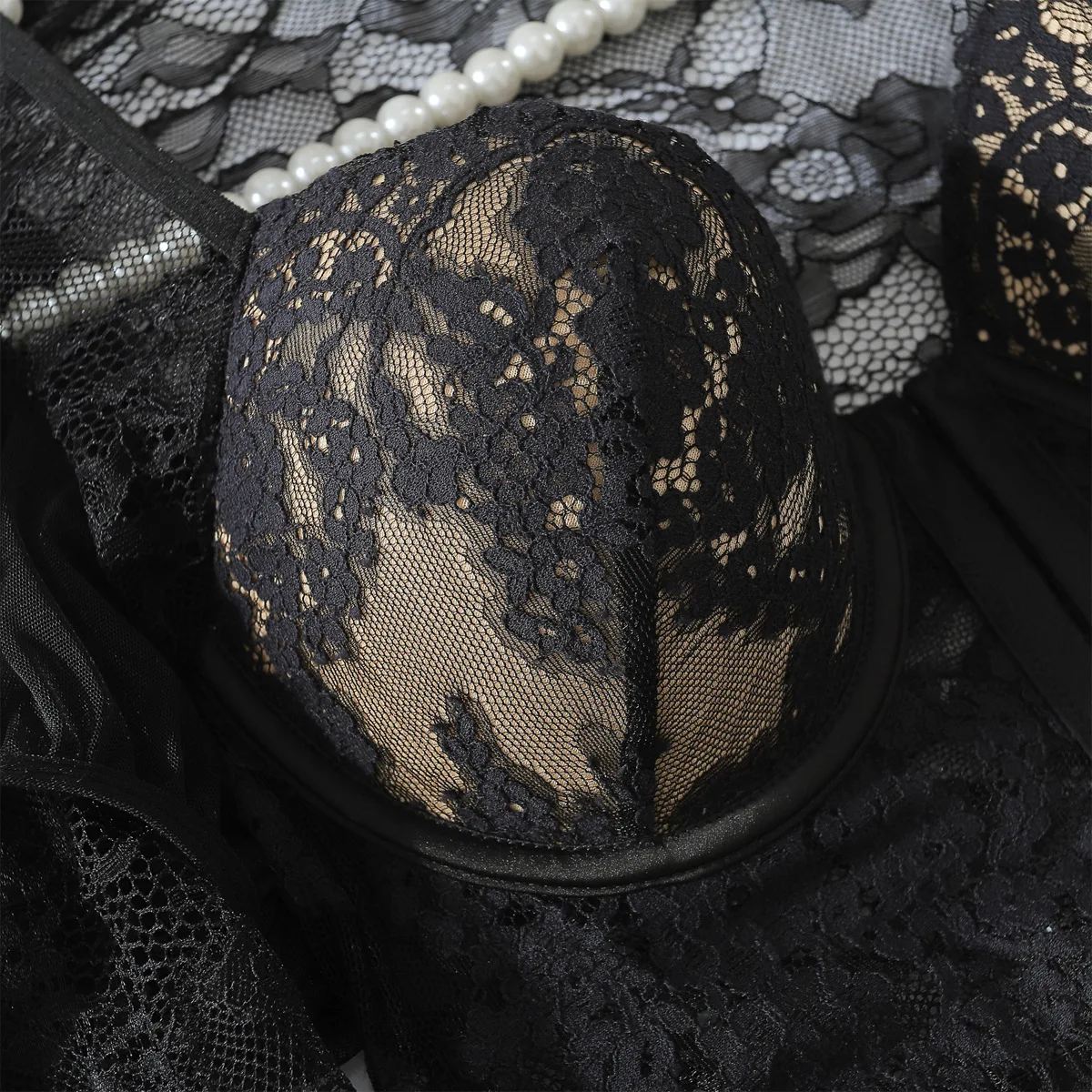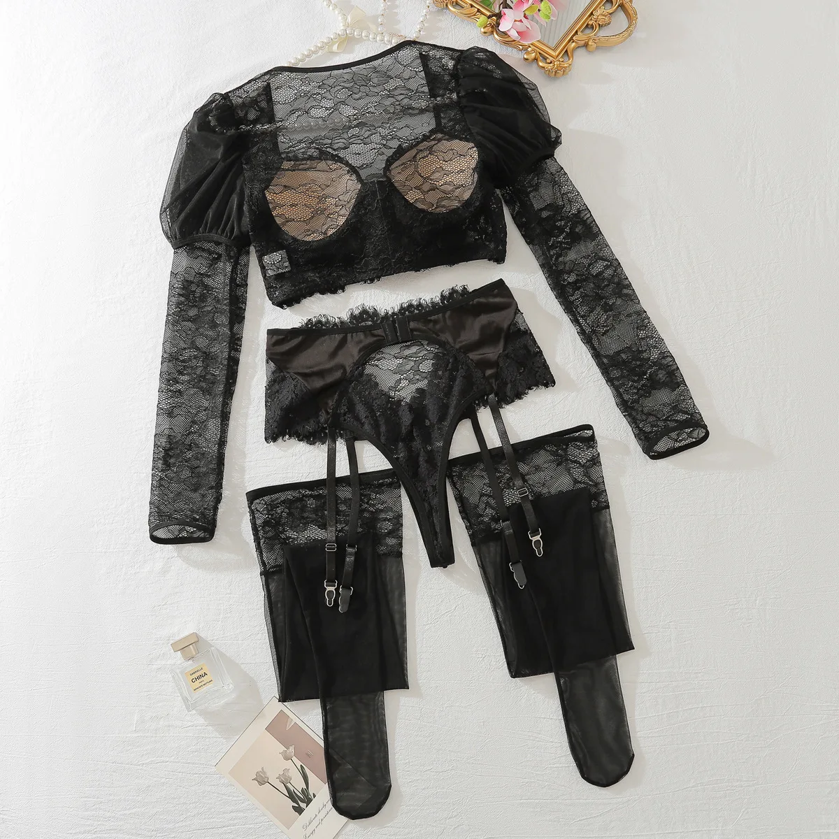 Diccvicc Long Sleeve Lingerie See Through Lace Sexy Tops Padded Bra Panty Set Vintage Women Underwear Intimate Kit Lady Dress