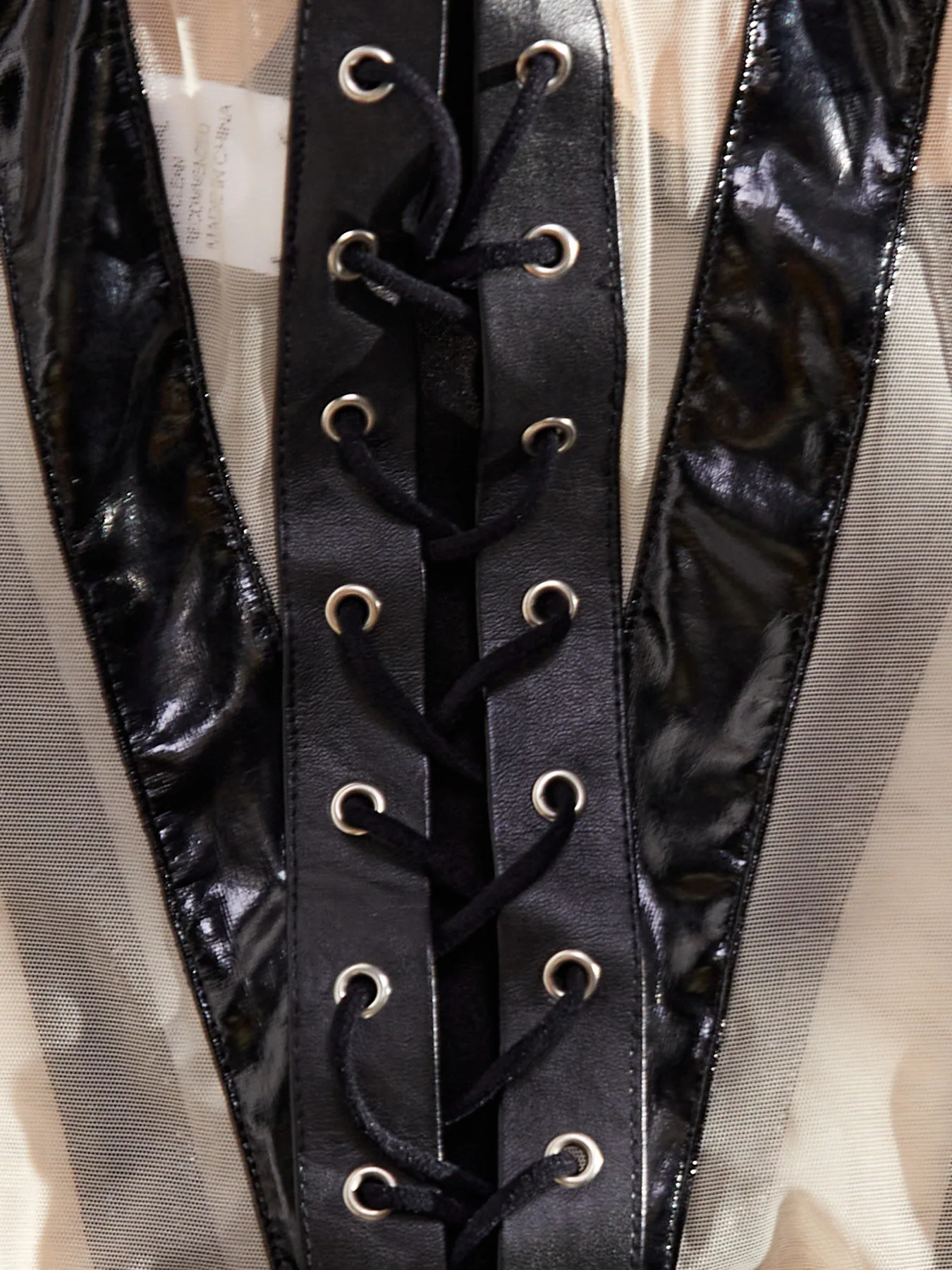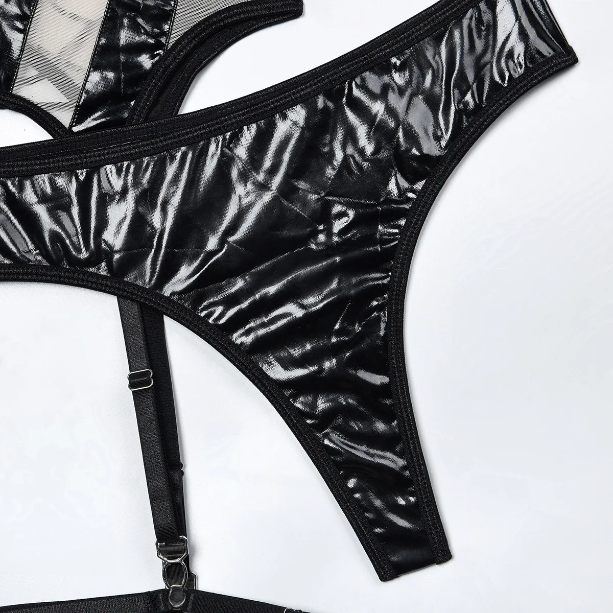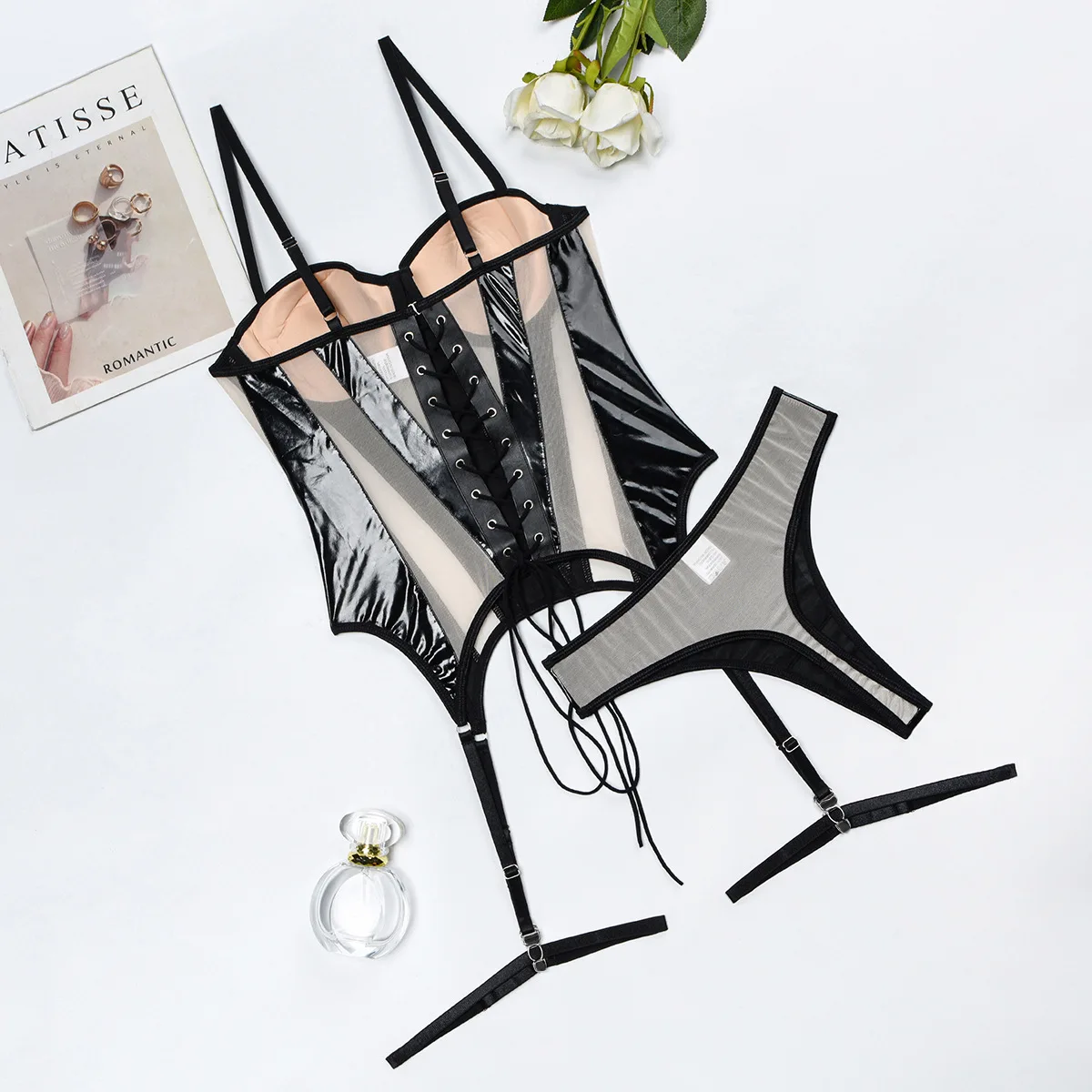 Diccvicc Patchwork Pantent PU Leather Lingerie Lace Up Back Closure Corset Tops Panty Set Sexy Bodysuit Underwear Exotic Outfits