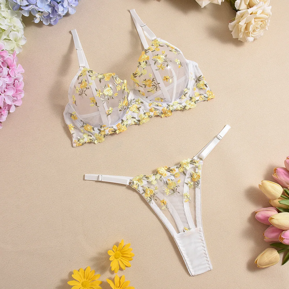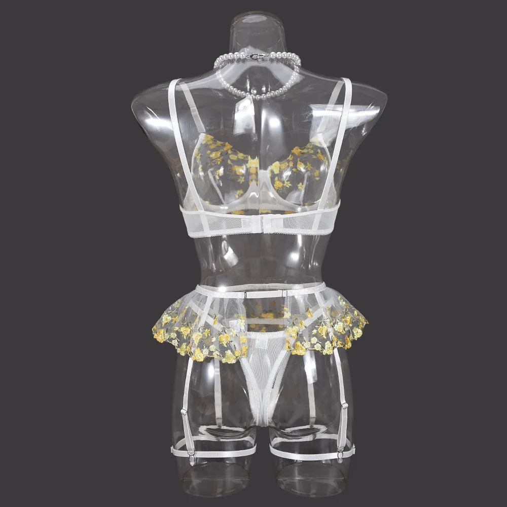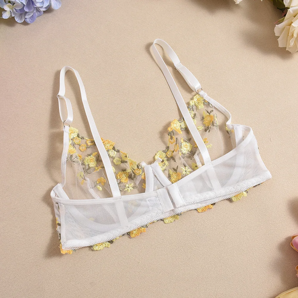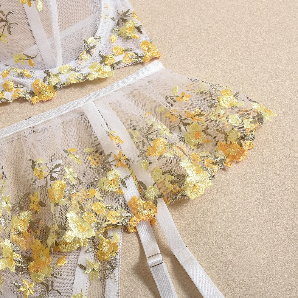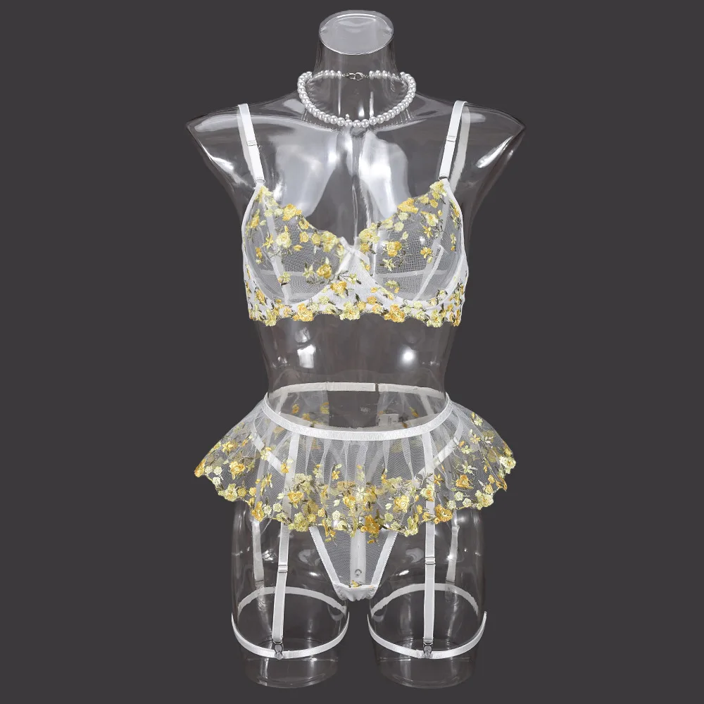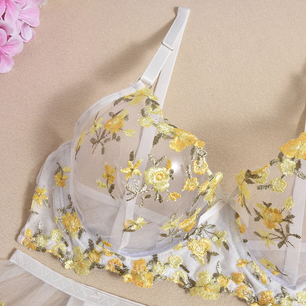 Diccvicc Ruffle Garter Lingerie See Through Mesh Embroidery Floral Sexy Underwear Cute Girl Exotic Bra Panty Set Intimate Outfit