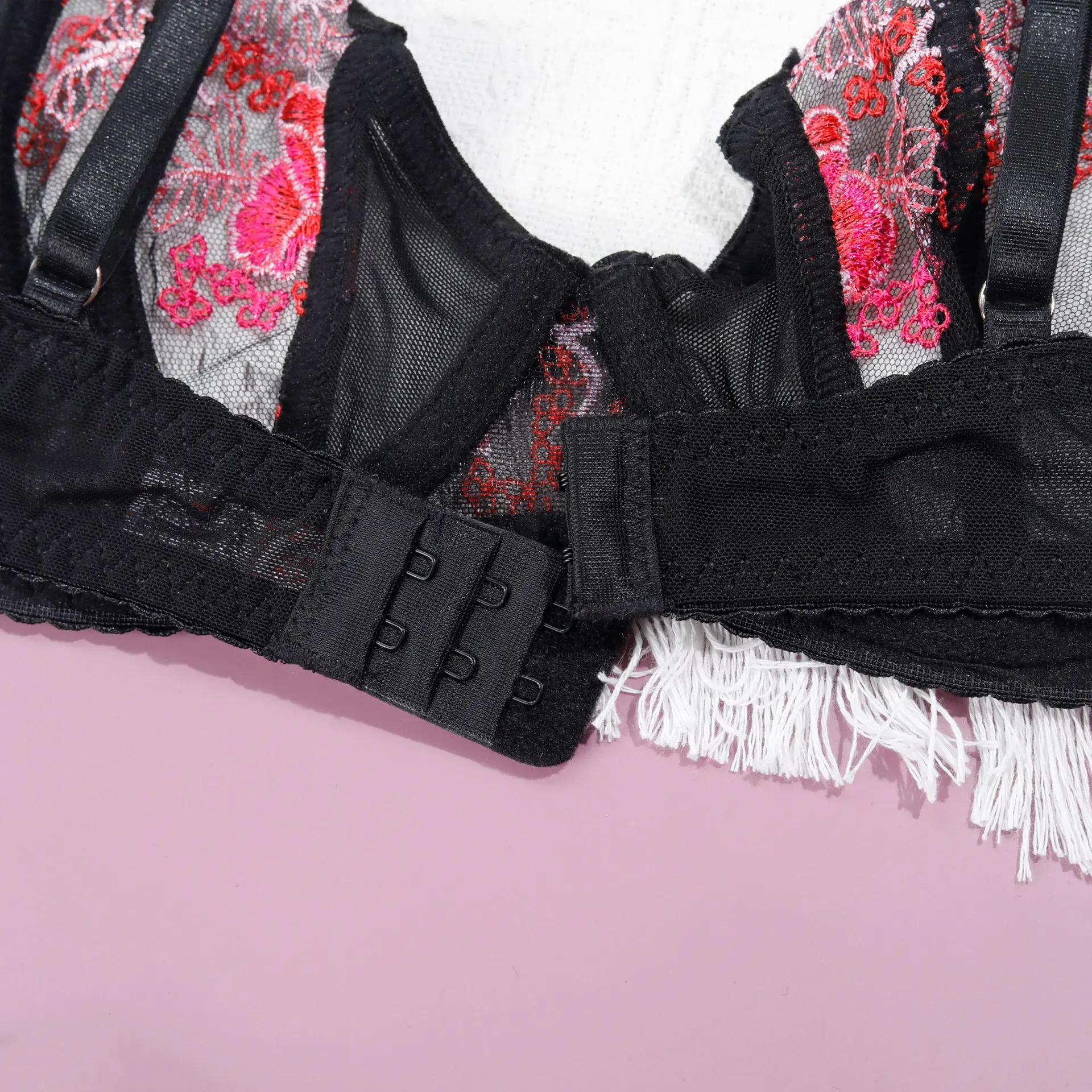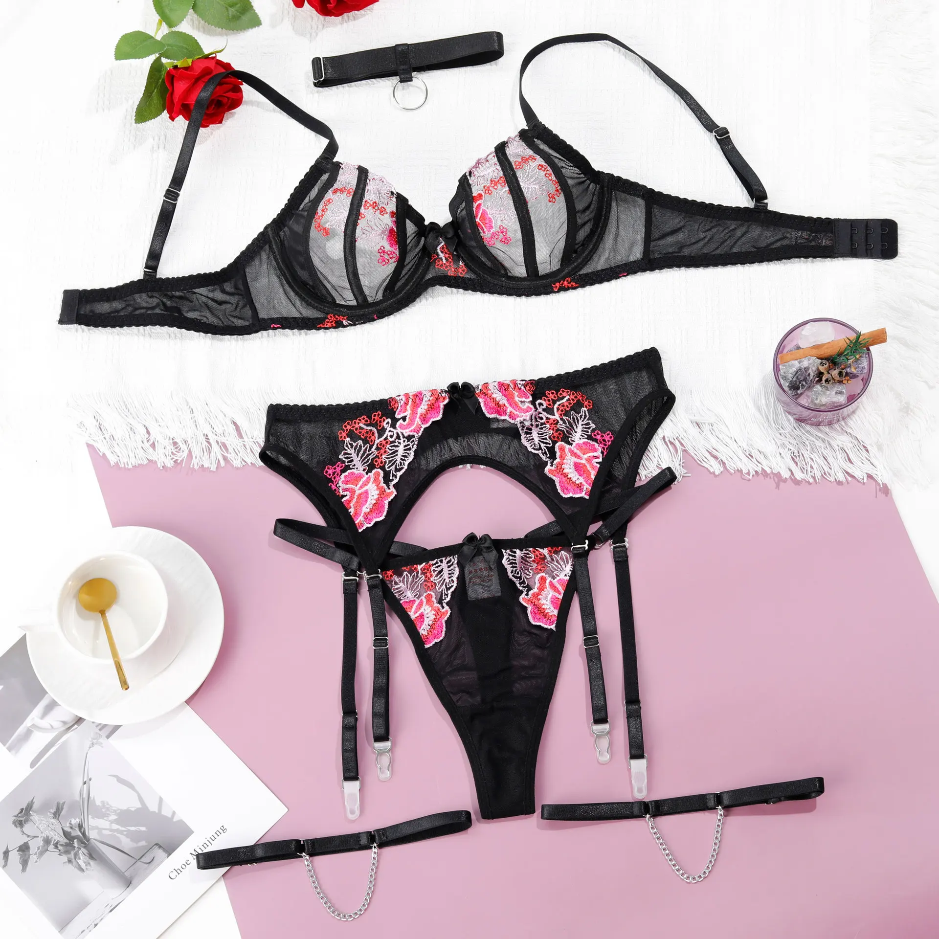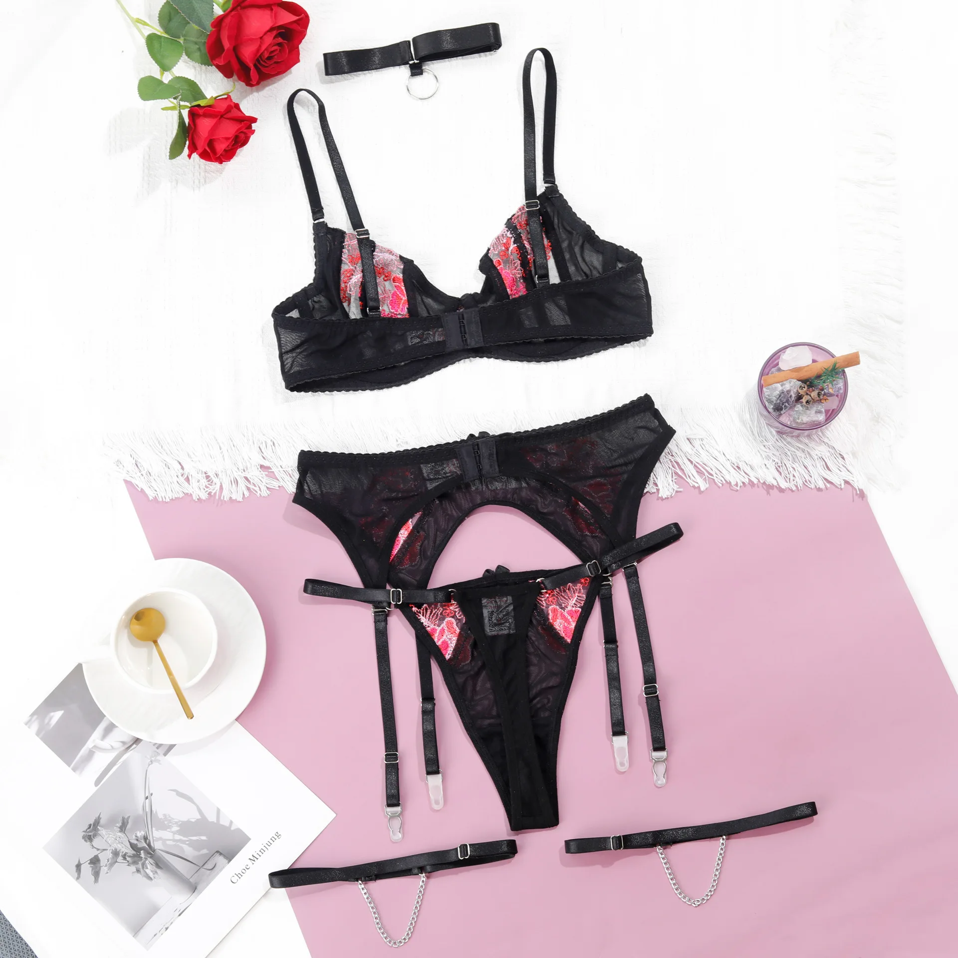 Diccvicc Sexy Female Lingerie with Chain Embroidery Floral Lace Bra Panty Set Garter Belt Woman Fancy Underwear Hot Intimate Set