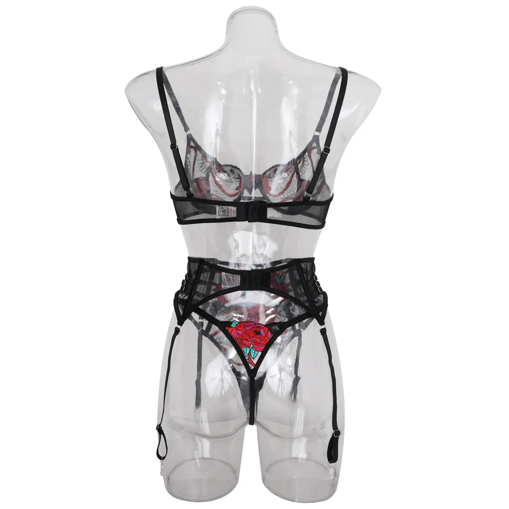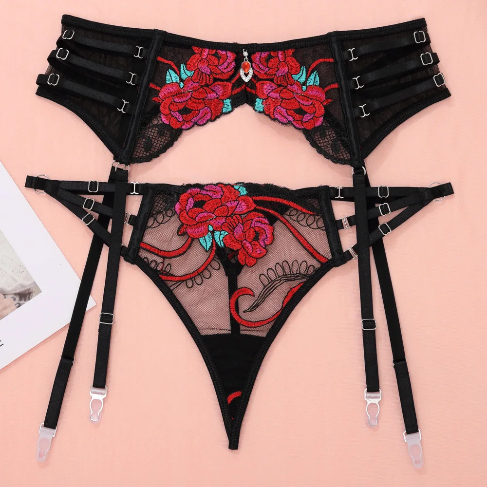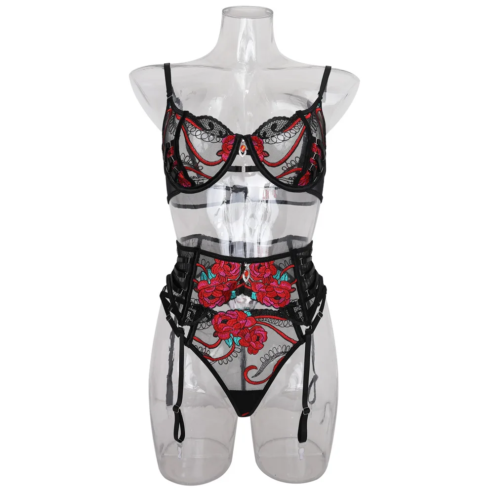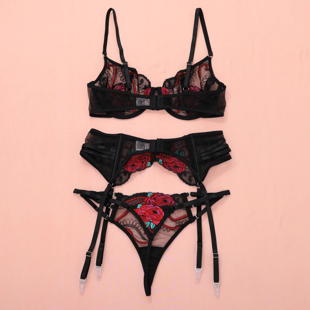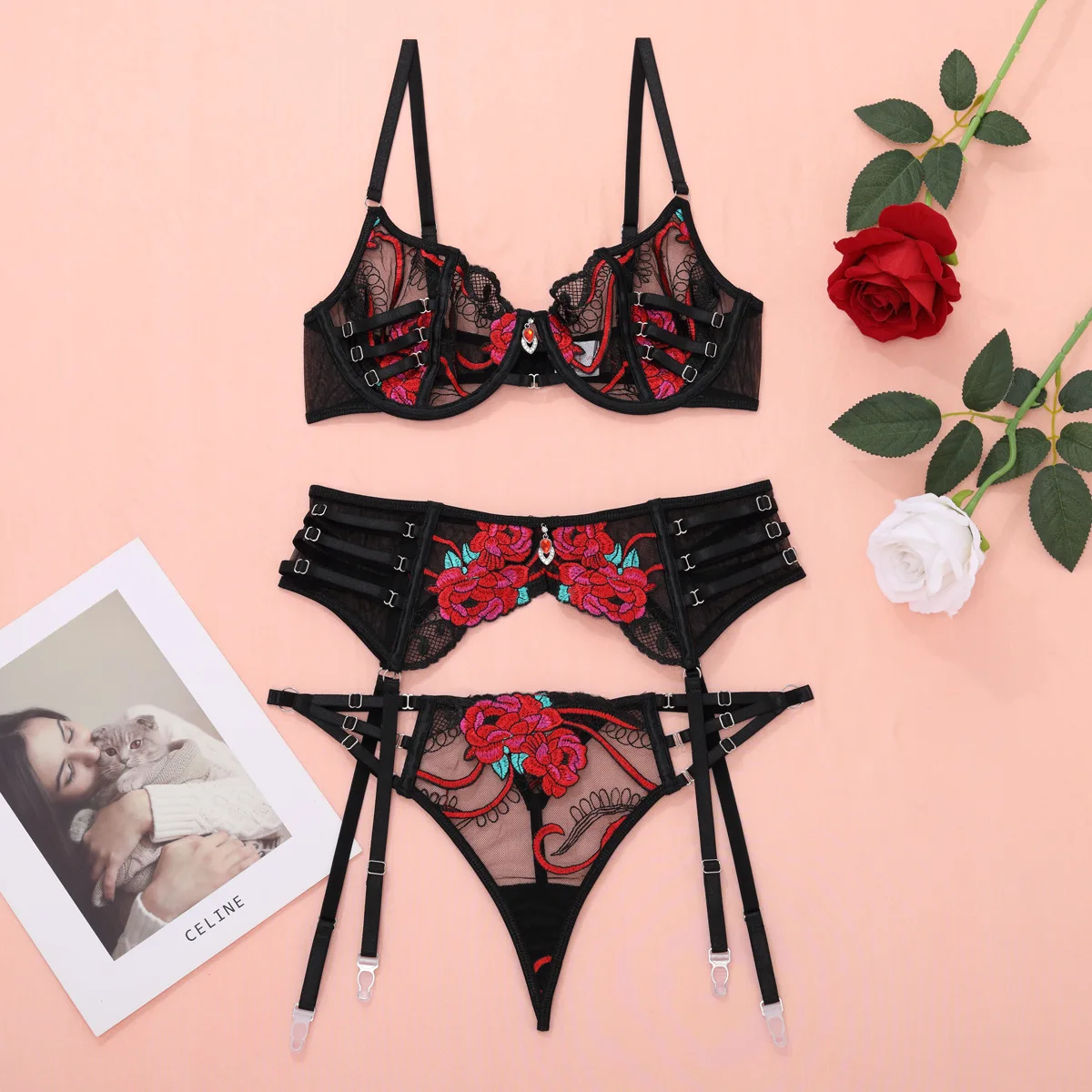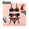 Diccvicc Sexy Lingerie Rose Floral Embroidery See Through Lace Underwear Fine Women Set 3 Pieces Exotic Costume Intimate Outfits