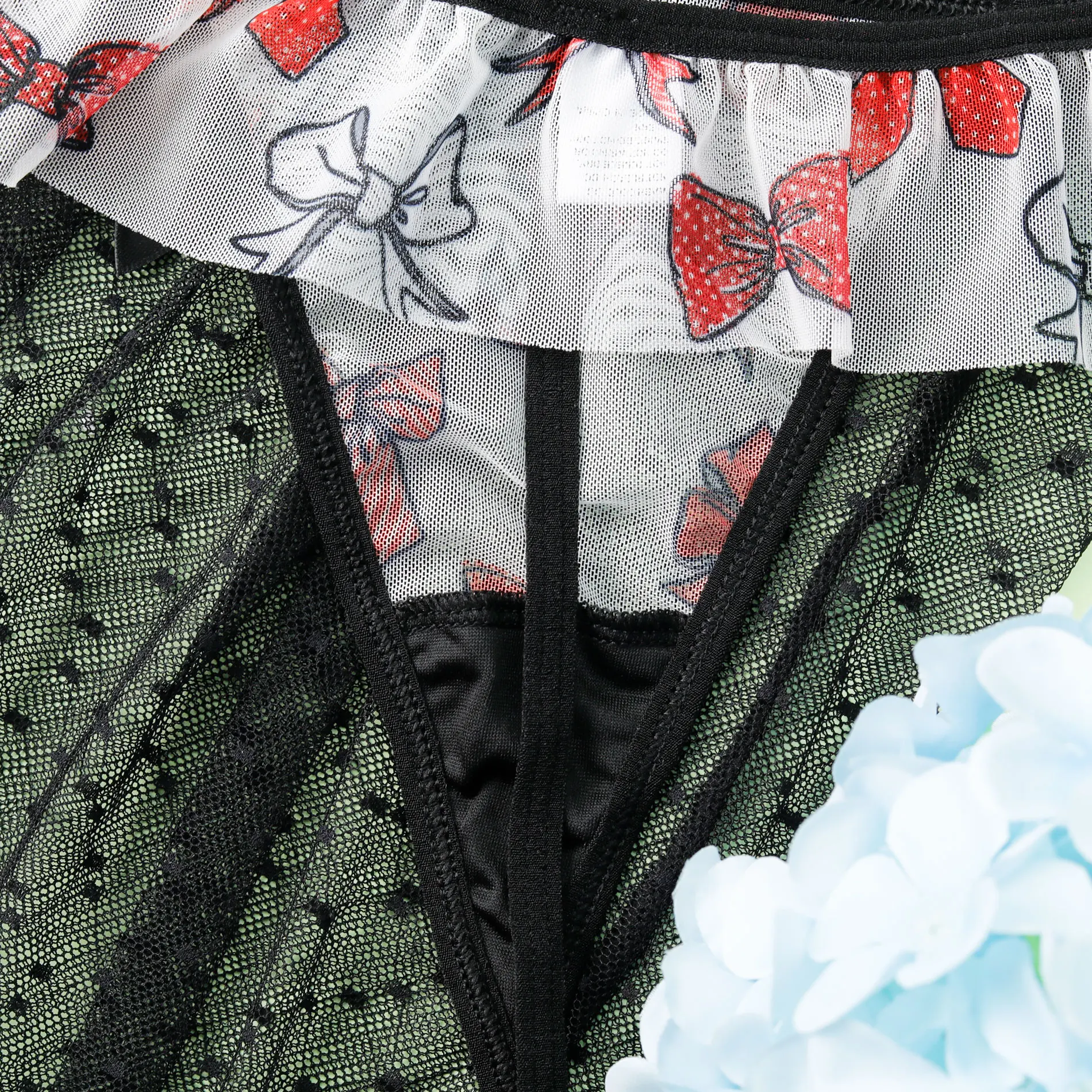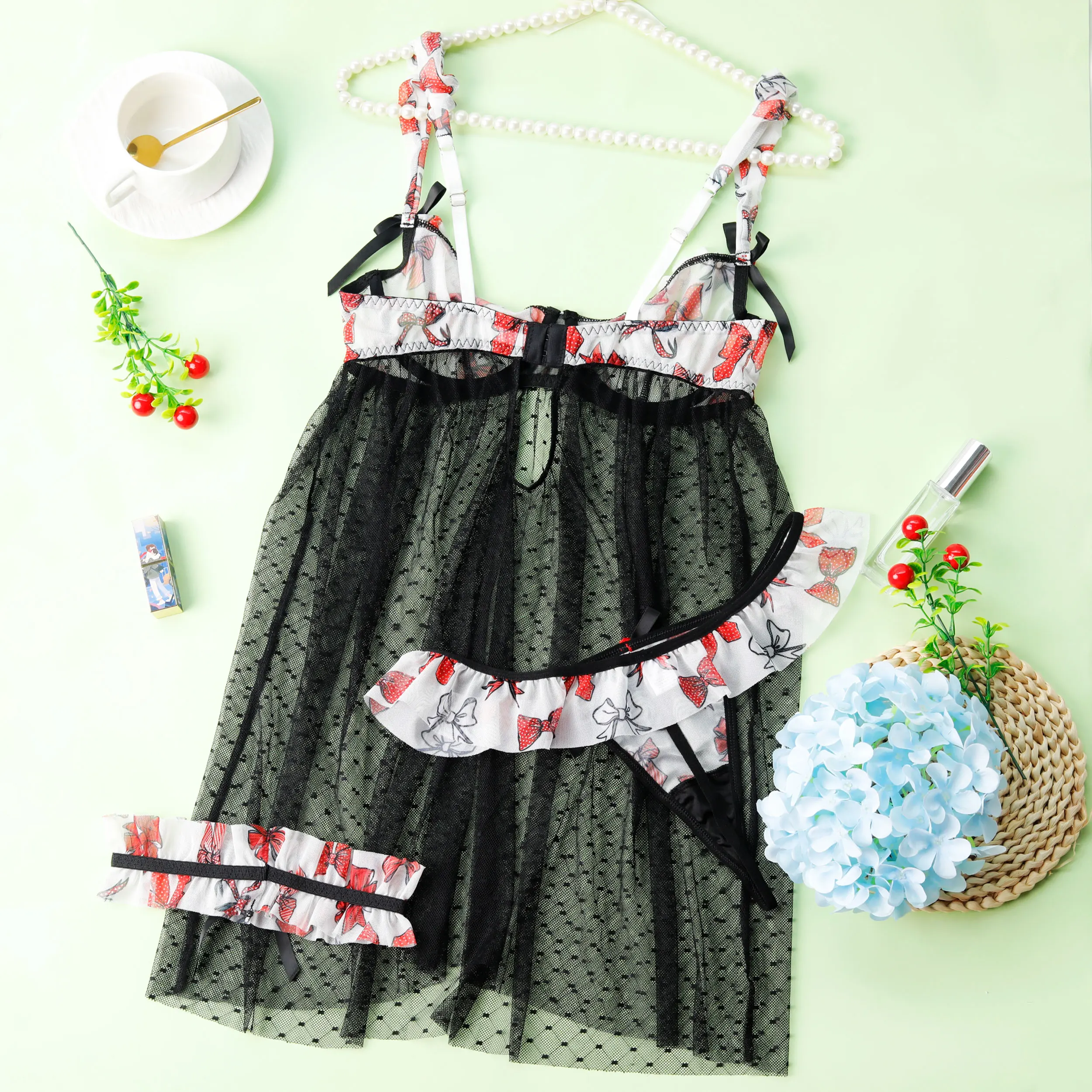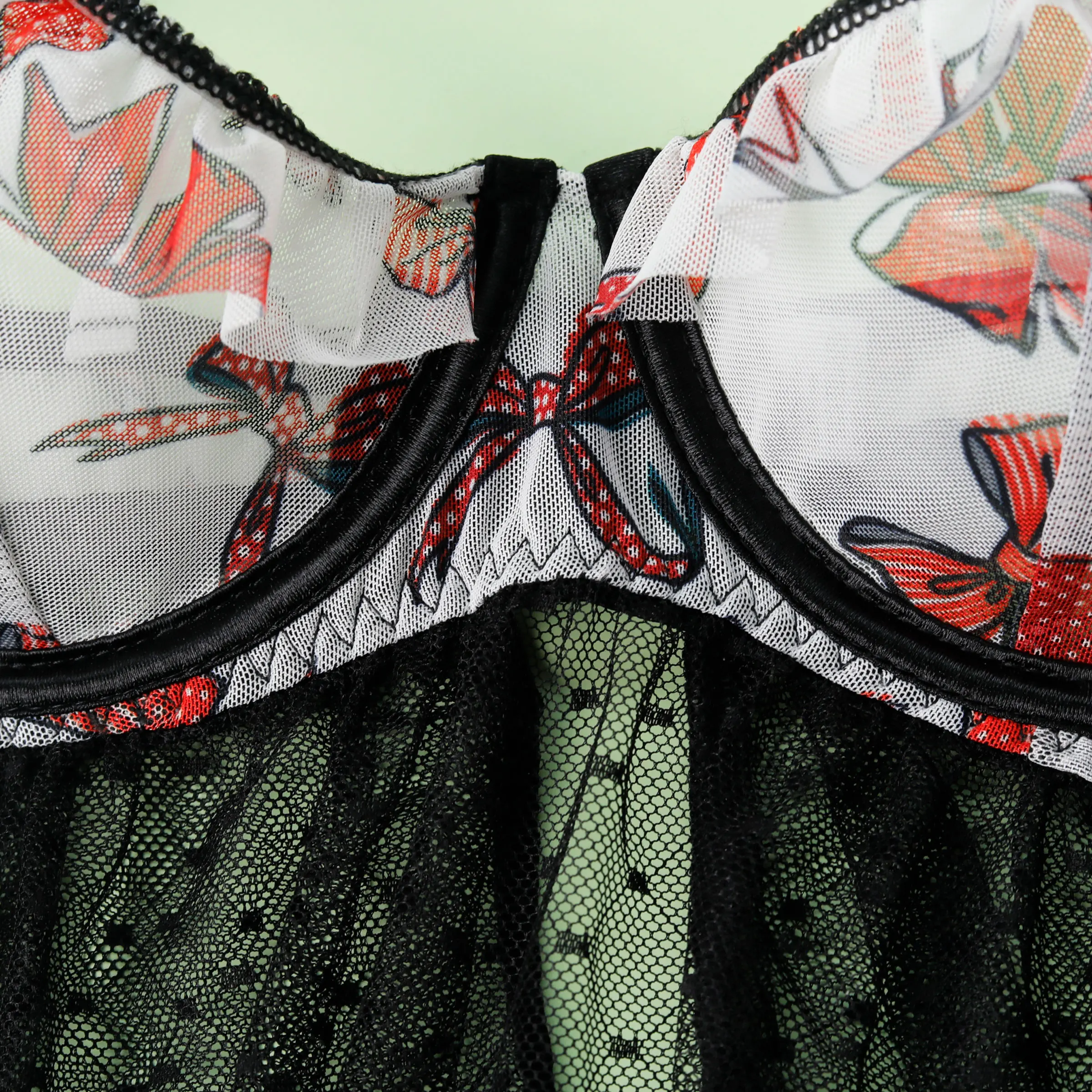 Diccvicc Sleepwear for Woman Bowknot Pattern Print Bra Panty Set Sheer Mesh Nightgown Sexy See Through Night Dress Exotic Outfit