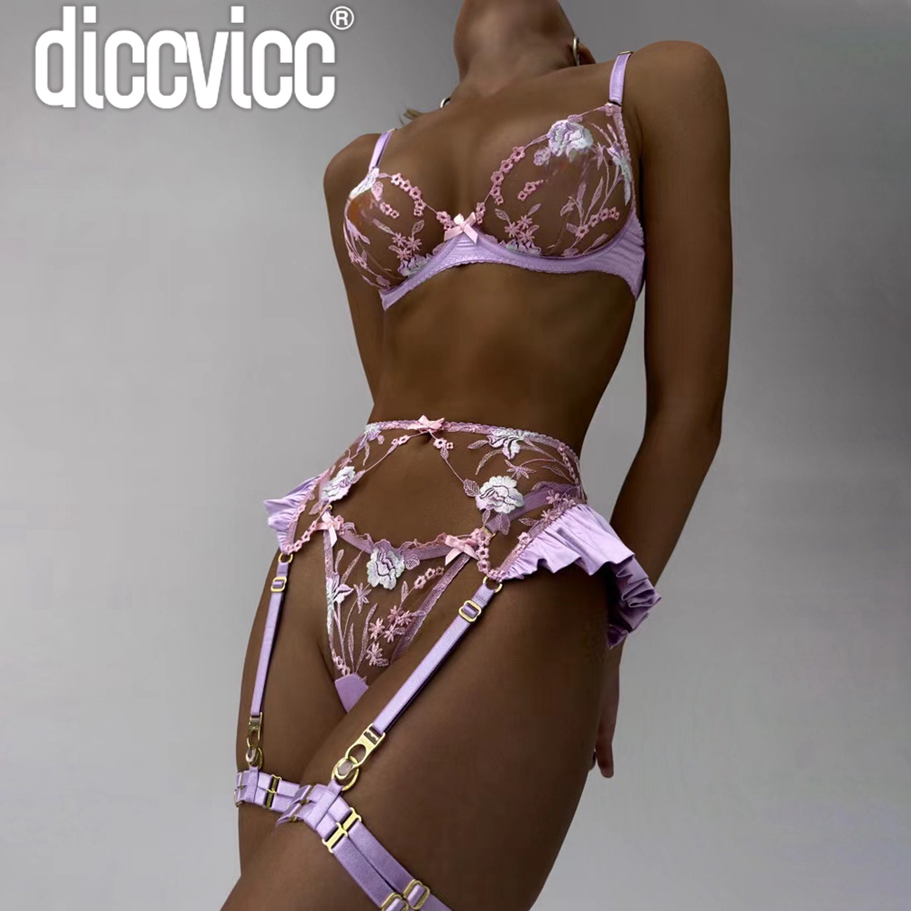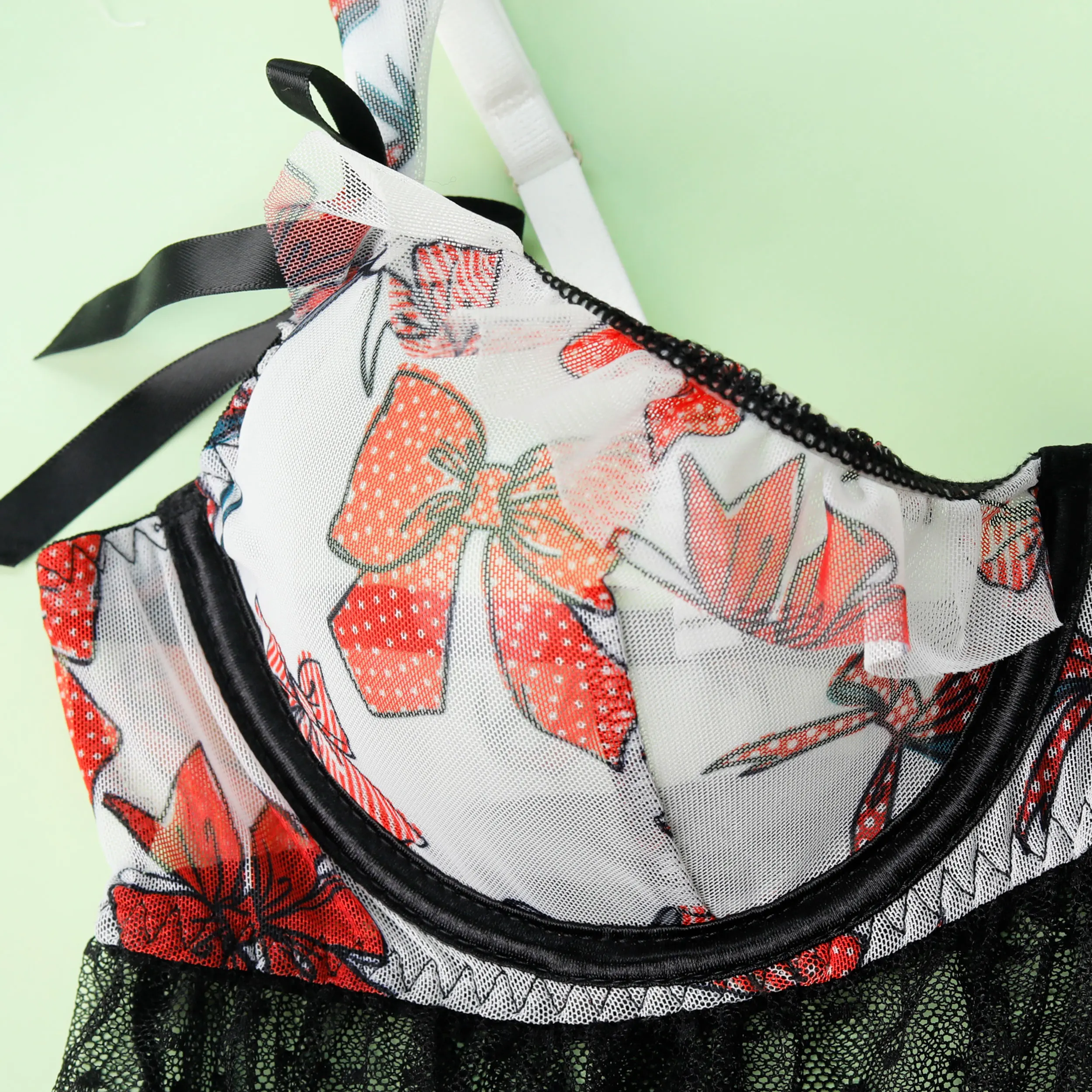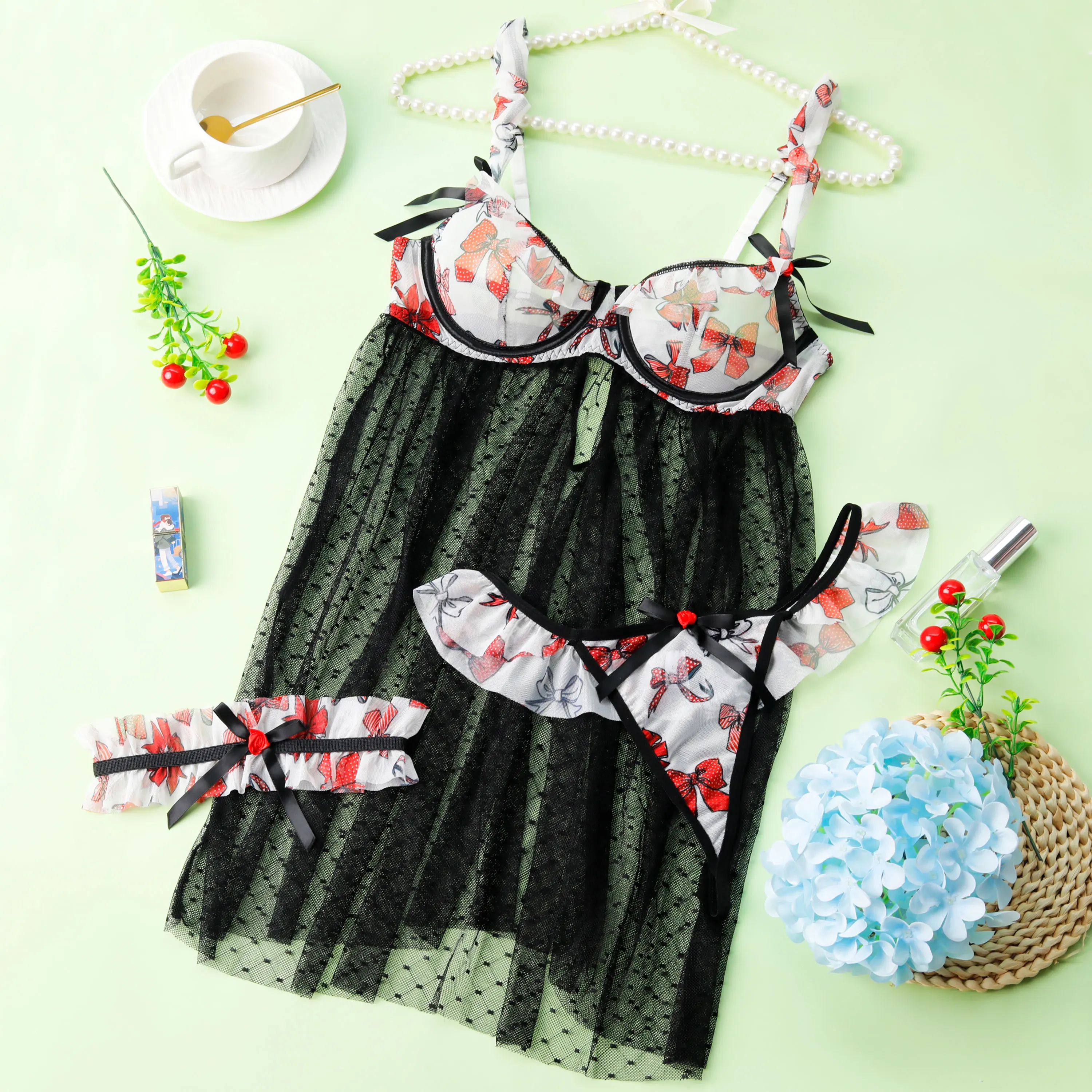 Diccvicc Sleepwear for Woman Bowknot Pattern Print Bra Panty Set Sheer Mesh Nightgown Sexy See Through Night Dress Exotic Outfit