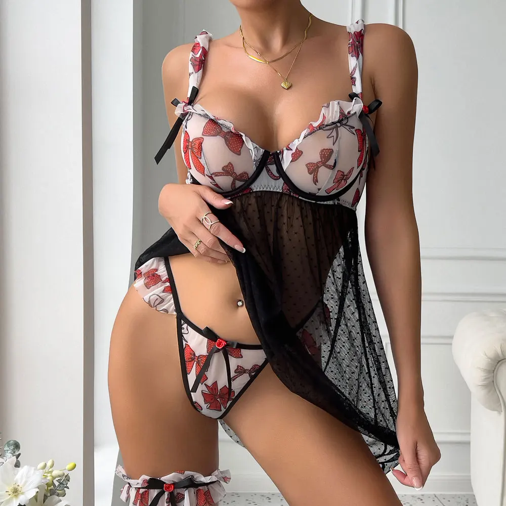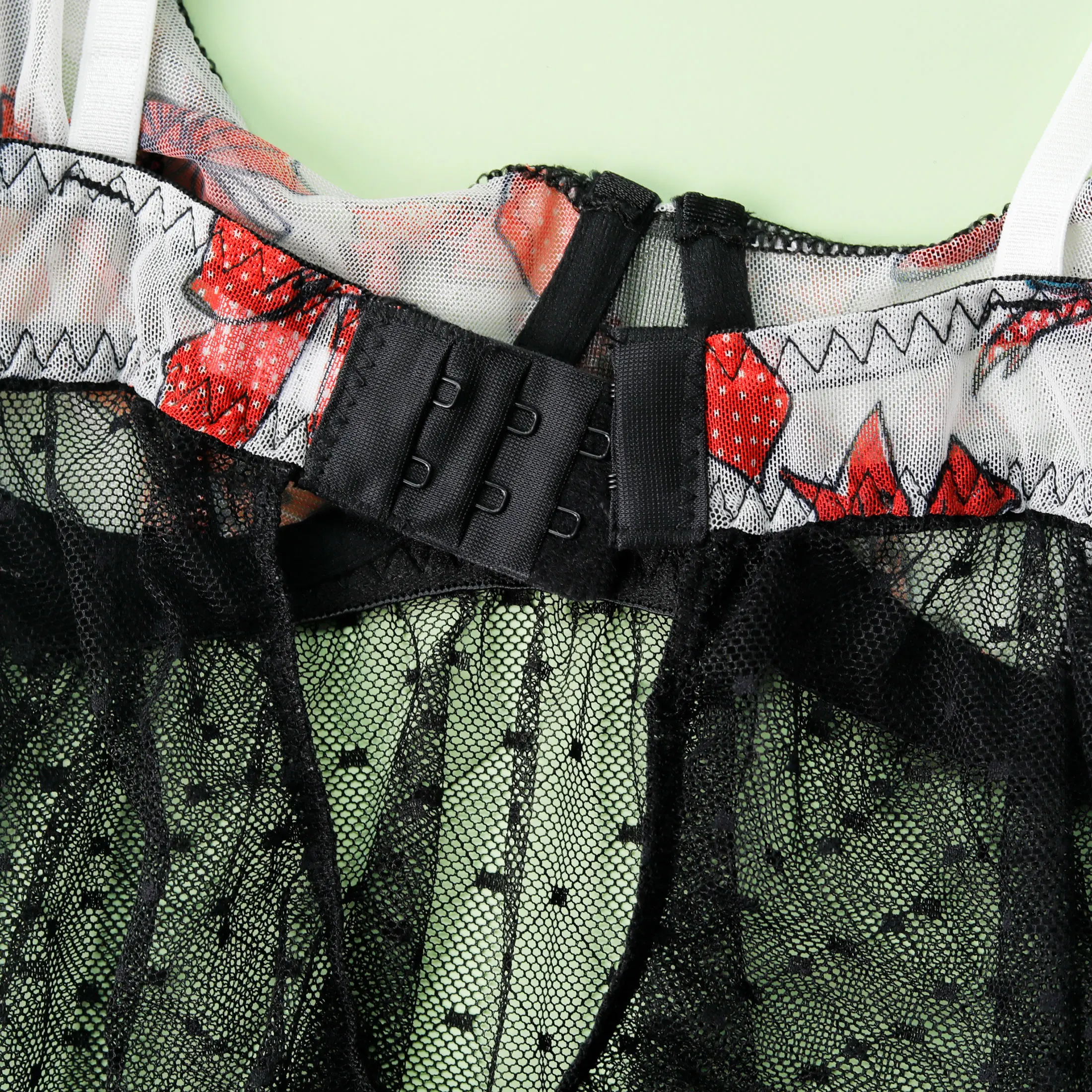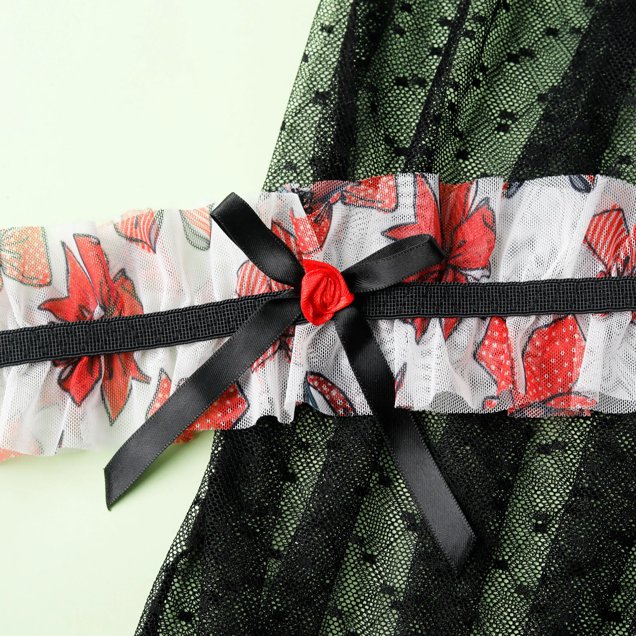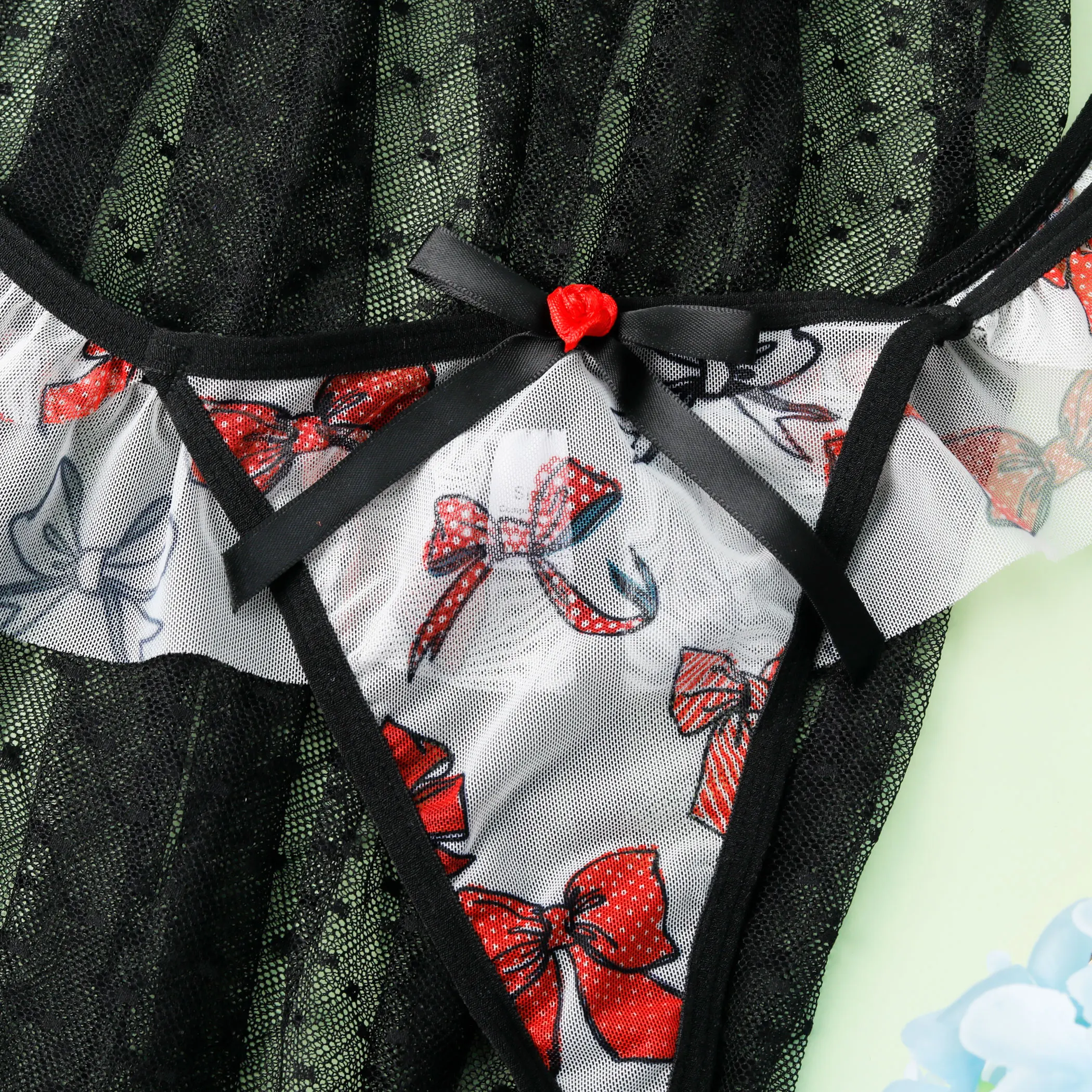 Featuring a bowknot pattern print and sheer mesh design, this nightgown exudes elegance and sexiness.
