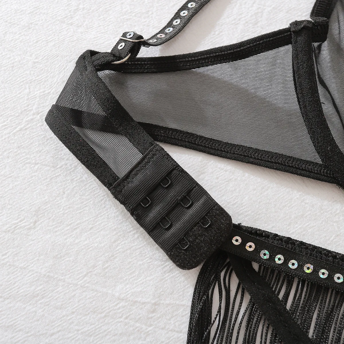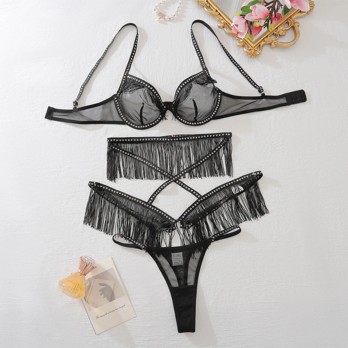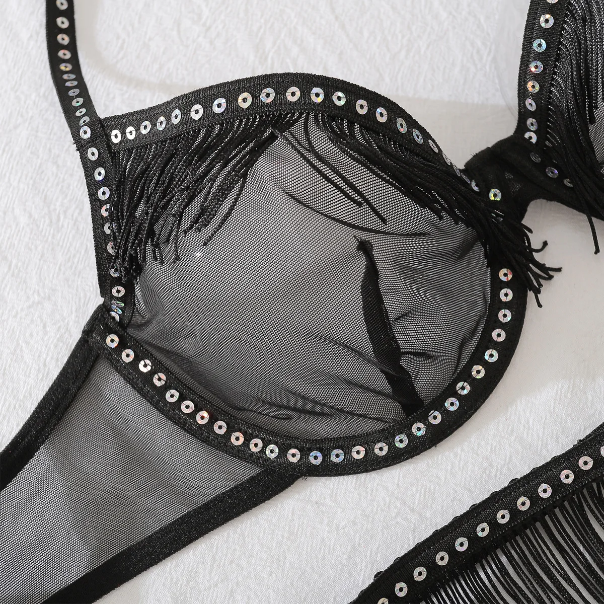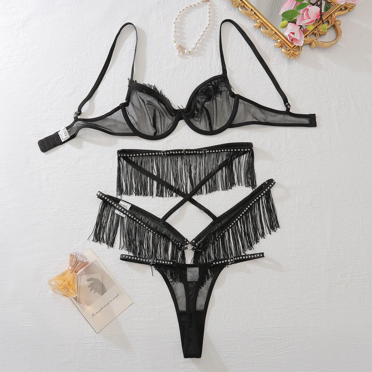 Diccvicc Tassel Lingerie See Through Sexy Lace Bra Garter Thong Set Women Romantic Underwear Intimate Kit Exotic Party Clothes