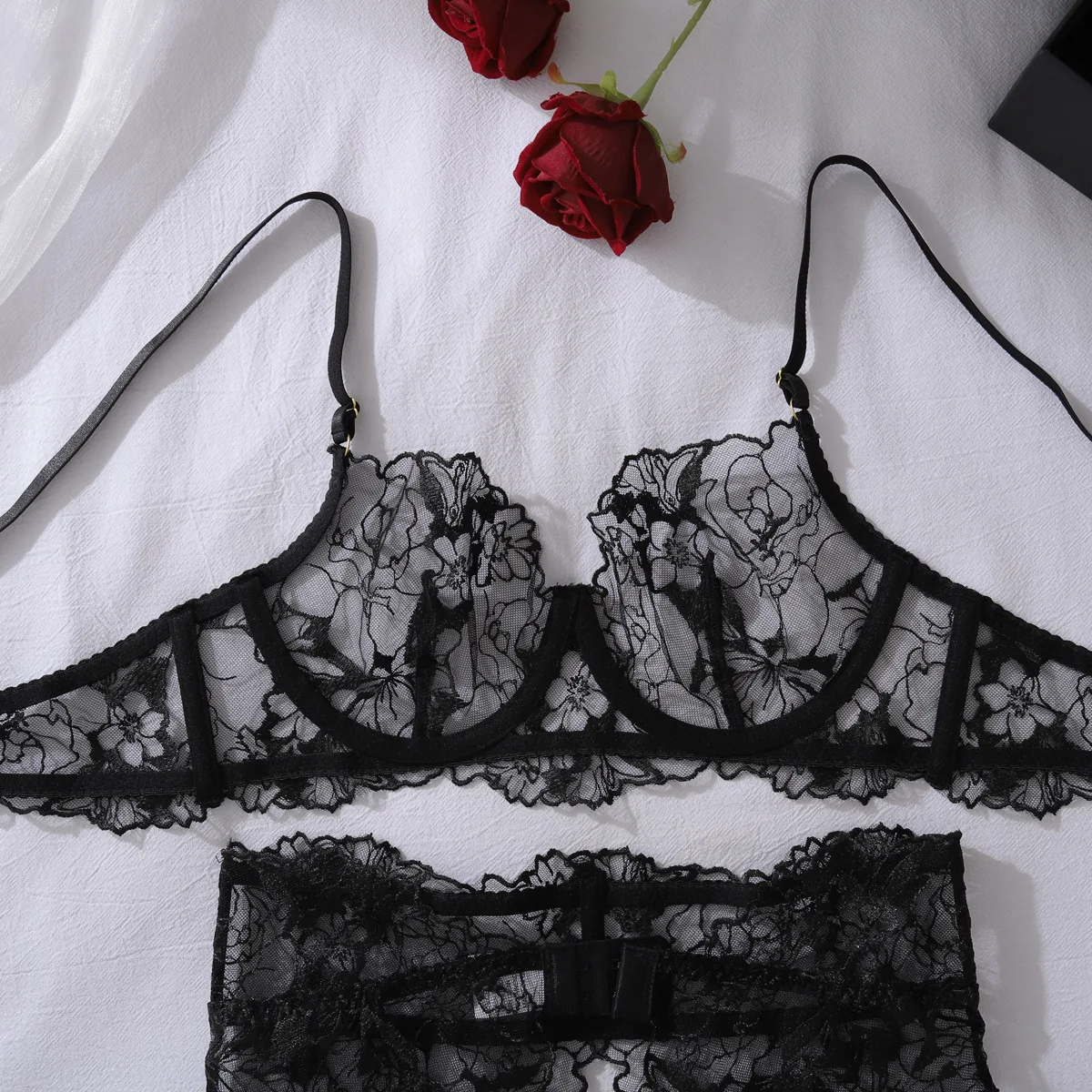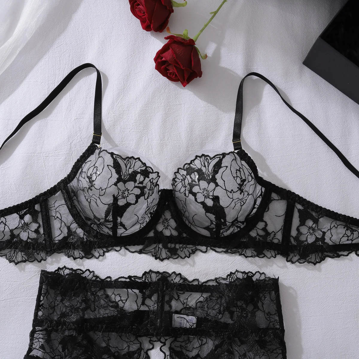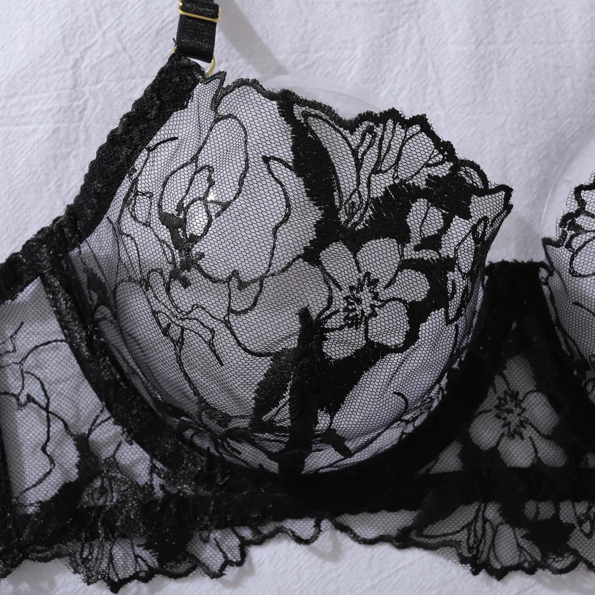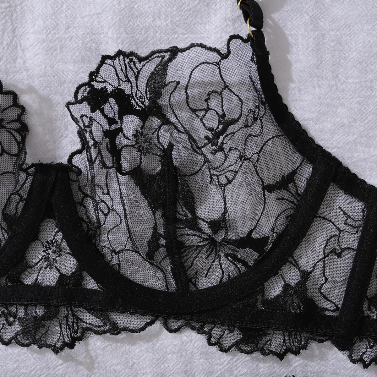 Diccvicc Transparent Floral Lingerie Embroidery Lace Bra Panty Set Fancy Garter Belt Underwear Elegant Woman Romantic Intimate