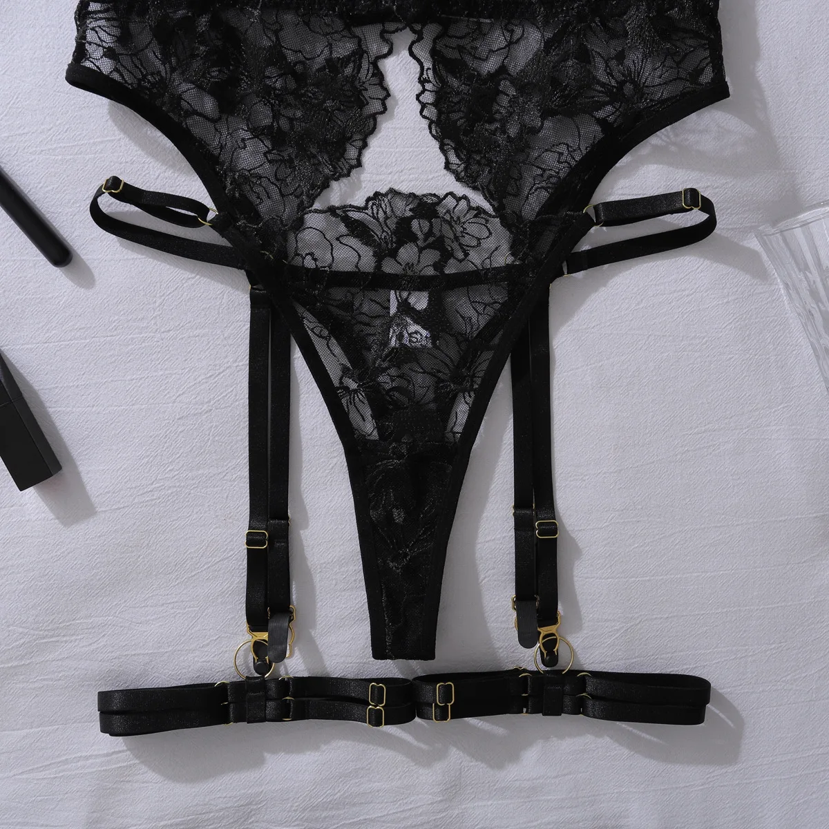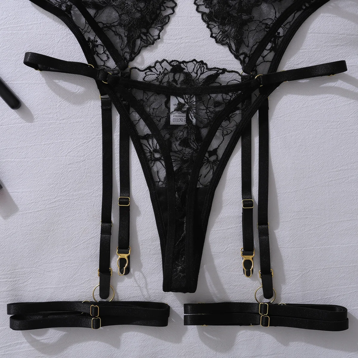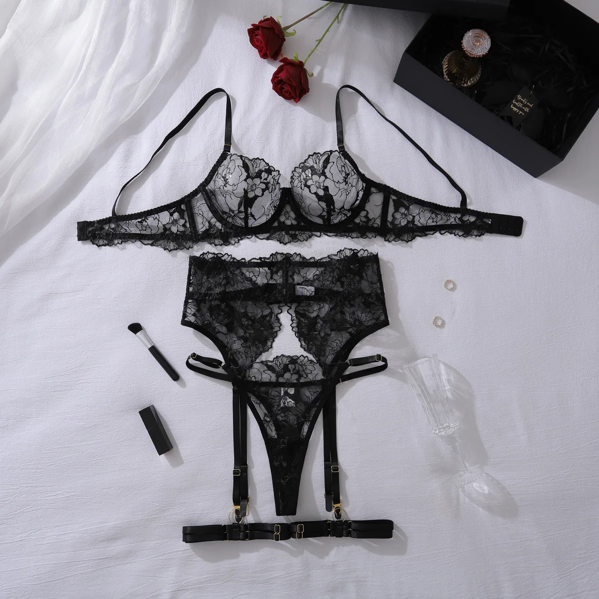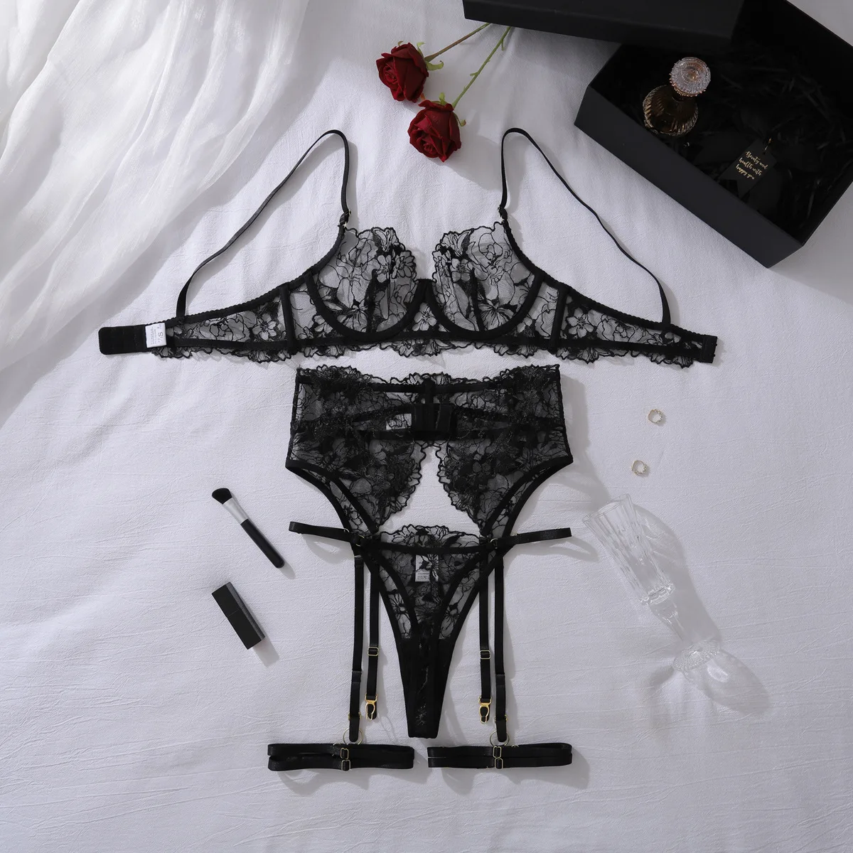 Diccvicc Transparent Floral Lingerie Embroidery Lace Bra Panty Set Fancy Garter Belt Underwear Elegant Woman Romantic Intimate