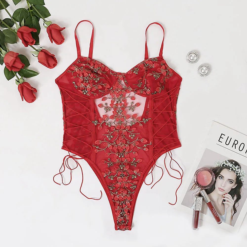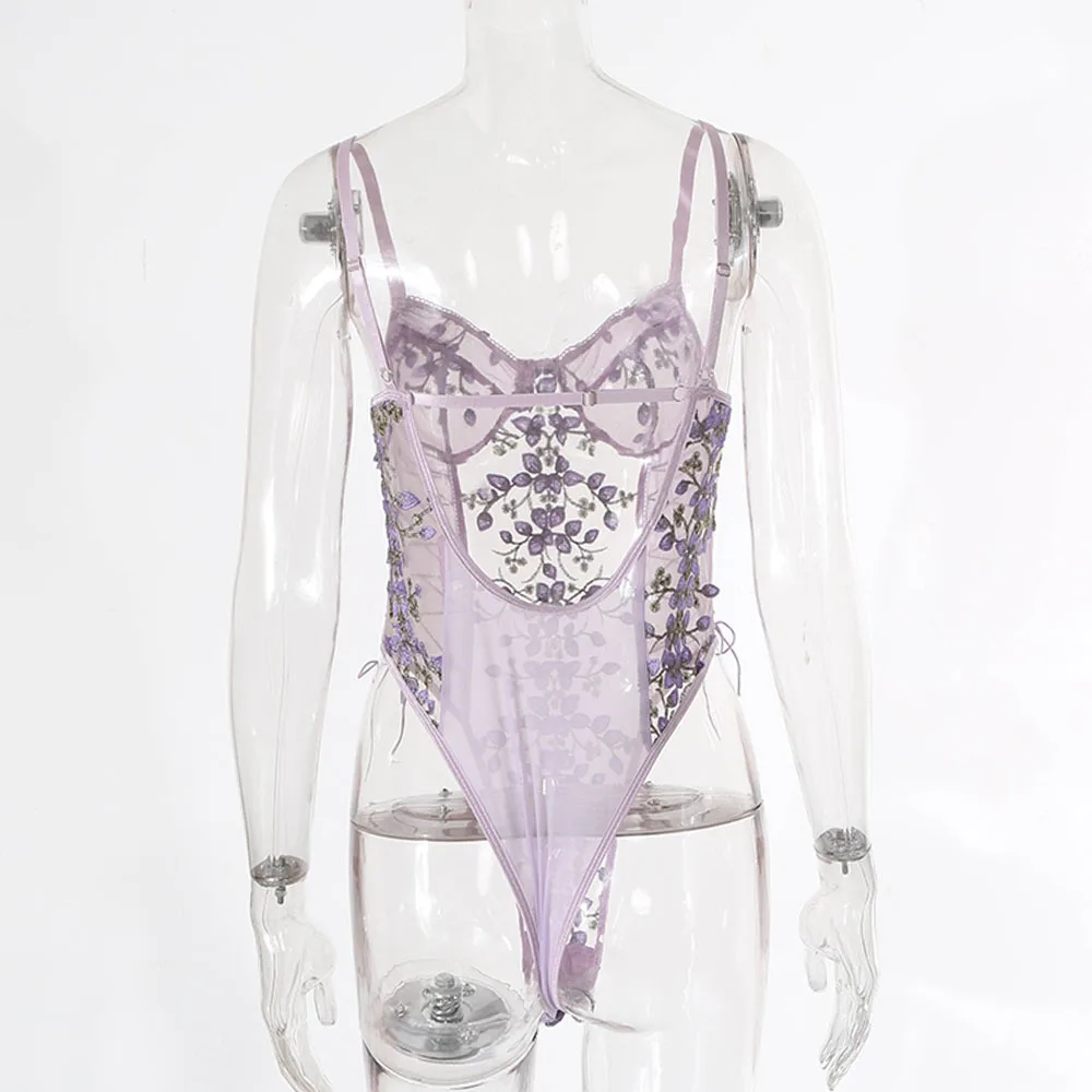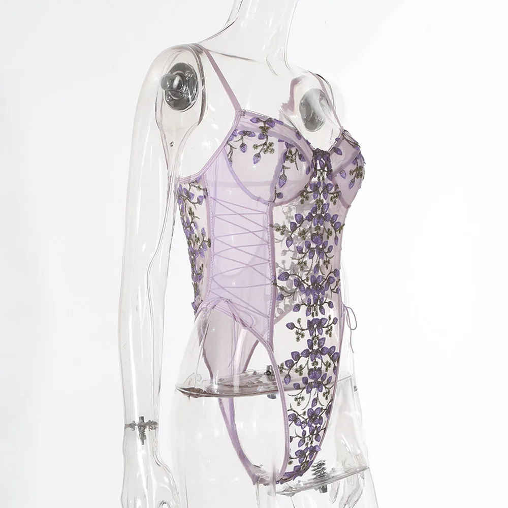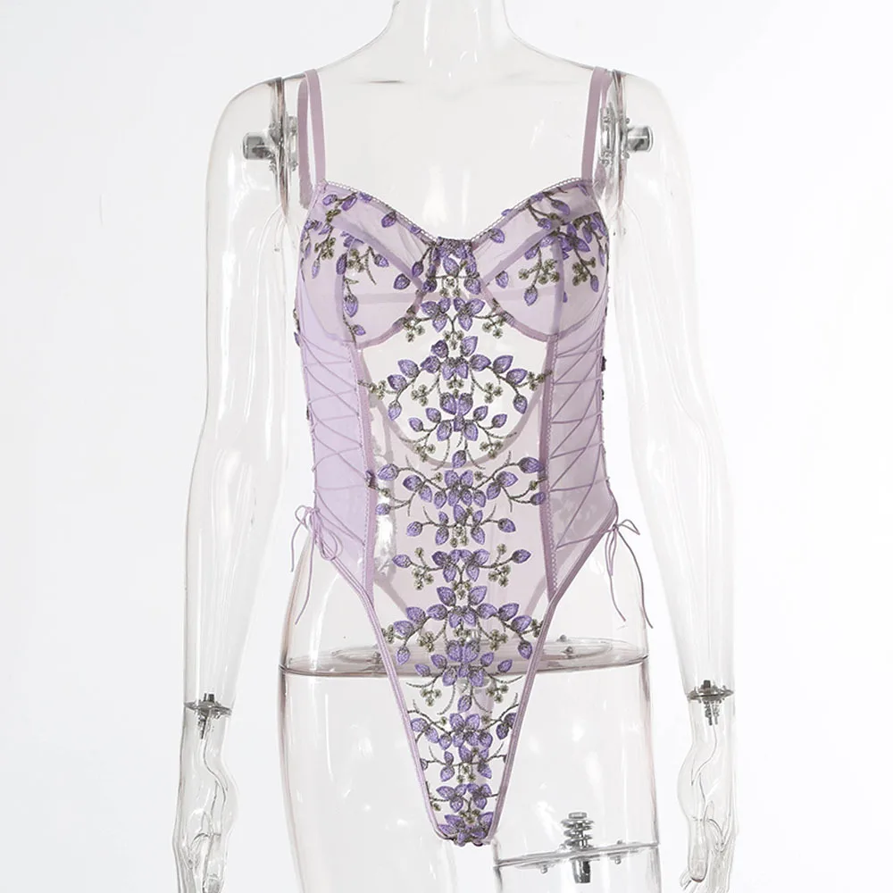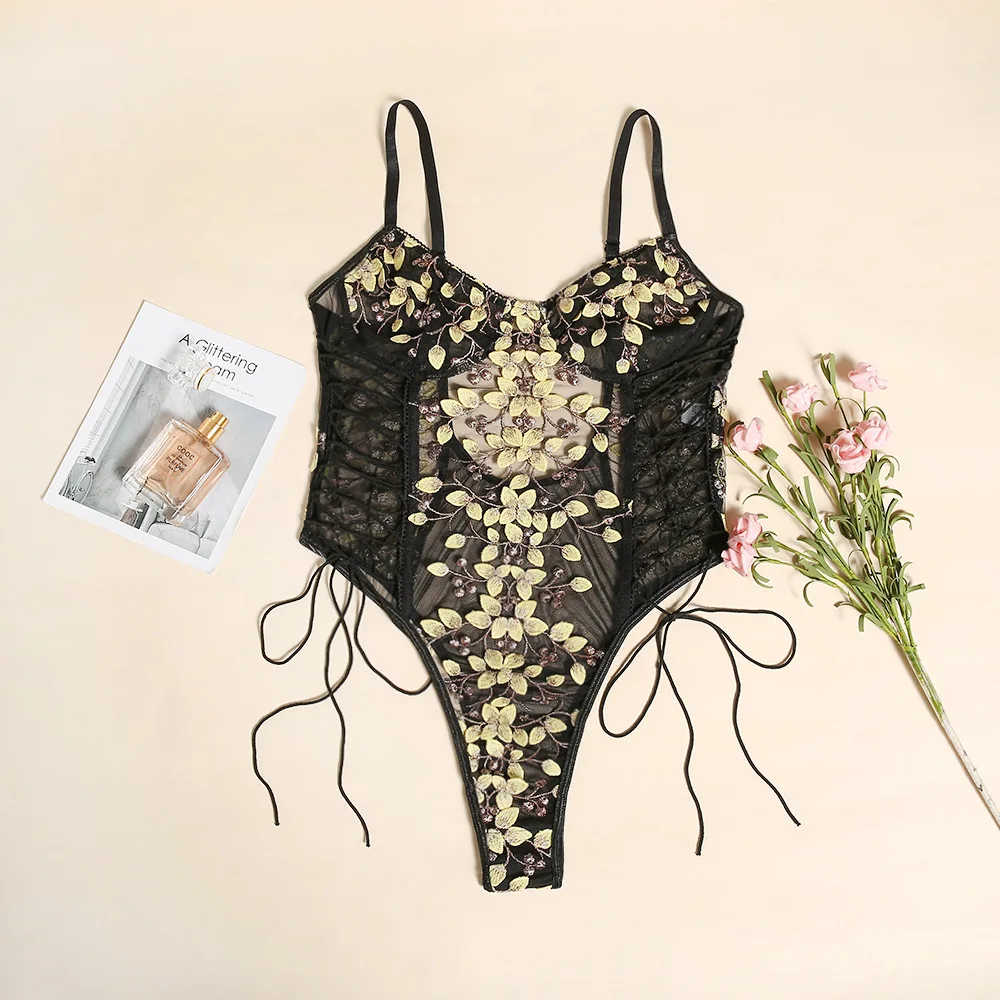 Ellolace Floral Embroidery Bodysuit Women Lace Up Bandage Bodies Sexy Sleeveless Bodycon Transparent Lingerie Mesh Bodysuits Top