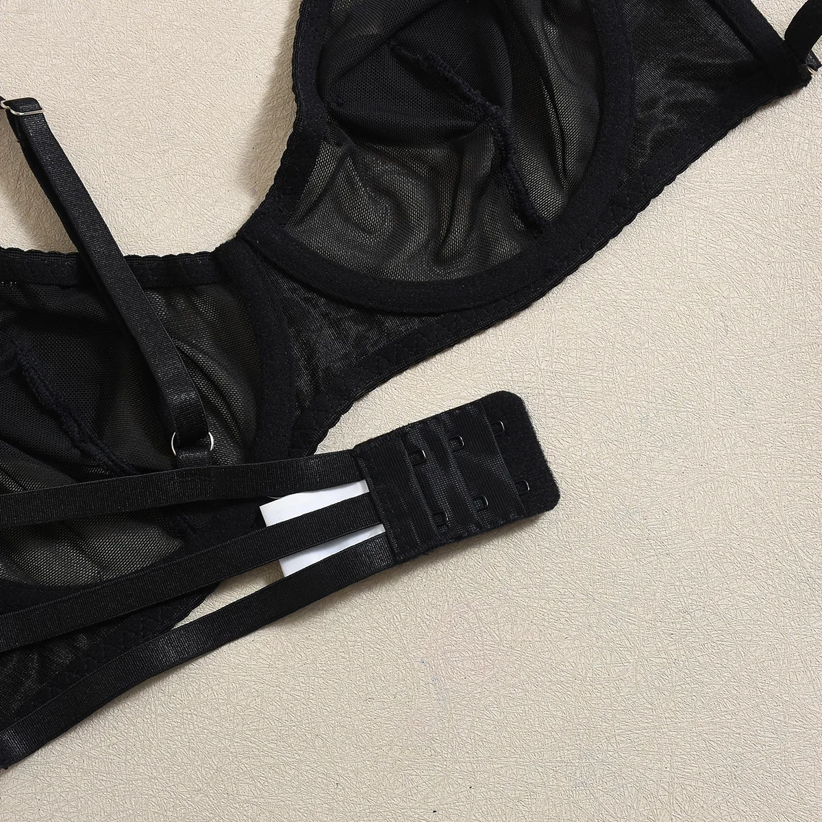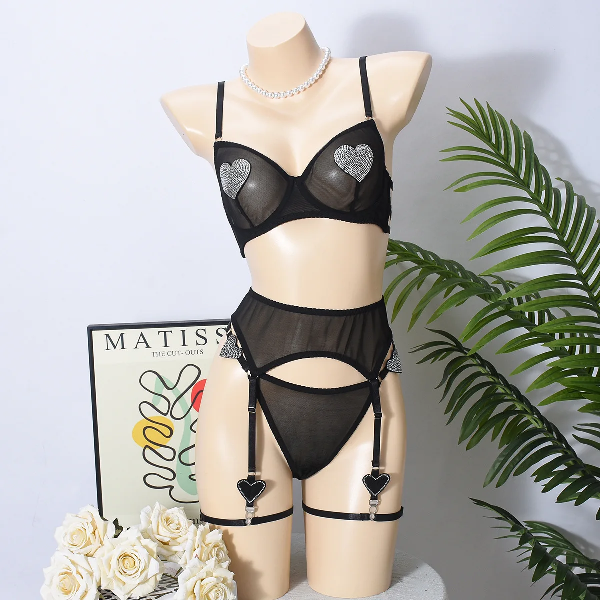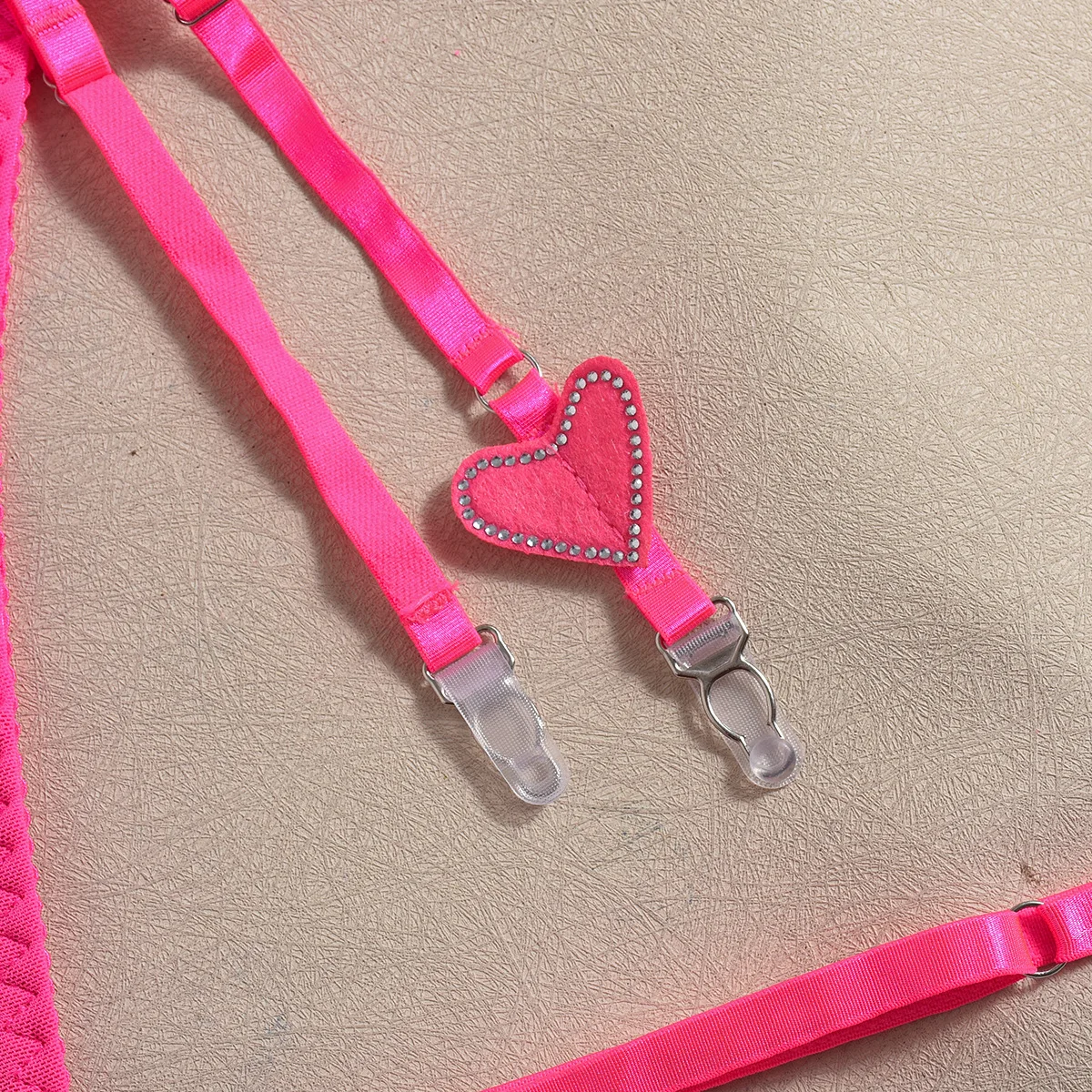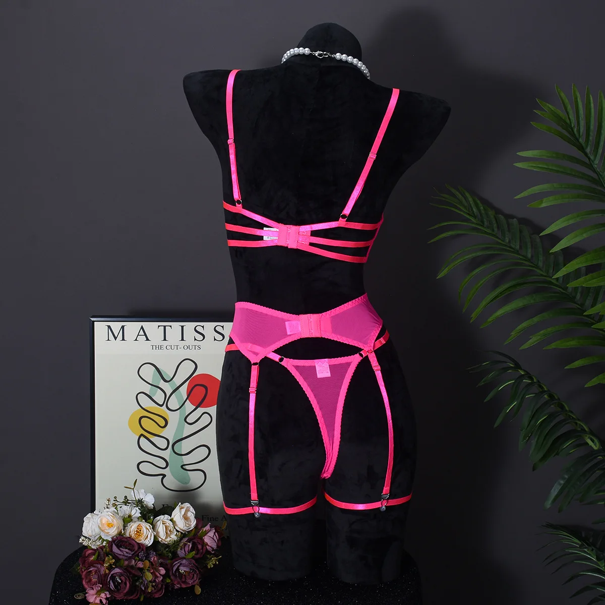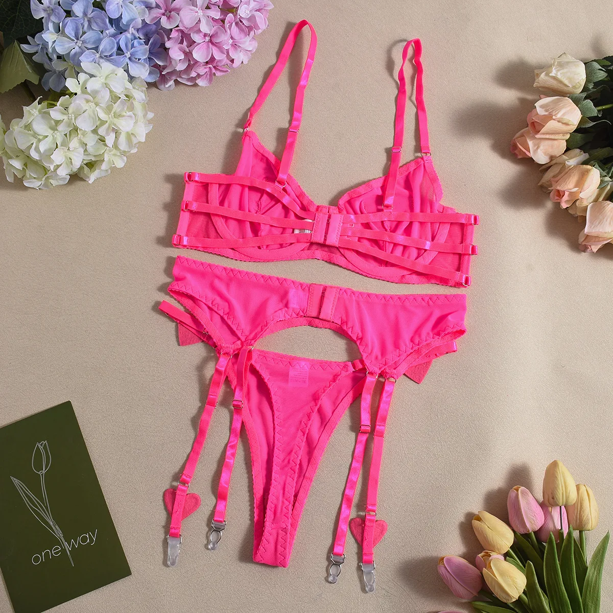 Ellolace Neon Fancy Daring Lingerie For Women Heart Rhinestone 3-Piece Mesh Female Underwear Sexy Erotic Youth Outfits