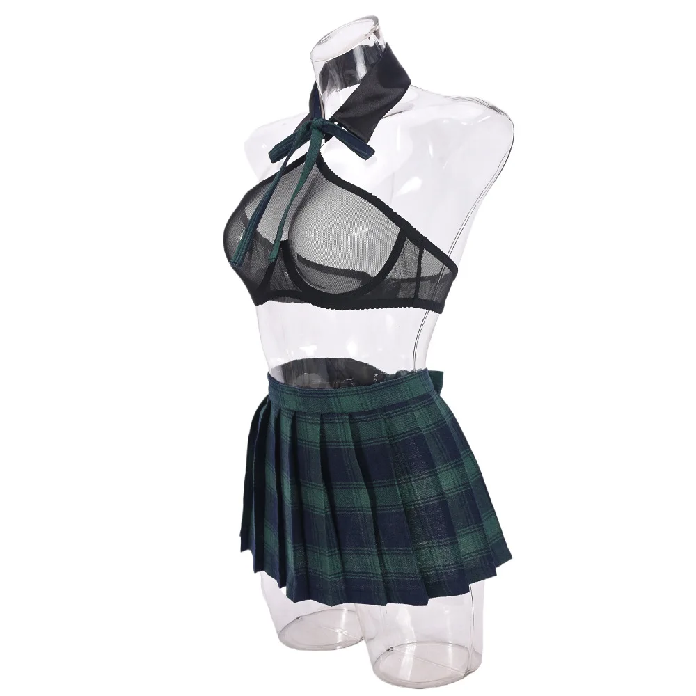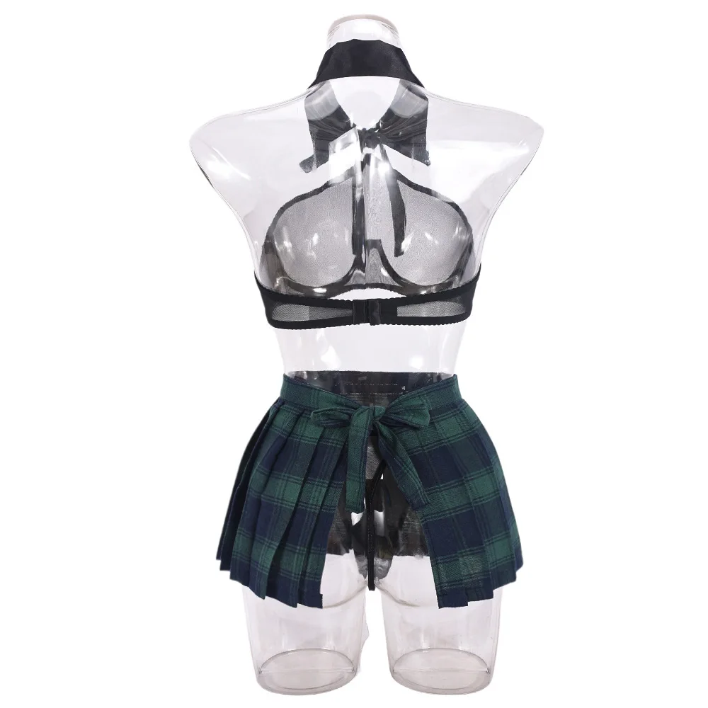 Ellolace Students Cosplay Lingerie Green Plaid Skirt Ultra Hot Halter Bra Transparent Necktie g-String Thongs Ensemble Lingeries