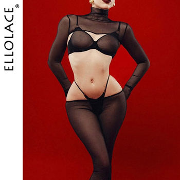 Ellolace Elegant Bodysuit Sleeveless Sexy Long Body Thong 2PC with Gloves Exclusive Mesh Pattern See Through Zip Female Clothing